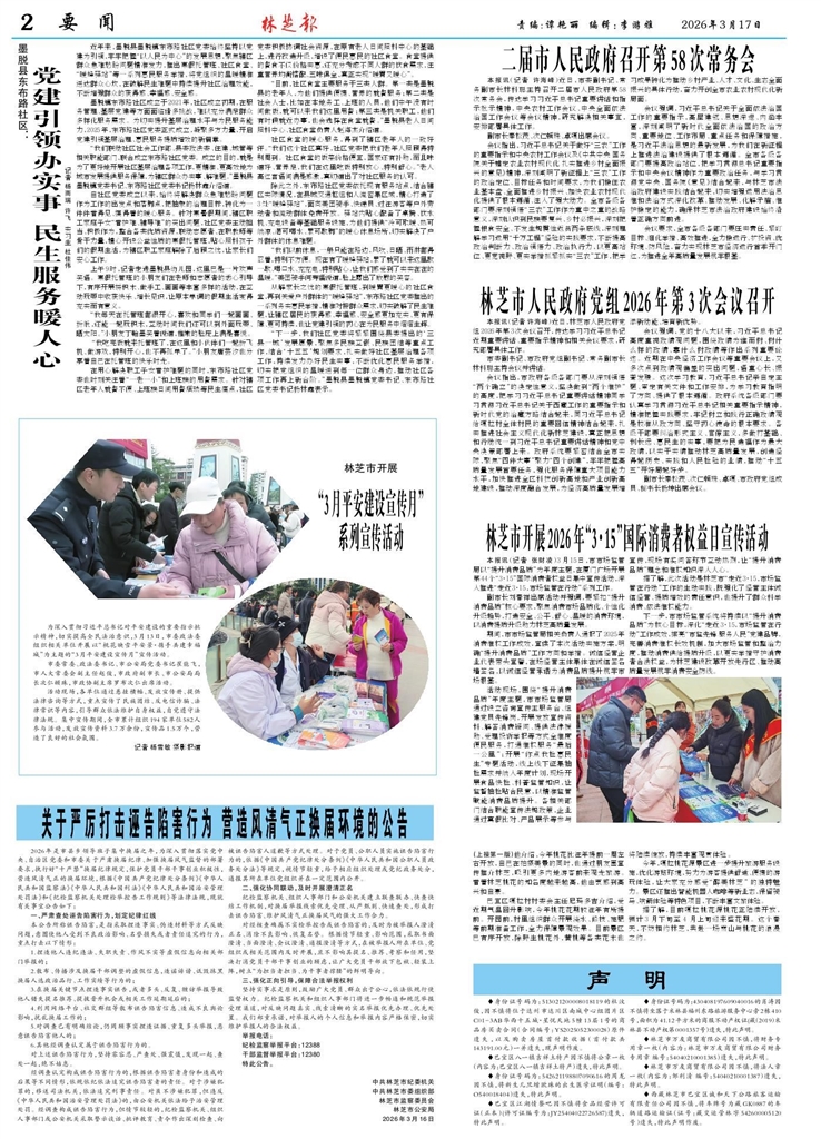 <div style='font-size: 22px!important;line-height: 34px!important;text-align: justify!important;color: #000!important'>林芝市开展2026年“3·15”国际消费者权益日宣传活动</div><div style='font-size: 14px!important;line-height: 22px!important;text-align: left!important;color: #777!important;margin-top: 20px;'>林芝报-汉文版  2026-03-17</div><div><img id='paperImg' style='max-width: 100%;height: auto' src='//img.founderfx.cn/epaper/202603/17/328de85525254eb18fa99c1fb044c70b/2.jpg' alt='' class='page-img'/></div><div style='font-size: 14px!important;line-height: 22px!important;text-align: center!important;color: #777!important;'><img src='//img.founderfx.cn/epaper/202603/17/328de85525254eb18fa99c1fb044c70b/02/111098_tanyl_1773629667218_s.jpg'style='display: block!important;margin: auto!important;max-width: 100%!important;'/></div><p>本报讯(记者 张财凌)3月15日,市市场监管局以“提升消费品质”为年度主题,在厦门广场开展第44个“3·15”国际消费者权益日集中宣传活动,深入推进“走近3·15,市场监管在行动”系列工作。</p><p>副市长刘春祥出席活动并强调,要紧扣“提升消费品质”核心要求,聚焦消费市场品质化、个性化升级趋势,打造安全、公平、舒心、温暖的消费环境,以消费提质升级助力林芝高质量发展。</p><p>期间,市市场监管局相关负责人通报了2025年消费维权工作成效,宣读了本次活动实施方案,明确“提升消费品质”工作方向和举措。诚信经营企业代表带头宣誓,在场经营主体集体在诚信签名墙签名,以诚信经营承诺为消费品质提升筑牢市场根基。</p><p>活动现场,围绕“提升消费品质”年度主题,市市场监管局通过设立咨询宣传主服务台、组建党员先锋岗,开展发放宣传资料、解答消费疑问、提供法律援助、受理投诉举报等方式全维度便民服务,打通维权服务“最后一公里”;开展“你点我检惠民生”专题活动,线上线下征集抽检需求并纳入年度计划,现场开展食品快检、科普监管知识,让监督抽检贴合民意,以精准监管赋能消费品质提升。各相关部门结合职能宣传法规政策,企业通过真假比对、产品展示等参与宣传,现场有奖问答环节互动热烈,让“提升消费品质”理念和维权知识深入人心。</p><p>据了解,此次活动是林芝市“走近3·15,市场监管在行动”工作的生动实践,既强化了经营主体诚信经营、提质增效的责任意识,也提升了群众科学消费、依法维权能力。</p><p>下一步,市市场监管系统将持续以“提升消费品质”为核心目标,深化“走近3·15,市场监管在行动”工作成效,擦亮“市监先锋 服务人民”党建品牌,完善消费维权长效机制,加大市场监管和整治力度,推动消费供给提质升级,以更实举措守护消费者合法权益,为林芝建设改革开放先行区、推动高质量发展筑牢消费安全防线。</p>