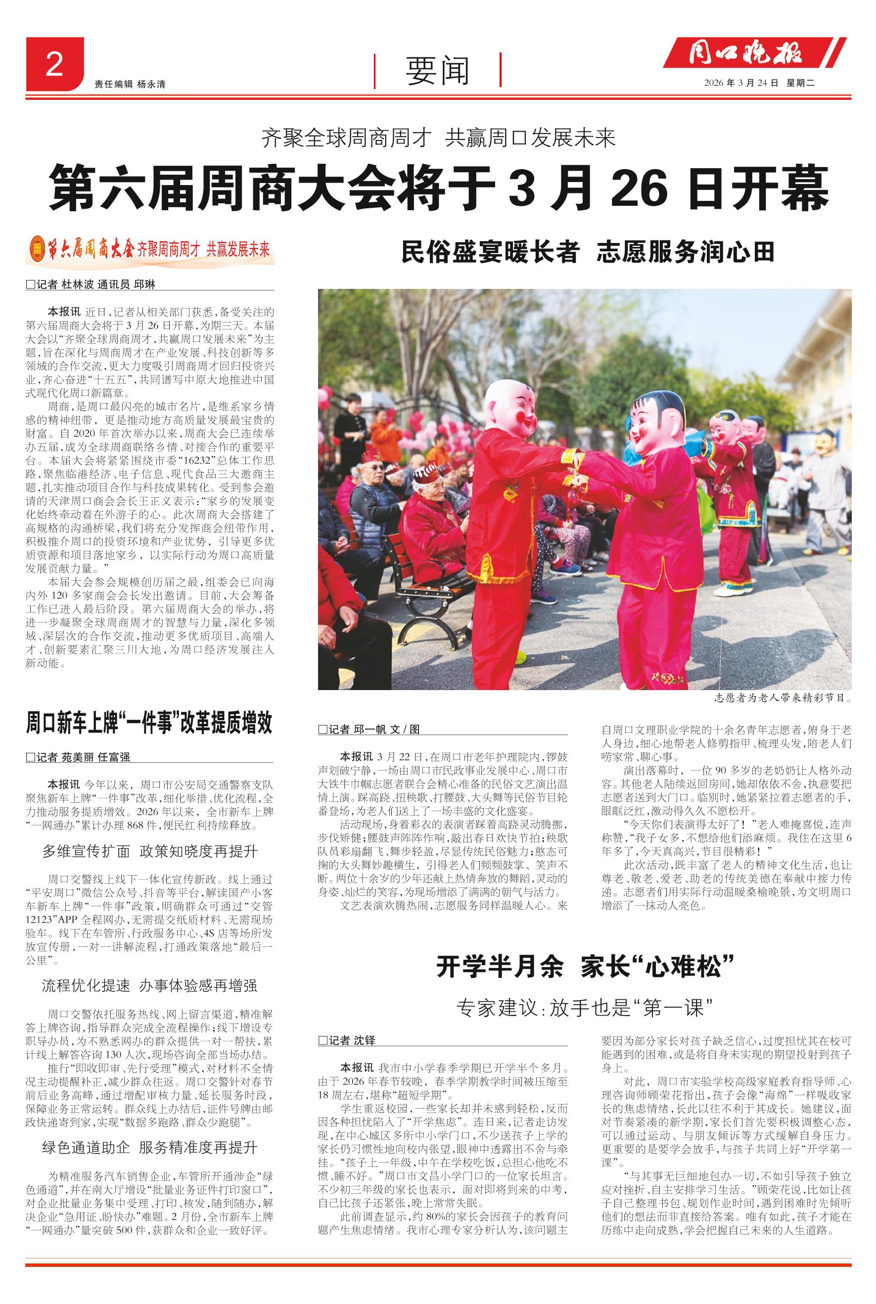 <div style='font-size: 22px!important;line-height: 34px!important;text-align: justify!important;color: #000!important'>周口新车上牌“一件事”改革提质增效</div><div style='font-size: 14px!important;line-height: 22px!important;text-align: left!important;color: #777!important;margin-top: 20px;'>周口晚报  2026-03-24</div><div><img id='paperImg' style='max-width: 100%;height: auto' src='//img.founderfx.cn/epaper/202603/24/25ca560ad38343af8e96de48905271e0/2.jpg' alt='' class='page-img'/></div><p> □记者 苑美丽 任富强 </p><p> 本报讯 今年以来,周口市公安局交通警察支队聚焦新车上牌“一件事”改革,细化举措、优化流程,全力推动服务提质增效。2026年以来,全市新车上牌“一网通办”累计办理868件,便民红利持续释放。</p><p> 多维宣传扩面 政策知晓度再提升 </p><p> </p><p> 周口交警线上线下一体化宣传新政。线上通过“平安周口”微信公众号、抖音等平台,解读国产小客车新车上牌“一件事”政策,明确群众可通过“交管12123”APP全程网办,无需提交纸质材料、无需现场验车。线下在车管所、行政服务中心、4S店等场所发放宣传册,一对一讲解流程,打通政策落地“最后一公里”。</p><p> 流程优化提速 办事体验感再增强 </p><p> </p><p> 周口交警依托服务热线、网上留言渠道,精准解答上牌咨询,指导群众完成全流程操作;线下增设专职导办员,为不熟悉网办的群众提供一对一帮扶,累计线上解答咨询130人次,现场咨询全部当场办结。</p><p> 推行“即收即审、先行受理”模式,对材料不全情况主动提醒补正,减少群众往返。周口交警针对春节前后业务高峰,通过增配审核力量、延长服务时段,保障业务正常运转。群众线上办结后,证件号牌由邮政快递寄到家,实现“数据多跑路、群众少跑腿”。</p><p> 绿色通道助企 服务精准度再提升 </p><p> </p><p> 为精准服务汽车销售企业,车管所开通涉企“绿色通道”,并在南大厅增设“批量业务证件打印窗口”,对企业批量业务集中受理、打印、核发,随到随办,解决企业“急用证、盼快办”难题。2月份,全市新车上牌“一网通办”量突破500件,获群众和企业一致好评。</p>