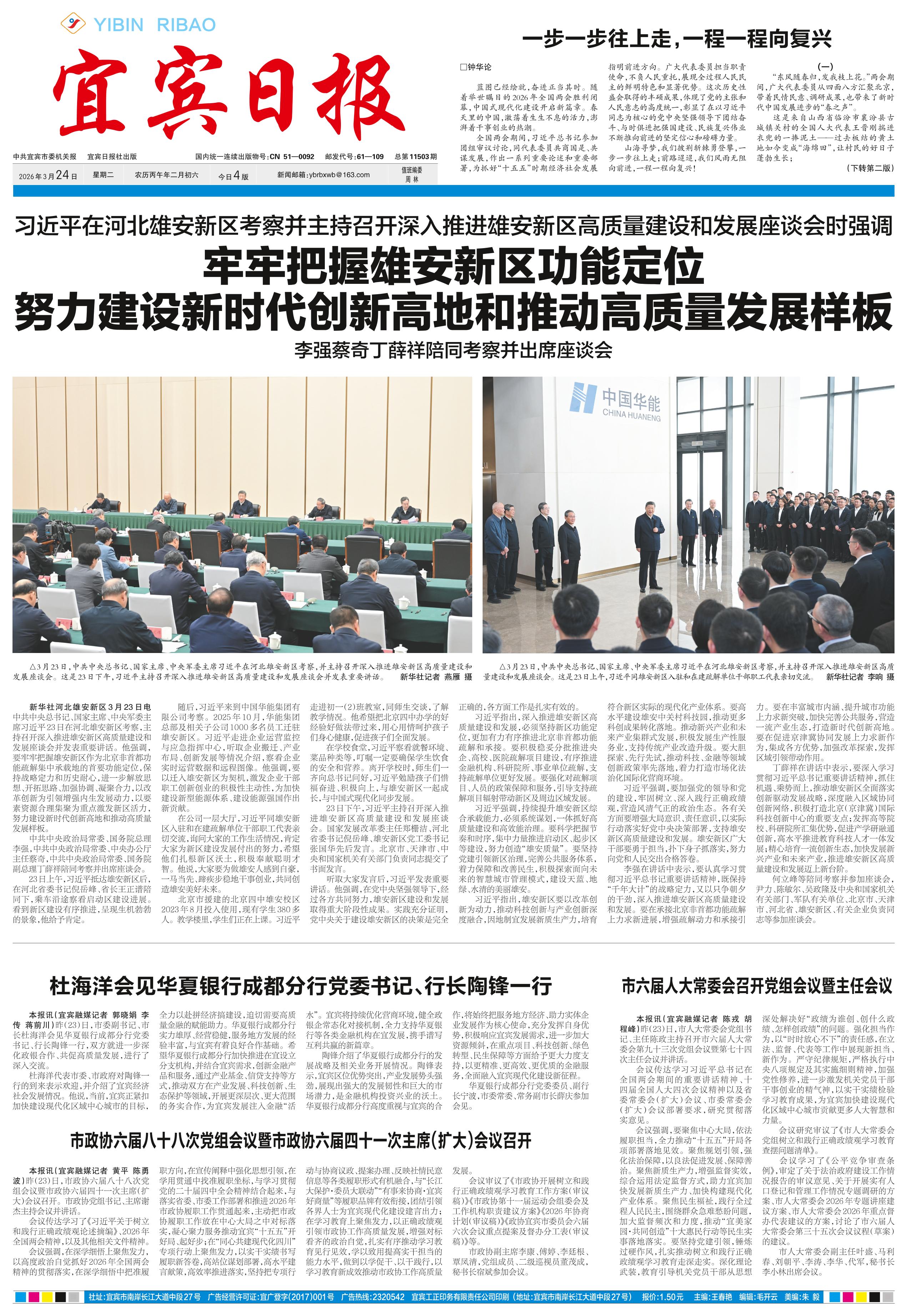 <div style='font-size: 16px!important;line-height: 28px!important;text-align: justify;color: #777!important;'>习近平在河北雄安新区考察并主持召开深入推进雄安新区高质量建设和发展座谈会时强调</div><div style='font-size: 22px!important;line-height: 34px!important;text-align: justify!important;color: #000!important'>牢牢把握雄安新区功能定位 努力建 设新时代创新高地和推动高质量发展样板</div><div style='font-size: 16px!important;line-height: 28px!important;text-align: justify;color: #777!important;margin-top: 20px;'>李强蔡奇丁薛祥陪同考察并出席座谈会</div><div style='font-size: 14px!important;line-height: 22px!important;text-align: left!important;color: #777!important;margin-top: 20px;'>宜宾日报  2026-03-24</div><div><img id='paperImg' style='max-width: 100%;height: auto' src='//img.founderfx.cn/epaper/202603/24/77f629ca403041a4953a9200410795d5/1.jpg' alt='' class='page-img'/></div><div style='font-size: 14px!important;line-height: 22px!important;text-align: center!important;color: #777!important;'><img src='//img.founderfx.cn/epaper/202603/24/77f629ca403041a4953a9200410795d5/A1/2378285_maoky_1774269173176_s.jpg'style='display: block!important;margin: auto!important;max-width: 100%!important;'/> △3月23日,中共中央总书记、国家主席、中央军委主席习近平在河北雄安新区考察,并主持召开深入推进雄安新区高质量建设和发展座谈会。这是23日上午,习近平同雄安新区入驻和在建疏解单位干部职工代表亲切交流。新华社记者 李响 摄<img src='//img.founderfx.cn/epaper/202603/24/77f629ca403041a4953a9200410795d5/A1/2378287_maoky_1774269404313_s.jpg'style='display: block!important;margin: auto!important;max-width: 100%!important;'/> △3月23日,中共中央总书记、国家主席、中央军委主席习近平在河北雄安新区考察,并主持召开深入推进雄安新区高质量建设和发展座谈会。这是23日下午,习近平主持召开深入推进雄安新区高质量建设和发展座谈会并发表重要讲话。新华社记者 燕雁 摄</div><p> 新华社河北雄安新区3月23日电 中共中央总书记、国家主席、中央军委主席习近平23日在河北雄安新区考察,主持召开深入推进雄安新区高质量建设和发展座谈会并发表重要讲话。他强调,要牢牢把握雄安新区作为北京非首都功能疏解集中承载地的首要功能定位,保持战略定力和历史耐心,进一步解放思想、开拓思路、加强协调、凝聚合力,以改革创新为引领增强内生发展动力,以要素资源合理集聚为重点激发新区活力,努力建设新时代创新高地和推动高质量发展样板。</p><p> 中共中央政治局常委、国务院总理李强,中共中央政治局常委、中央办公厅主任蔡奇,中共中央政治局常委、国务院副总理丁薛祥陪同考察并出席座谈会。</p><p> 23日上午,习近平抵达雄安新区后,在河北省委书记倪岳峰、省长王正谱陪同下,乘车沿途察看启动区建设进展。看到新区建设有序推进,呈现生机勃勃的景象,他给予肯定。</p><p> 随后,习近平来到中国华能集团有限公司考察。2025年10月,华能集团总部及相关子公司1000多名员工迁驻雄安新区。习近平走进企业运营监控与应急指挥中心,听取企业搬迁、产业布局、创新发展等情况介绍,察看企业实时运营数据和远程图像。他强调,要以迁入雄安新区为契机,激发企业干部职工创新创业的积极性主动性,为加快建设新型能源体系、建设能源强国作出新贡献。</p><p> 在公司一层大厅,习近平同雄安新区入驻和在建疏解单位干部职工代表亲切交流,询问大家的工作生活情况,肯定大家为新区建设发展付出的努力,希望他们扎根新区沃土,积极奉献聪明才智。他说,大家要为做雄安人感到自豪,一马当先、蹄疾步稳地干事创业,共同创造雄安美好未来。</p><p> 北京市援建的北京四中雄安校区2023年8月投入使用,现有学生380多人。教学楼里,学生们正在上课。习近平走进初一(2)班教室,同师生交谈,了解教学情况。他希望把北京四中办学的好经验好做法带过来,用心用情呵护孩子们身心健康,促进孩子们全面发展。</p><p> 在学校食堂,习近平察看就餐环境、菜品种类等,叮嘱一定要确保学生饮食的安全和营养。离开学校时,师生们一齐向总书记问好,习近平勉励孩子们惜福奋进、积极向上,与雄安新区一起成长,与中国式现代化同步发展。</p><p> 23日下午,习近平主持召开深入推进雄安新区高质量建设和发展座谈会。国家发展改革委主任郑栅洁、河北省委书记倪岳峰、雄安新区党工委书记张国华先后发言。北京市、天津市、中央和国家机关有关部门负责同志提交了书面发言。</p><p> 听取大家发言后,习近平发表重要讲话。他强调,在党中央坚强领导下,经过各方共同努力,雄安新区建设和发展取得重大阶段性成果。实践充分证明,党中央关于建设雄安新区的决策是完全正确的,各方面工作是扎实有效的。</p><p> 习近平指出,深入推进雄安新区高质量建设和发展,必须坚持新区功能定位,更加有力有序推进北京非首都功能疏解和承接。要积极稳妥分批推进央企、高校、医院疏解项目建设,有序推进金融机构、科研院所、事业单位疏解,支持疏解单位更好发展。要强化对疏解项目、人员的政策保障和服务,引导支持疏解项目辐射带动新区及周边区域发展。</p><p> 习近平强调,持续提升雄安新区综合承载能力,必须系统谋划,一体抓好高质量建设和高效能治理。要科学把握节奏和时序,集中力量推进启动区、起步区等建设,努力创造“雄安质量