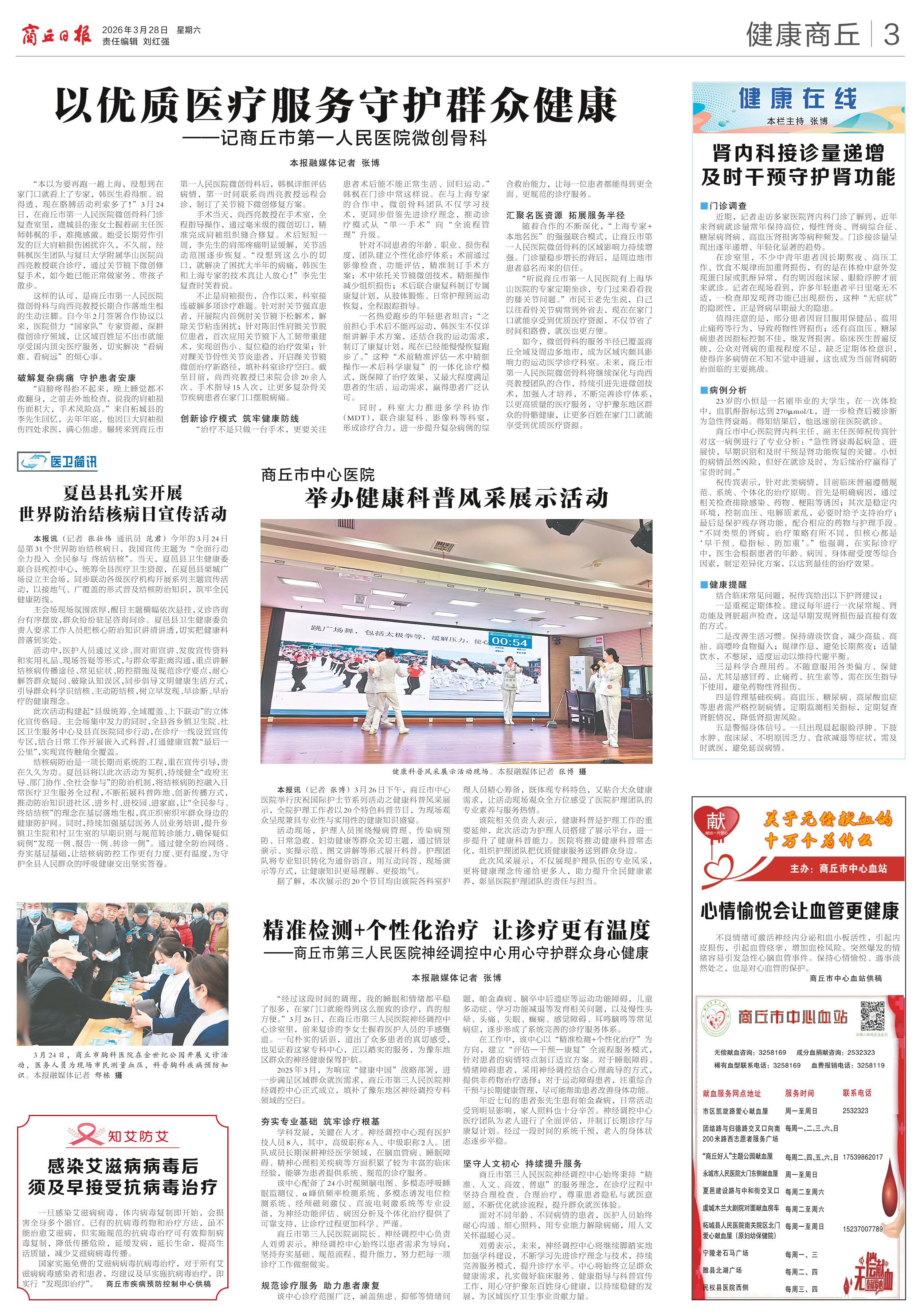 <div style='font-size: 22px!important;line-height: 34px!important;text-align: justify!important;color: #000!important'>肾内科接诊量递增及时干预守护肾功能</div><div style='font-size: 14px!important;line-height: 22px!important;text-align: left!important;color: #777!important;margin-top: 20px;'>商丘日报云阅读  2026-03-28</div><div><img id='paperImg' style='max-width: 100%;height: auto' src='//img.founderfx.cn/epaper/202603/28/50f0769f71144f7abc42b42489492fc3/3.jpg' alt='' class='page-img'/></div><p> ■门诊调查</p><p> 近期,记者走访多家医院肾内科门诊了解到,近年来肾病就诊量常年保持高位,慢性肾炎、肾病综合征、糖尿病肾病、高血压肾损害等病种频发。门诊接诊量呈现出逐年递增、年轻化显著的趋势。</p><p> 在诊室里,不少中青年患者因长期熬夜、高压工作、饮食不规律而加重肾损伤,有的是在体检中意外发现蛋白尿或肌酐异常,有的则因泡沫尿、眼睑浮肿才前来就诊。记者在现场看到,许多年轻患者平日里毫无不适,一检查却发现肾功能已出现损伤,这种“无症状”的隐匿性,正是肾病早期最大的隐患。</p><p> 值得注意的是,部分患者因盲目服用保健品、滥用止痛药等行为,导致药物性肾损伤;还有高血压、糖尿病患者因指标控制不佳,继发肾损害。临床医生普遍反映,公众对肾病的重视程度不足,缺乏定期体检意识,使得许多病情在不知不觉中进展,这也成为当前肾病防治面临的主要挑战。</p><p> ■病例分析</p><p> 23岁的小恒是一名刚毕业的大学生,在一次体检中,血肌酐指标达到270μmol/L,进一步检查后被诊断为急性肾衰竭。得知结果后,他迅速前往医院就诊。</p><p> 商丘市中心医院肾内科主任、副主任医师祝传宾针对这一病例进行了专业分析:“急性肾衰竭起病急、进展快,早期识别和及时干预是肾功能恢复的关键。小恒的病情虽然凶险,但好在就诊及时,为后续治疗赢得了宝贵时间。”</p><p> 祝传宾表示,针对此类病情,目前临床普遍遵循规范、系统、个体化的治疗原则。首先是明确病因,通过相关检查排除感染、药物、梗阻等诱因;其次是稳定内环境,控制血压、电解质紊乱,必要时给予支持治疗;最后是保护残存肾功能,配合相应的药物与护理手段。“不同类型的肾病,治疗策略有所不同,但核心都是‘早干预、稳指标、防加重’。”他强调,在实际诊疗中,医生会根据患者的年龄、病因、身体耐受度等综合因素,制定差异化方案,以达到最佳的治疗效果。</p><p> ■健康提醒</p><p> 结合临床常见问题,祝传宾给出以下护肾建议:</p><p> 一是重视定期体检。建议每年进行一次尿常规、肾功能及肾脏超声检查,这是早期发现肾损伤最直接有效的方式。</p><p> 二是改善生活习惯。保持清淡饮食,减少高盐、高油、高嘌呤食物摄入;规律作息,避免长期熬夜;适量饮水,不憋尿,适度运动以维持代谢平衡。</p><p> 三是科学合理用药。不随意服用各类偏方、保健品,尤其是感冒药、止痛药、抗生素等,需在医生指导下使用,避免药物性肾损伤。</p><p> 四是管理基础疾病。高血压、糖尿病、高尿酸血症等患者需严格控制病情,定期监测相关指标,定期复查肾脏情况,降低肾损害风险。</p><p> 五是警惕身体信号。一旦出现晨起眼睑浮肿、下肢水肿、泡沫尿、不明原因乏力、食欲减退等症状,需及时就医,避免延误病情。</p>