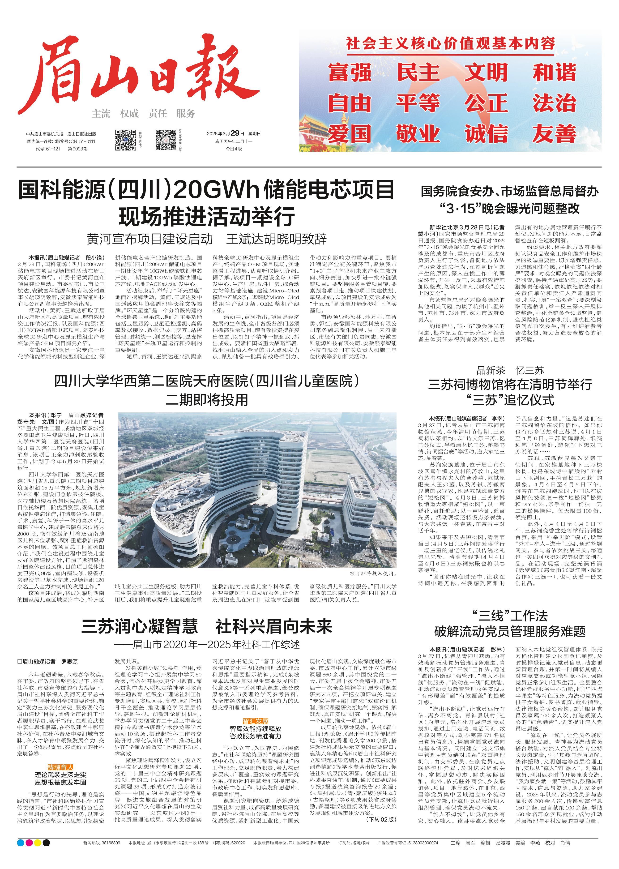 <div style='font-size: 22px!important;line-height: 34px!important;text-align: justify!important;color: #000!important'>国科能源(四川)20GWh储能电芯项目现场推进活动举行</div><div style='font-size: 16px!important;line-height: 28px!important;text-align: justify;color: #777!important;margin-top: 20px;'>黄河宣布项目建设启动 王斌达胡晓明致辞</div><div style='font-size: 14px!important;line-height: 22px!important;text-align: left!important;color: #777!important;margin-top: 20px;'>眉山日报  2026-03-29</div><div><img id='paperImg' style='max-width: 100%;height: auto' src='//img.founderfx.cn/epaper/202603/29/07637aa3a467481e81a698e7f4861e22/1.jpg' alt='' class='page-img'/></div><p> 本报讯(眉山融媒记者 段小锋)3月28日,国科能源(四川)20GWh储能电芯项目现场推进活动在眉山天府新区举行。市委书记黄河宣布项目建设启动。市委副书记、市长王斌达,安徽国科能源科技有限公司董事长胡晓明致辞,安徽熙泰智能科技有限公司副董事长赵铮涛出席。</p><p> 活动中,黄河、王斌达听取了眉山天府新区抓高质量项目、增有效投资工作情况汇报,以及国科能源(四川)20GWh储能电芯项目、熙泰科技全球IC研发中心及显示模组生产与终端产品OEM项目情况介绍。</p><p> 安徽国科能源是一家专注于电化学储能领域的科技型制造企业,深耕储能电芯全产业链研发制造。国科能源(四川)20GWh储能电芯项目一期建设年产10GWh磷酸铁锂电芯产线,二期建设10GWh磷酸铁锂电芯产线、电池PACK线及研发中心。</p><p> 活动结束后,举行了“环天星座”地面站揭牌活动。黄河、王斌达及中国遥感应用协会副理事长徐文等揭牌。“环天星座”是一个分阶段构建的全球遥感卫星系统,地面站主要功能包括卫星跟踪、卫星遥控遥测、高码率数据接收、数据记录与交互、站控管理、时频统一、测试标校等,是支撑“环天星座”在轨卫星运行和控制的重要枢纽。</p><p> 随后,黄河、王斌达还来到熙泰科技全球IC研发中心及显示模组生产与终端产品OEM项目现场,实地察看工程进展,认真听取情况介绍。据了解,该项目一期建设全球IC研发中心、生产厂房、配件厂房、综合动力站等基础设施,建设Micro-Oled模组生产线2条;二期建设Micro-Oled模组生产线3条、OEM整机产线5条。</p><p> 活动中,黄河指出,项目是经济发展的生命线,全市各级各部门必须把抓高质量项目、增有效投资摆在突出位置,以钉钉子精神一抓到底、抓出成效。要紧扣国省重大战略部署,找准眉山融入全局的切入点和发力点,谋划储备一批具有战略牵引力、带动力和影响力的重点项目。要精准锁定产业链关键环节,聚焦我市“1+3”主导产业和未来产业主攻方向、细分赛道,加快引进一批补链强链项目。要坚持服务围着项目转、要素跟着项目走,推动项目快建快投、早见成效,以项目建设的实际成效为“十五五”高质量开局起步打下坚实基础。</p><p> 市级领导邹汝林、沙万强、车智勇、郭红,安徽国科能源科技有限公司常务副总裁朱利民,眉山天府新区、市级有关部门负责同志,安徽国科能源科技有限公司、安徽熙泰智能科技有限公司有关负责人和施工单位代表等参加相关活动。</p>
