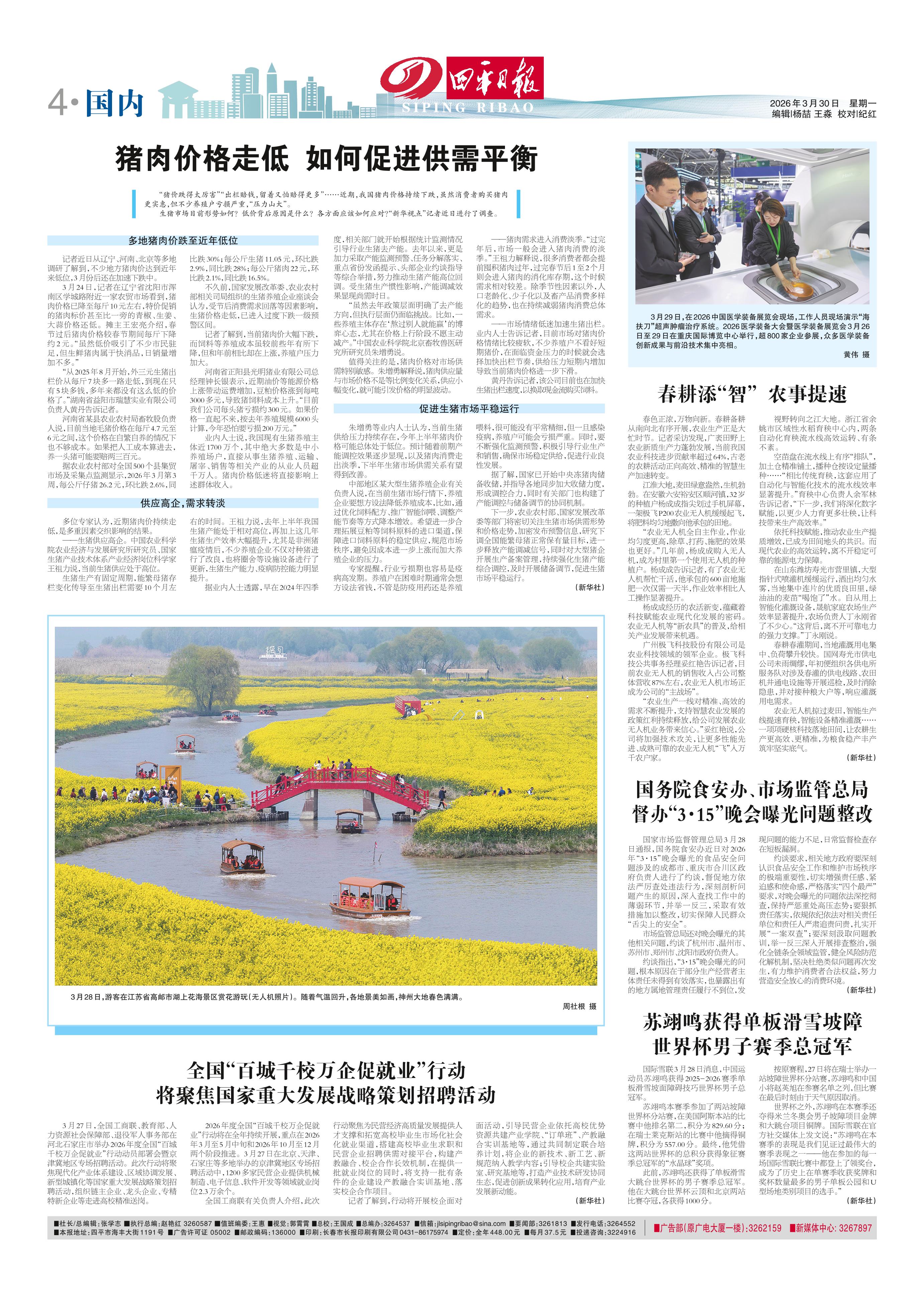 <div style='font-size: 22px!important;line-height: 34px!important;text-align: justify!important;color: #000!important'>猪肉价格走低 如何促进供需平衡</div><div style='font-size: 14px!important;line-height: 22px!important;text-align: left!important;color: #777!important;margin-top: 20px;'>四平日报  2026-03-30</div><div><img id='paperImg' style='max-width: 100%;height: auto' src='//img.founderfx.cn/epaper/202603/30/c9aa1754b0d44fbb940bcb173984cc42/4.jpg' alt='' class='page-img'/></div><p> “猪价跌得太厉害”“出栏赔钱,留着又怕赔得更多”……近期,我国猪肉价格持续下跌,虽然消费者购买猪肉更实惠,但不少养殖户亏损严重,“压力山大”。</p><p> 生猪市场目前形势如何?低价背后原因是什么?各方面应该如何应对?“新华视点”记者近日进行了调查。</p><p> 多地猪肉价跌至近年低位</p><p> 记者近日从辽宁、河南、北京等多地调研了解到,不少地方猪肉价达到近年来低位,3月份后还在加速下跌中。</p><p> 3月24日,记者在辽宁省沈阳市浑南区学城路附近一家农贸市场看到,猪肉价格已降至每斤10元左右,特价促销的猪肉标价甚至比一旁的青椒、生姜、大蒜价格还低。摊主王宏亮介绍,春节过后猪肉价格较春节期间每斤下降约2元。“虽然低价吸引了不少市民驻足,但生鲜猪肉属于快消品,日销量增加不多。”</p><p> “从2025年8月开始,外三元生猪出栏价从每斤7块多一路走低,到现在只有5块多钱,多年来都没有这么低的价格了。”湖南省益阳市瑞慧实业有限公司负责人黄丹告诉记者。</p><p> 河南省某县农业农村局畜牧股负责人说,目前当地毛猪价格在每斤4.7元至6元之间,这个价格在自繁自养的情况下也不够成本。如果把人工成本算进去,养一头猪可能要赔两三百元。</p><p> 据农业农村部对全国500个县集贸市场及采集点监测显示,2026年3月第3周,每公斤仔猪26.2元,环比跌2.6%,同比跌30%;每公斤生猪11.05元,环比跌2.9%,同比跌28%;每公斤猪肉22元,环比跌2.1%,同比跌16.5%。</p><p> 不久前,国家发展改革委、农业农村部相关司局组织的生猪养殖企业座谈会认为,受节后消费需求回落等因素影响,生猪价格走低,已进入过度下跌一级预警区间。</p><p> 记者了解到,当前猪肉价大幅下跌,而饲料等养殖成本虽较前些年有所下降,但和年前相比却在上涨,养殖户压力加大。</p><p> 河南省正阳县光明猪业有限公司总经理钟长银表示,近期油价等能源价格上涨带动运费增加,豆粕价格涨到每吨3000多元,导致猪饲料成本上升。“目前我们公司每头猪亏损约300元。如果价格一直起不来,按去年养殖规模6000头计算,今年恐怕要亏损200万元。”</p><p> 业内人士说,我国现有生猪养殖主体近1700万个,其中绝大多数是中小养殖场户,直接从事生猪养殖、运输、屠宰、销售等相关产业的从业人员超千万人。猪肉价格低迷将直接影响上述群体收入。</p><p> 供应高企,需求转淡</p><p> 多位专家认为,近期猪肉价持续走低,是多重因素交织影响的结果。</p><p> ——生猪供应高企。中国农业科学院农业经济与发展研究所研究员、国家生猪产业技术体系产业经济岗位科学家王祖力说,当前生猪供应处于高位。</p><p> 生猪生产有固定周期,能繁母猪存栏变化传导至生猪出栏需要10个月左右的时间。王祖力说,去年上半年我国生猪产能处于相对高位,再加上这几年生猪生产效率大幅提升,尤其是非洲猪瘟疫情后,不少养殖企业不仅对种猪进行了改良,也将圈舍等设施设备进行了更新,生猪生产能力、疫病防控能力明显提升。</p><p> 据业内人士透露,早在2024年四季</p><p> 度,相关部门就开始根据统计监测情况引导行业生猪去产能。去年以来,更是加力采取产能监测预警、任务分解落实、重点省份发函提示、头部企业约谈指导等综合举措,努力推动生猪产能高位回调。受生猪生产惯性影响,产能调减效果显现尚需时日。</p><p> “虽然去年政策层面明确了去产能方向,但执行层面仍面临挑战。比如,一些养殖主体存在‘熬过别人就能赢’的博弈心态,尤其在价格上行阶段不愿主动减产。”中国农业科学院北京畜牧兽医研究所研究员朱增勇说。</p><p> 值得关注的是,猪肉价格对市场供需特别敏感。朱增勇解释说,猪肉供应量与市场价格不是等比例变化关系,供应小幅变化,就可能引发价格的明显波动。</p><p> ——猪肉需求进入消费淡季。“过完年后,市场一般会进入猪肉消费的淡季。”王祖力解释说,很多消费者都会提前囤积猪肉过年,过完春节后1至2个月则会进入猪肉的消化库存期,这个时候需求相对较差。除季节性因素以外,人口老龄化、少子化以及畜产品消费多样化的趋势,也在持续减弱猪肉消费总体需求。</p><p> ——市场情绪低迷加速生猪出栏。业内人士告诉记者,目前市场对猪肉价格情绪比较疲软,不少养殖户不看好短期猪价,在面临资金压力的时候就会选择加快出栏节奏,供给压力短期内增加导致当前猪肉价格进一步下滑。</p><p> 黄丹告诉记者,该公司目前也在加快生猪出栏速度,以换取现金流购买饲料。</p><p> 促进生猪市场平稳运行</p><p> 朱增勇等业内人士认为,当前生猪供给压力持续存在,今年上半年猪肉价格可能总体处于低位。预计随着前期产能调控效果逐步显现,以及猪肉消费走出淡季,下半年生猪市场供需关系有望得到改善。</p><p> 中部地区某大型生猪养殖企业有关负责人说,在当前生猪市场行情下,养殖企业要想方设法降低养殖成本,