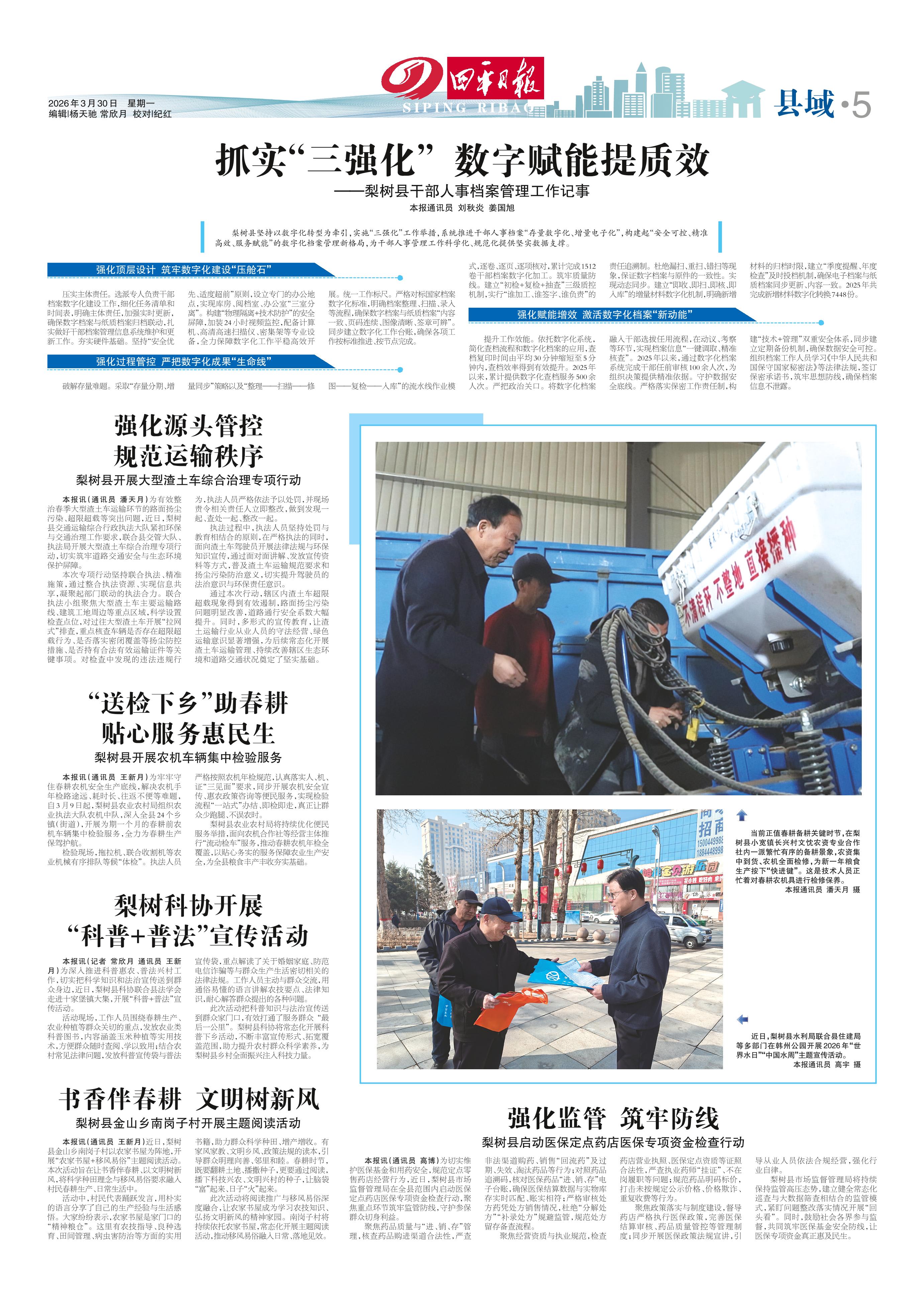 <div style='font-size: 22px!important;line-height: 34px!important;text-align: justify!important;color: #000!important'>梨树科协开展 “科普+普法”宣传活动</div><div style='font-size: 14px!important;line-height: 22px!important;text-align: left!important;color: #777!important;margin-top: 20px;'>四平日报  2026-03-30</div><div><img id='paperImg' style='max-width: 100%;height: auto' src='//img.founderfx.cn/epaper/202603/30/c9aa1754b0d44fbb940bcb173984cc42/5.jpg' alt='' class='page-img'/></div><p> 本报讯(记者 常欣月 通讯员 王新月)为深入推进科普惠农、普法兴村工作,切实把科学知识和法治宣传送到群众身边,近日,梨树县科协联合县法学会走进十家堡镇大集,开展“科普+普法”宣传活动。</p><p> 活动现场,工作人员围绕春耕生产、农业种植等群众关切的重点,发放农业类科普图书,内容涵盖玉米种植等实用技术,方便群众随时查阅、学以致用;结合农村常见法律问题,发放科普宣传袋与普法宣传袋,重点解读了关于婚姻家庭、防范电信诈骗等与群众生产生活密切相关的法律法规。工作人员主动与群众交流,用通俗易懂的语言讲解农技要点、法律知识,耐心解答群众提出的各种问题。</p><p> 此次活动把科普知识与法治宣传送到群众家门口,有效打通了服务群众 “最后一公里”。梨树县科协将常态化开展科普下乡活动,不断丰富宣传形式、拓宽覆盖范围,助力提升农村群众科学素养,为梨树县乡村全面振兴注入科技力量。</p>