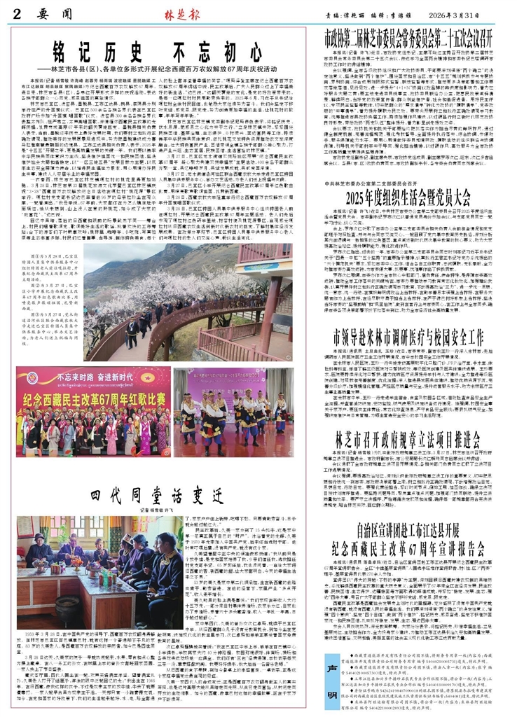 <div style='font-size: 22px!important;line-height: 34px!important;text-align: justify!important;color: #000!important'>四代同堂话变迁</div><div style='font-size: 14px!important;line-height: 22px!important;text-align: left!important;color: #777!important;margin-top: 20px;'>林芝报-汉文版  2026-03-31</div><div><img id='paperImg' style='max-width: 100%;height: auto' src='//img.founderfx.cn/epaper/202603/31/613069ac43214f44a55bcace1fb76553/2.jpg' alt='' class='page-img'/></div><div style='font-size: 14px!important;line-height: 22px!important;text-align: center!important;color: #777!important;'><img src='//img.founderfx.cn/epaper/202603/31/613069ac43214f44a55bcace1fb76553/02/111598_tanyl_1774838685873_s.jpg'style='display: block!important;margin: auto!important;max-width: 100%!important;'/></div><p>记者 杨雪敏 许飞</p><p>1959 年 3 月 28 日,在中国共产党的领导下,西藏百万农奴翻身得解放。在林芝市巴宜区百巴镇章巴村,就有这样一个普通却不平凡的家庭。83 岁的久美老人,是西藏百万农奴解放的亲历者,如今已是四世同堂。</p><p>3月 28 日这天,久美家的院子一早就热闹起来,水果、零食和点心整齐摆上藏桌。在八一务工的孙女、在城里上学的曾孙女都赶回家团圆,一家人换上了节日盛装。</p><p>藏式客厅里,四代人围坐在一起,欢声笑语满室洋溢。望着满堂儿孙,久美老人打开了话匣子,浑浊的眼中泛起回忆的光:“我出生在 1946 年。在旧西藏,像我这样的孩子,不过是奴隶主家的放牛娃,牛丢了就要遭毒打。一家人起早贪黑为奴隶主干活,一天却只有一小碗青稞充饥。如今,在党和国家的好政策下,我们的生活越来越好,水、电、路全都通了,家家户户住上新房,吃喝不愁。只要肯勤劳奋斗,日子就会越过越红火。”</p><p> 民主改革后,久美一家分到了 15 头牦牛,这是家中第一笔真正属于自己的 “财产”。沐浴着党的光辉,久美于 1970 年光荣加入中国共产党,后来还当选村干部。他时常叮嘱后辈,没有共产党,就没有这个家。</p><p>久美望着屋中正中央的领袖像感慨道:“我从前只是个放牛娃,是党和国家培养了我,乡亲们信任我,选我担任村党支部书记。65 岁卸任后,我也没闲着,一直给大家讲旧西藏的苦、新西藏的甜,让大家都明白,今天的幸福生活来之不易。”</p><p> 53岁的美久是家中第二代顶梁柱,生在新西藏的他踏实肯干、勤劳奋进。在他的经营下,家里产业 “多点开花”,收入连年增长。</p><p> 美久黝黑的脸上满是喜悦:“我们家现在年收入大约十五万元,一部分来自村集体养猪场、农家乐分红,自家也办了养猪场,养着六十多头藏香猪,收入一年比一年高,日子越过越舒心。”</p><p> 家中第四代、久美的曾孙女次仁卓玛,就读于巴宜区中学。从旧西藏群众几乎没有受教育机会,到如今坐在宽敞明亮、设施现代化的教室里学习,次仁卓玛和弟弟正享受着国家免费教育的温暖。</p><p> 次仁卓玛腼腆地笑着说:“我在巴宜区中学上学,弟弟在百巴镇中心小学读书,学校离家大约 40 分钟路程。校园环境很好,体育场、操场和各类球类运动场地一应俱全。我们还有‘三包’经费保障,学校饭菜每天三菜一汤,荤素搭配均衡。我要好好读书,长大后当一名音乐老师。”</p><p> 从旧西藏的食不果腹,到如今餐桌上的丰盛富足,一桌饭菜,正是这个家庭幸福变迁最直观的见证。</p><p> 久美一家四代人的命运变迁,正是西藏百万农奴翻身做主人的真实写照,也是这片高原大地从黑暗走向光明、从贫穷走向富裕、从封闭走向开放的生动缩影。如今的西藏,像章巴村这样的幸福故事,正在千家万户不断续写。</p>
