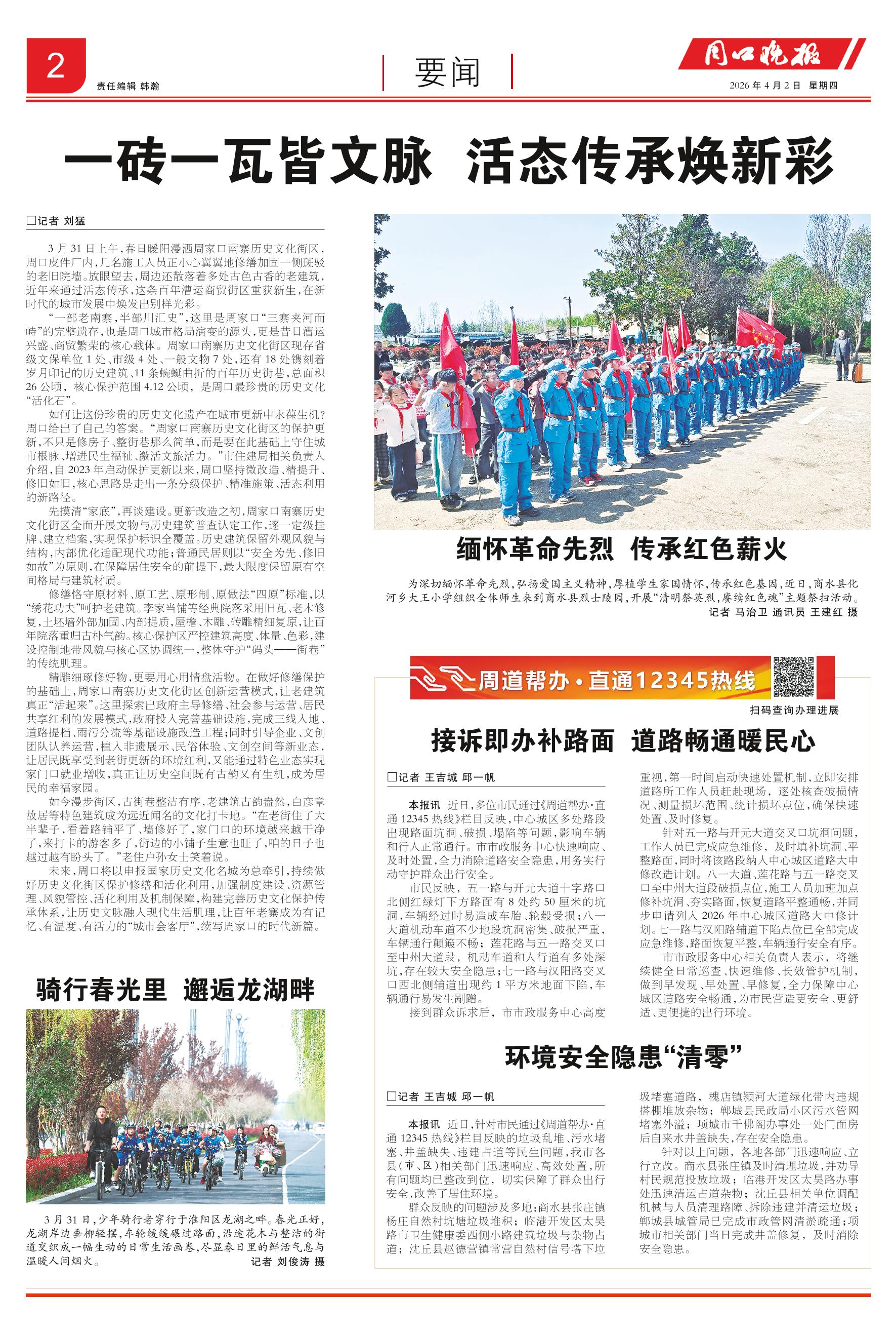 <div style='font-size: 22px!important;line-height: 34px!important;text-align: justify!important;color: #000!important'>骑行春光里 邂逅龙湖畔</div><div style='font-size: 14px!important;line-height: 22px!important;text-align: left!important;color: #777!important;margin-top: 20px;'>周口晚报  2026-04-02</div><div><img id='paperImg' style='max-width: 100%;height: auto' src='//img.founderfx.cn/epaper/202604/01/916c38b5383242078926a6b3a7db9b91/2.jpg' alt='' class='page-img'/></div><div style='font-size: 14px!important;line-height: 22px!important;text-align: center!important;color: #777!important;'><img src='//img.founderfx.cn/epaper/202604/01/916c38b5383242078926a6b3a7db9b91/02/0c7ad9bf7c0d078cba701c172d6430f6_2_s.jpg'style='display: block!important;margin: auto!important;max-width: 100%!important;'/></div><p> 3月31日,少年骑行者穿行于淮阳区龙湖之畔。春光正好,龙湖岸边垂柳轻摆,车轮缓缓碾过路面,沿途花木与整洁的街道交织成一幅生动的日常生活画卷,尽显春日里的鲜活气息与温暖人间烟火。记者 刘俊涛 摄</p>