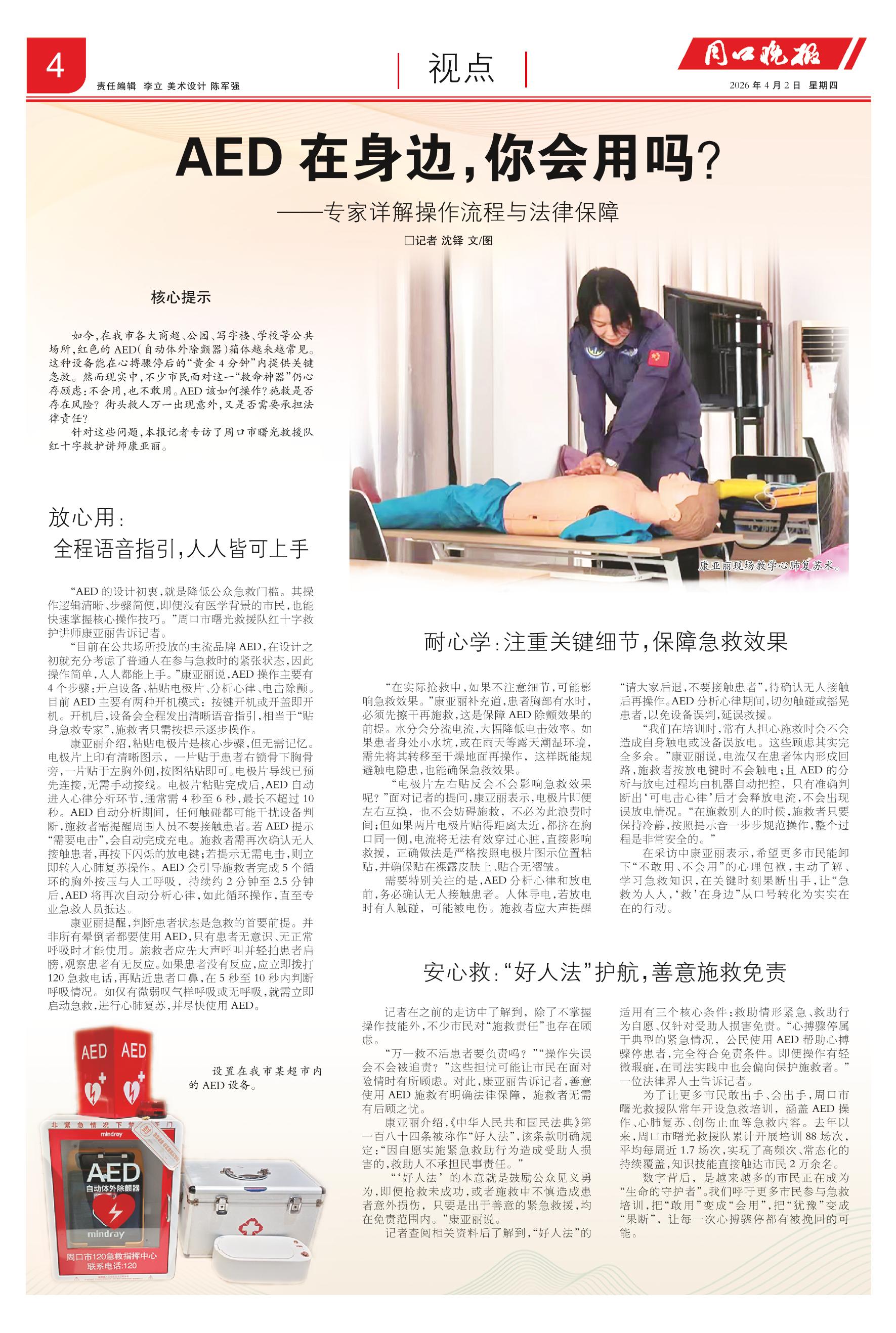 <div style='font-size: 22px!important;line-height: 34px!important;text-align: justify!important;color: #000!important'>AED在身边,你会用吗?</div><div style='font-size: 16px!important;line-height: 28px!important;text-align: justify;color: #777!important;margin-top: 20px;'>——专家详解操作流程与法律保障</div><div style='font-size: 14px!important;line-height: 22px!important;text-align: left!important;color: #777!important;margin-top: 20px;'>周口晚报  2026-04-02</div><div><img id='paperImg' style='max-width: 100%;height: auto' src='//img.founderfx.cn/epaper/202604/01/916c38b5383242078926a6b3a7db9b91/4.jpg' alt='' class='page-img'/></div><div style='font-size: 14px!important;line-height: 22px!important;text-align: center!important;color: #777!important;'><img src='//img.founderfx.cn/epaper/202604/01/916c38b5383242078926a6b3a7db9b91/04/615b77734bec1709e52d5c05ae67024f_s.jpg'style='display: block!important;margin: auto!important;max-width: 100%!important;'/> 康亚丽现场教学心肺复苏术。