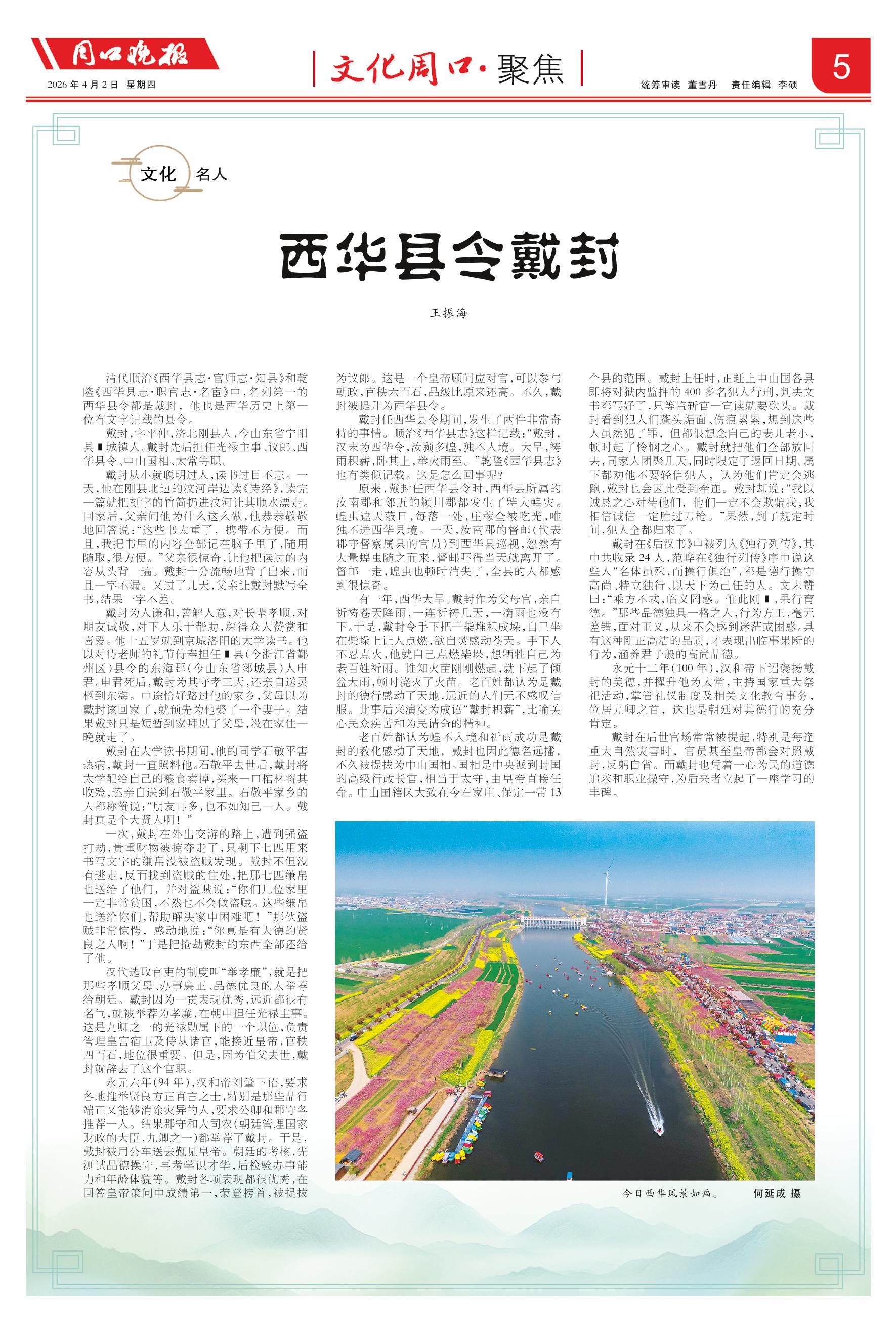 <div style='font-size: 22px!important;line-height: 34px!important;text-align: justify!important;color: #000!important'>西华县令戴封</div><div style='font-size: 16px!important;line-height: 28px!important;text-align: justify;color: #777!important;margin-top: 20px;'>王振海</div><div style='font-size: 14px!important;line-height: 22px!important;text-align: left!important;color: #777!important;margin-top: 20px;'>周口晚报  2026-04-02</div><div><img id='paperImg' style='max-width: 100%;height: auto' src='//img.founderfx.cn/epaper/202604/01/916c38b5383242078926a6b3a7db9b91/5.jpg' alt='' class='page-img'/></div><div style='font-size: 14px!important;line-height: 22px!important;text-align: center!important;color: #777!important;'><img src='//img.founderfx.cn/epaper/202604/01/916c38b5383242078926a6b3a7db9b91/05/43342917d6f25a8aa27291e9a40fe799_s.jpg'style='display: block!important;margin: auto!important;max-width: 100%!important;'/> 今日西华风景如画。 何延成 摄</div><p> 清代顺治《西华县志·官师志·知县》和乾隆《西华县志·职官志·名宦》中,名列第一的西华县令都是戴封,他也是西华历史上第一位有文字记载的县令。</p><p> 戴封,字平仲,济北刚县人,今山东省宁阳县堽城镇人。戴封先后担任光禄主事、议郎、西华县令、中山国相、太常等职。</p><p> 戴封从小就聪明过人,读书过目不忘。一天,他在刚县北边的汶河岸边读《诗经》,读完一篇就把刻字的竹简扔进汶河让其顺水漂走。回家后,父亲问他为什么这么做,他恭恭敬敬地回答说:“这些书太重了,携带不方便。而且,我把书里的内容全部记在脑子里了,随用随取,很方便。”父亲很惊奇,让他把读过的内容从头背一遍。戴封十分流畅地背了出来,而且一字不漏。又过了几天,父亲让戴封默写全书,结果一字不差。</p><p> 戴封为人谦和,善解人意,对长辈孝顺,对朋友诚敬,对下人乐于帮助,深得众人赞赏和喜爱。他十五岁就到京城洛阳的太学读书。他以对待老师的礼节侍奉担任鄮县(今浙江省鄞州区)县令的东海郡(今山东省郯城县)人申君。申君死后,戴封为其守孝三天,还亲自送灵柩到东海。中途恰好路过他的家乡,父母以为戴封该回家了,就预先为他娶了一个妻子。结果戴封只是短暂到家拜见了父母,没在家住一晚就走了。</p><p> 戴封在太学读书期间,他的同学石敬平害热病,戴封一直照料他。石敬平去世后,戴封将太学配给自己的粮食卖掉,买来一口棺材将其收殓,还亲自送到石敬平家里。石敬平家乡的人都称赞说:“朋友再多,也不如知己一人。戴封真是个大贤人啊!”</p><p> 一次,戴封在外出交游的路上,遭到强盗打劫,贵重财物被掠夺走了,只剩下七匹用来书写文字的缣帛没被盗贼发现。戴封不但没有逃走,反而找到盗贼的住处,把那七匹缣帛也送给了他们,并对盗贼说:“你们几位家里一定非常贫困,不然也不会做盗贼。这些缣帛也送给你们,帮助解决家中困难吧!”那伙盗贼非常惊愕,感动地说:“你真是有大德的贤良之人啊!”于是把抢劫戴封的东西全部还给了他。</p><p> 汉代选取官吏的制度叫“举孝廉”,就是把那些孝顺父母、办事廉正、品德优良的人举荐给朝廷。戴封因为一贯表现优秀,远近都很有名气,就被举荐为孝廉,在朝中担任光禄主事。这是九卿之一的光禄勋属下的一个职位,负责管理皇宫宿卫及侍从诸官,能接近皇帝,官秩四百石,地位很重要。但是,因为伯父去世,戴封就辞去了这个官职。</p><p> 永元六年(94年),汉和帝刘肇下诏,要求各地推举贤良方正直言之士,特别是那些品行端正又能够消除灾异的人,要求公卿和郡守各推荐一人。结果郡守和大司农(朝廷管理国家财政的大臣,九卿之一)都举荐了戴封。于是,戴封被用公车送去觐见皇帝。朝廷的考核,先测试品德操守,再考学识才华,后检验办事能力和年龄体貌等。戴封各项表现都很优秀,在回答皇帝策问中成绩第一,荣登榜首,被提拔为议郎。这是一个皇帝顾问应对官,可以参与朝政,官秩六百石,品级比原来还高。不久,戴封被提升为西华县令。</p><p> 戴封任西华县令期间,发生了两件非常奇特的事情。顺治《西华县志》这样记载:“戴封,汉末为西华令,汝颍多蝗,独不入境。大旱,祷雨积薪,卧其上,举火雨至。”乾隆《西华县志》也有类似记载。这是怎么回事呢?</p><p> 原来,戴封任西华县令时,西华县所属的汝南郡和邻近的颍川郡都发生了特大蝗灾。蝗虫遮天蔽日,每落一处,庄稼全被吃光,唯独不进西华县境。一天,汝南郡的督邮(代表郡守督察属县的官员)到西华县巡视,忽然有大量蝗虫随之而来,督邮吓得当天就离开了。督邮一走,蝗虫也顿时消失了,全县的人都感到很惊奇。</p><p> 有一年,西华大旱。戴封作为父母官,亲自祈祷苍天降雨,一连祈祷几天,一滴雨也没有下。于是,戴封令手下把干柴堆积成垛,自己坐在柴垛上让人点燃,欲自焚感动苍天。手下人不忍点火,他就自己点燃柴垛,想牺牲自己为老百姓祈雨。谁知火苗刚刚燃起,就下起了倾盆大雨,顿时浇灭了火苗。老百姓都认为是戴封的德行感动了天地,远近的人们无不感叹信服。此事后来演变为成语“戴封积薪”,比喻关心民众疾苦和为民请命的精神。</p><p> 老百姓都认为蝗不入境和祈雨成功是戴封的教化感动了天地,戴封也因此德名远播,不久被提拔为中山国相。国相是中央派到封国的高级行政长官,相当于太守,由皇帝直接任命。中山国辖区大致在今石家庄、保定一带13个县的范围。戴封上任时,正赶上中山国各县即