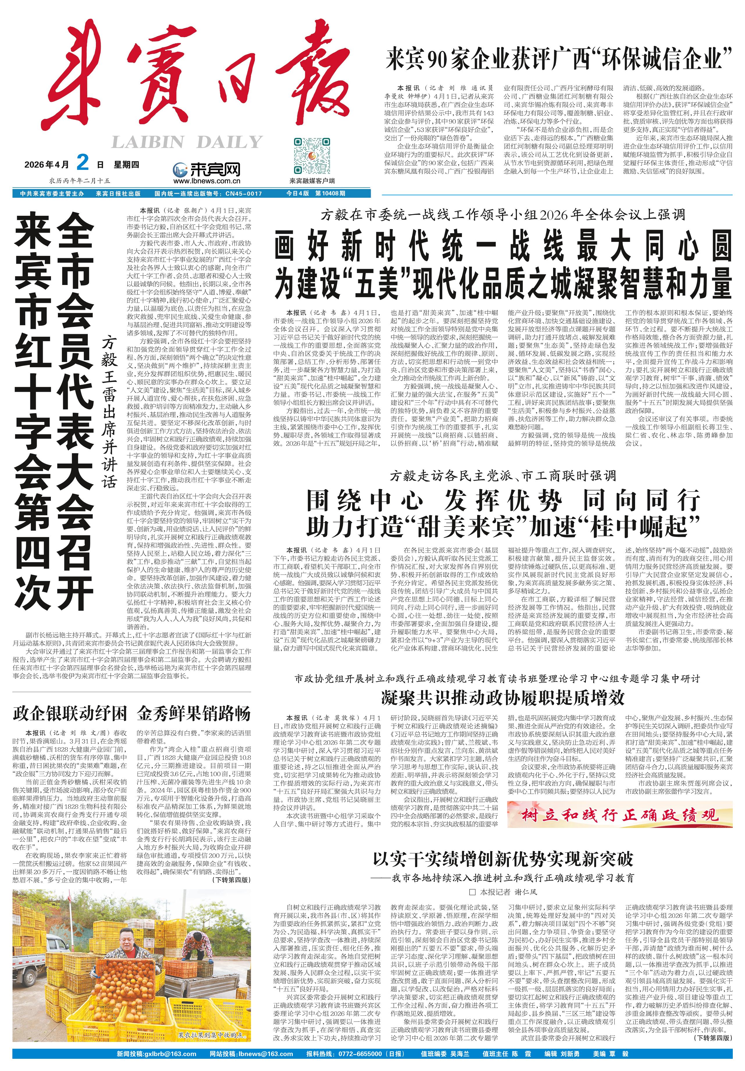 <div style='font-size: 22px!important;line-height: 34px!important;text-align: justify!important;color: #000!important'>以实干实绩增创新优势实现新突破</div><div style='font-size: 16px!important;line-height: 28px!important;text-align: justify;color: #777!important;margin-top: 20px;'>——我市各地持续深入推进树立和践行正确政绩观学习教育</div><div style='font-size: 14px!important;line-height: 22px!important;text-align: left!important;color: #777!important;margin-top: 20px;'>来宾日报  □ 本报记者 谢仁凤  2026-04-02</div><div><img id='paperImg' style='max-width: 100%;height: auto' src='//img.founderfx.cn/epaper/202604/02/0520b69b4da74b5bbeed0e9a8a4bca3b/1.jpg' alt='' class='page-img'/></div><p> 自树立和践行正确政绩观学习教育开展以来,我市各县(市、区)将其作为重要政治任务抓紧抓实,紧扣“立党为公、为民造福、科学决策、真抓实干”总要求,坚持学查改一体推进,持续深入部署推进,压实责任、细化任务,推动学习教育走深走实。各地自觉把树立和践行正确政绩观贯穿于推动区域发展、服务人民群众全过程,以实干实绩增创新优势、实现新突破,奋力实现“十五五”良好开局。</p><p> 兴宾区委常委会开展树立和践行正确政绩观学习教育读书班暨兴宾区委理论学习中心组2026年第二次专题学习集中研讨,强调要以一体推进学查改为抓手,在深学细悟、真查实改、务求实效上下功夫,持续推动学习教育走深走实。要强化理论武装,坚持读原文、学原著、悟原理,在深学细悟中增强政治领悟力、政治判断力、政治执行力。常委班子要以身作则、示范引领,深刻领会自治区党委书记陈刚提出的“五要五不要”要求,带头端正学习态度、深化学习理解、凝聚思想共识,以班子示范引领带动各级干部牢固树立正确政绩观;要一体推进学查改贯通,敢于直面问题、深入分析问题,以学促改、以改促治,严格对标科学决策要求,切实把正确政绩观贯穿工作全过程、各方面,奋力推进各项工作落地见效、提质增效。</p><p> 象州县委常委会开展树立和践行正确政绩观学习教育读书班暨县委理论学习中心组2026年第二次专题学习集中研讨,要求立足象州实际科学决策,统筹处理好发展中的“四对关系”,着力解决项目谋划“四个不够”突出问题,全力争项目、争资金;要坚守为民初心,办好民生实事,推进乡村全面振兴、优化公共服务、化解历史矛盾;要带头“四下基层”,把政绩树在田间地头、树在群众心坎上。班子成员要以上率下、严抓严管,牢记“五要五不要”要求,带头查摆整改问题,形成一级抓一级、层层抓落实的良好局面;要切实扛起树立和践行正确政绩观的主体责任,将学习教育同“十五五”开局起步、县乡换届、“三区三地”建设等重点工作深度融合,以正确政绩观引领全县各项事业高质量发展。</p><p> 武宣县委常委会开展树立和践行正确政绩观学习教育读书班暨县委理论学习中心组2026年第二次专题学习集中研讨,强调各级党委(党组)要把学习教育作为今年党的建设的重要任务,引导全县党员干部特别是领导干部,弄清楚“政绩为谁而树、树什么样的政绩、靠什么树政绩”这一根本问题,以一体推进学查改为抓手,以推进“三个年”活动为着力点,以过硬政绩观引领县域高质量发展。要强化实干担当,用心用情用力办好民生实事,扎实推进产业升级、项目建设等重点工作,着力破解历史矛盾纠纷排查化解、涉重金属排查整改等顽疾。要带头树立正确政绩观、带头查摆问题、带头整改落实,为全县干部树标杆、作表率。要加强对干部履职行为和政绩创造过程的监督,在正风肃纪中统筹建好政治生态、自然生态“两个生态”,为全面深化建设“三城三区”和东融先导县努力奋斗。</p><p> 忻城县委常委会开展树立和践行正确政绩观学习教育读书班暨县委理论学习中心组2026年第二次专题学习集中研讨,要求把对党忠诚、为民造福贯穿履职尽责全过程,把正确政绩观内化于心、外化于行,以坚定的政治自觉、思想自觉、行动自觉,引领全县各项工作沿着正确方向稳步推进。要始终做到党中央提倡的坚决响应、党中央决定的坚决执行、党中央禁止的坚决不做,确保在政绩观这个根本问题上不偏航、不变调、不走样。要严格对标党中央、自治区党委和市委部署要求,一体推进学查改,确保学习教育取得实效。要严格落实“一岗双责”,坚持以上率下、率先垂范,带头深学细悟、带头检视整改、带头履职担当,以“关键少数”的过硬作风和担当作为,带动“绝大多数”见贤思齐、奋发有为,真正做到为人民出政绩、以实干出政绩。</p><p> 金秀县委常委会召开树立和践行正确政绩观学习教育读书班暨县委理论学习中心组2026年第二次专题学习集中研讨,强调县委常委班子作为“关键少数”,必须带头对标检视、笃行实干,牢牢把握“政绩为谁而树、树什么样的政绩、靠什么树政绩”的核心要义,站稳人民立场、务求实绩实效、强化担当实干,推动各项决策部署落地生根。要锚定正确政绩观实践方向,做到“四个始终”,始终筑牢政治根基、始终增进民生福祉、始终严守决策规范、始终强化实干担当,推动学习教育与“十五五”开局、“三个年”活动、“五美”来宾建设等中心工作深度融合。要持续深化学习教育,抓实问题整改与制度建设,将整改与生态环保督察、巡视巡察整改结合,树立正确选人用人导向,完善考