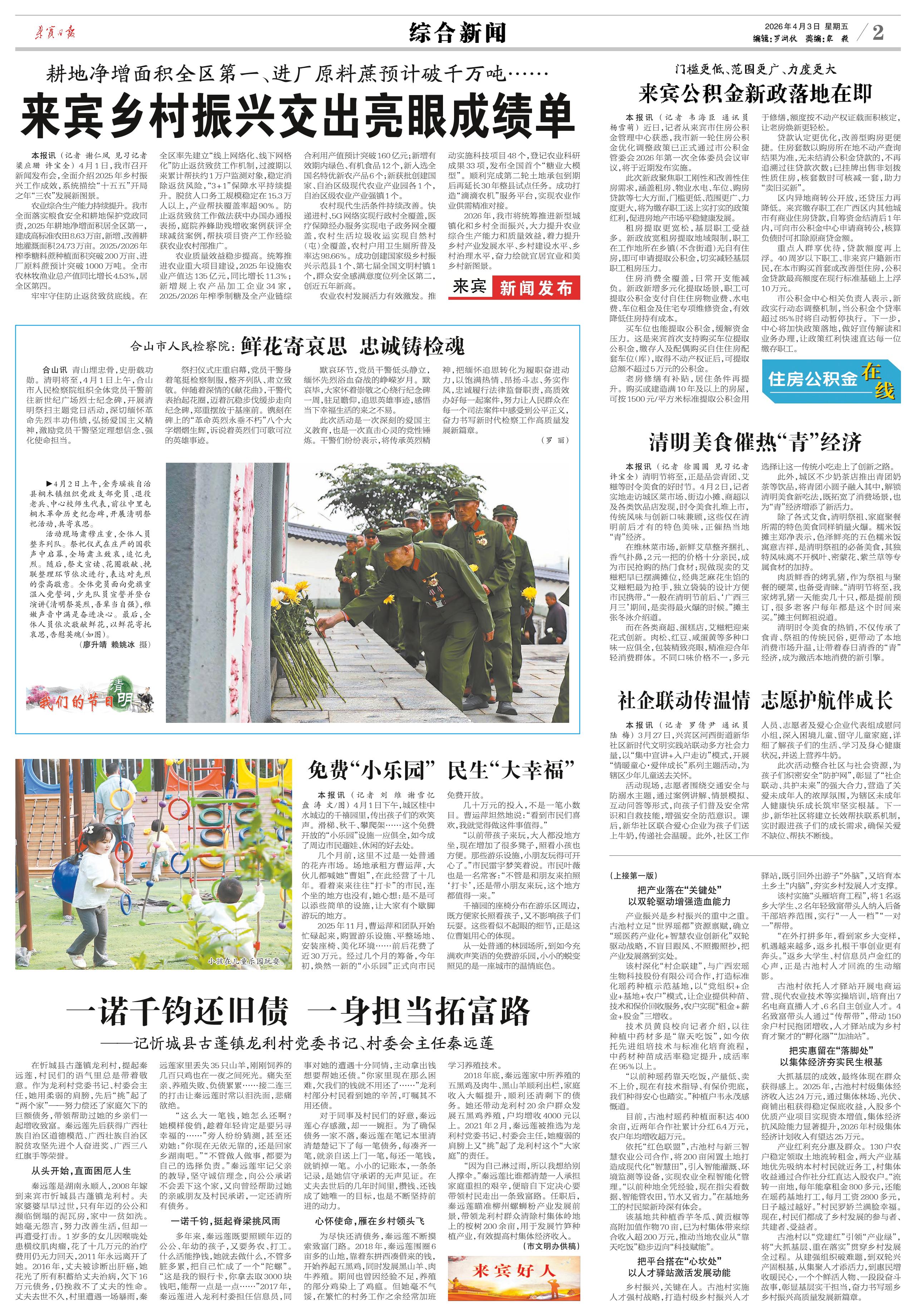<div style='font-size: 16px!important;line-height: 28px!important;text-align: justify;color: #777!important;'>耕地净增面积全区第一、进厂原料蔗预计破千万吨……</div><div style='font-size: 22px!important;line-height: 34px!important;text-align: justify!important;color: #000!important'>来宾乡村振兴交出亮眼成绩单</div><div style='font-size: 14px!important;line-height: 22px!important;text-align: left!important;color: #777!important;margin-top: 20px;'>来宾日报  2026-04-03</div><div><img id='paperImg' style='max-width: 100%;height: auto' src='//img.founderfx.cn/epaper/202604/03/cded4f780ff34f9caccf2f975f4fc67b/2.jpg' alt='' class='page-img'/></div><p> 本报讯 (记者 谢仁凤 见习记者 梁应珊 许宝全) 4月1日,我市召开新闻发布会,全面介绍2025年乡村振兴工作成效,系统描绘“十五五”开局之年“三农”发展新图景。</p><p> 农业综合生产能力持续提升。我市全面落实粮食安全和耕地保护党政同责,2025年耕地净增面积居全区第一,建成高标准农田8.63万亩,新增、改善耕地灌溉面积24.73万亩。2025/2026年榨季糖料蔗种植面积突破200万亩、进厂原料蔗预计突破1000万吨。全市农林牧渔业总产值同比增长4.53%,居全区第四。</p><p> 牢牢守住防止返贫致贫底线。在全区率先建立“线上网络化、线下网格化”防止返贫致贫工作机制,过渡期以来累计帮扶约1万户监测对象,稳定消除返贫风险,“3+1”保障水平持续提升。脱贫人口务工规模稳定在15.3万人以上,产业帮扶覆盖率超90%。防止返贫致贫工作做法获中办国办通报表扬,庭院养蜂助残增收案例获评全球减贫案例,帮扶项目资产工作经验获农业农村部推广。</p><p> 农业质量效益稳步提高。统筹推进农业重大项目建设,2025年设施农业产值达135亿元,同比增长11.3%;新增规上农产品加工企业34家,2025/2026年榨季制糖及全产业链综合利用产值预计突破160亿元;新增有效期内绿色、有机食品12个,新入选全国名特优新农产品6个;新获批创建国家、自治区级现代农业产业园各1个,自治区级农业产业强镇1个。</p><p> 农村现代生活条件持续改善。快递进村、5G网络实现行政村全覆盖,医疗保障经办服务实现电子政务网全覆盖,农村生活垃圾收运实现自然村(屯)全覆盖,农村户用卫生厕所普及率达98.66%。成功创建国家级乡村振兴示范县1个、第七届全国文明村镇1个,群众安全感满意度位列全区第二,创近五年新高。</p><p> 农业农村发展活力有效激发。推动实施科技项目48个,登记农业科研成果33项,发布全国首个“糖业大模型”。顺利完成第二轮土地承包到期后再延长30年整县试点任务。成功打造“滴滴农机”服务平台,实现农业作业供需精准对接。</p><p> 2026年,我市将统筹推进新型城镇化和乡村全面振兴,大力提升农业综合生产能力和质量效益,着力提升乡村产业发展水平、乡村建设水平、乡村治理水平,奋力绘就宜居宜业和美乡村新图景。</p>