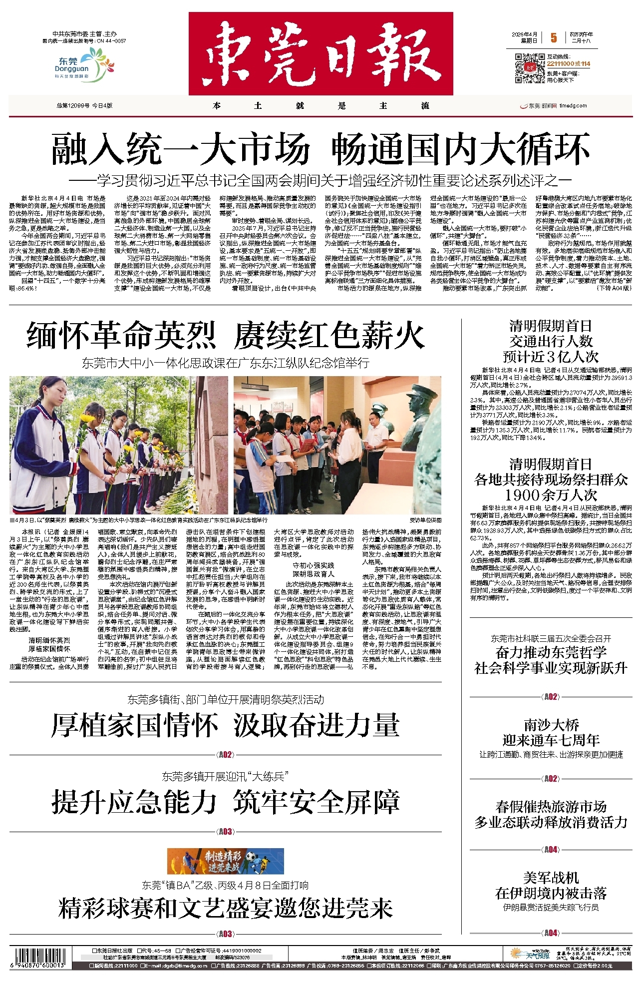 1900余万人次</div><div style='font-size: 14px!important;line-height: 22px!important;text-align: left!important;color: #777!important;margin-top: 20px;'>东莞日报  2026-04-05</div><div><img id='paperImg' style='max-width: 100%;height: auto' src='//img.founderfx.cn/epaper/202604/05/3b1391b6ecb64df0904691d2b81c01af/1.jpg' alt='' class='page-img'/></div><p> 新华社北京4月4日电 记者4月4日从民政部获悉,清明节假期首日,各地进入群众集中祭扫高峰。据统计,当日全国共有6.63万家殡葬服务机构提供现场祭扫服务,共接待现场祭扫群众1928.93万人次,其中选择绿色低碳祭扫方式的群众占比62.73%。</p><p> 此外,共有857个网络祭扫平台服务网络祭扫群众26.62万人次。各地殡葬服务机构全天安葬骨灰1.36万份,其中部分群众选择海葬、树葬、花葬、草坪葬等生态安葬方式,移风易俗和绿色殡葬理念正逐步深入人心。</p><p> 预计明后两天假期,各地出行祭扫人数将持续增多。民政部提醒广大公众,及时关注当地天气、路况等信息,合理安排祭扫时间,注意出行安全,文明低碳祭扫,度过一个平安祥和、文明有序的清明节。</p>