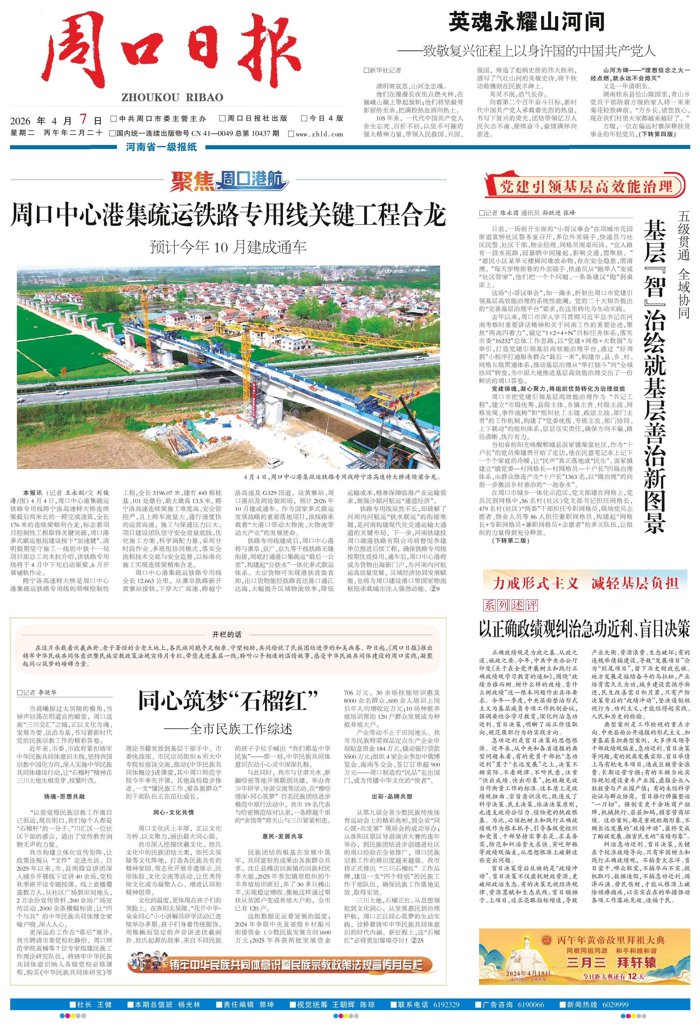 <div style='font-size: 16px!important;line-height: 28px!important;text-align: justify;color: #777!important;'>五级贯通 全域协同</div><div style='font-size: 22px!important;line-height: 34px!important;text-align: justify!important;color: #000!important'>基层“智”治绘就基层善治新图景(党建引领基层高效能治理)</div><div style='font-size: 14px!important;line-height: 22px!important;text-align: left!important;color: #777!important;margin-top: 20px;'>周口日报  2026-04-07</div><div><img id='paperImg' style='max-width: 100%;height: auto' src='//img.founderfx.cn/epaper/202604/06/53e7b31096a34a4aa35f5a09705f85dc/1.jpg' alt='' class='page-img'/></div><div style='font-size: 14px!important;line-height: 22px!important;text-align: center!important;color: #777!important;'><img src='//img.founderfx.cn/epaper/202604/06/53e7b31096a34a4aa35f5a09705f85dc/01/882bcf4d0fe4737c3c12f726ad84caed_s.jpg'style='display: block!important;margin: auto!important;max-width: 100%!important;'/></div><p> □记者 陈永团 通讯员 孙跃进 张峰</p><p> 日前,一场别开生面的“小哥议事会”在项城市花园街道袁桥社区警务室召开,多位外卖骑手、快递员与社区民警、社区干部、物业经理、网格员围桌而谈。“宜人路有一段水泥路,因暴晒中间隆起,影响交通,需维修。”“惠民小区某单元楼梯间堆放杂物,存在安全隐患,需清理。”每天穿梭街巷的外卖骑手、快递员从“跑单人”变成“社区管家”,他们把一个个问题、一条条建议“抛”到桌面上。</p><p> 这场“小哥议事会”,如一滴水,折射出周口市党建引领基层高效能治理的系统性波澜。党的二十大报告提出的“完善基层治理平台”要求,在这里转化为生动实践。</p><p> 去年以来,周口市深入学习贯彻习近平总书记在河南考察时重要讲话精神和关于河南工作的重要论述,聚焦“两高四着力”,锚定“1+2+4+N”目标任务体系,落实市委“16232”总体工作思路,以“党建+网格+大数据”为牵引,打造党建引领基层高效能治理平台,通过 “好周到”小程序打通服务群众“最后一米”,构建市、县、乡、村、网格五级贯通体系,推动基层治理从“单打独斗”向“全域协同”转变,为中原大地推进基层高效能治理交出了一份鲜活的周口答卷。</p><p> 党建铸魂、凝心聚力,将组织优势转化为治理效能</p><p> 周口市把党建引领基层高效能治理作为“书记工程”,建立“市级统筹、县级主体、乡镇主责、村级主战、网格发现、事件流转”和“组织社工主建、政法主战、部门主责”的工作机制,构建了“党委统揽、专班主攻、部门协同、上下联动”的组织体系,层层压实责任,确保方向不偏、路径清晰、执行有力。</p><p> 当初春的阳光唤醒郸城县汲冢镇柴堂社区,作为“十户长”的党员柴建勇开始了走访,他在民意笔记本上记下一个个家庭的冷暖,让“民声”真正落地成“民生”。汲冢镇建立“镇党委—村网格长—村网格员—十户长”四级治理体系,由群众推选产生“十户长”1363名,以“微治理”的向前一步激活乡村善治的“一池春水”。</p><p> 在周口市城乡一体化示范区,党支部建在网格上,党员沉到网格中,56名村(社区)党支部书记担任网格长,479名村(社区)“两委”干部担任专职网格员,吸纳党员志愿者、物业人员等86人担任兼职网格员,构建起“网格长+专职网格员+兼职网格员+志愿者”的多元队伍,让组织的力量得到充分释放。</p><p> 体系重塑、五级贯通,让阵地“实”起来</p><p> 2025年以来,周口市全面落实省委关于党建引领基层高效能治理的决策部署,以“四个明白”廓清思路,以“五级贯通”夯实基础,以“全域协同”提升效能,推动基层治理体系重塑、能力跃升。</p><p> 五级贯通,织密治理网络。依托“好周到”APP工作端,构建市、县、乡、村、网格五级穿透指挥体系。建强基层治理网格,科学调整设置网格27832个,36152名专兼职网格员定期入户走访,开展信息采集上报、矛盾纠纷排查化解、政策宣传等工作,延伸服务触角,在网格中把温暖送到群众心坎上。法院、检察院、公安、司法等单位进驻综治中心,为基层治理注入法治动能,提升了网格服务的速度、精度、深度,更高效解决群众的急难愁盼问题。</p><p> 全域协同,实现“横”“纵”联动。平台整合公安、民政等部门数据,搭建“三横两纵”数据信息通道,促进基层治理、城市管理等多领域数据融合,汇聚各级职能部门资源力量。建立部门职责清单和联动响应清单,针对需要多部门协同处置的复杂事项,属地“吹哨”,相关部门快速“应哨”、联合处置,实现治理模式由“单打独斗”向“协同共治”转变。</p><p> 周口市推进各级社会治理中心与综治中心一体办公,构建协同联动、高效运转的工作机制,推动矛盾纠纷实质性化解、治理效能持续提升。日前,淮阳区网格员巡查走访时,发现村内一对夫妻发生激烈争执,经劝阻无效后报警。民警到达现场劝导后,双方虽停止争吵,但怨气未消,民警遂将该事件标注为非警务警情推送至社会治理平台。事项随后被流转至司法所、民政所和所属行政村网格长、网格员,经多方调解,两人心里的“疙瘩”慢慢消除,这起纠纷画上了“句号”。</p><p> 智治赋能、融合蝶变,让治理更高效</p><p> 走进周口市社会治理中心综合指挥大厅,电子屏上实时跳动着各类数据:网格员在线状态、今日事件办结率、安全预警信息……这里是城市的“智慧大脑”,更是基层治理的“指挥中枢”,也是实现五级