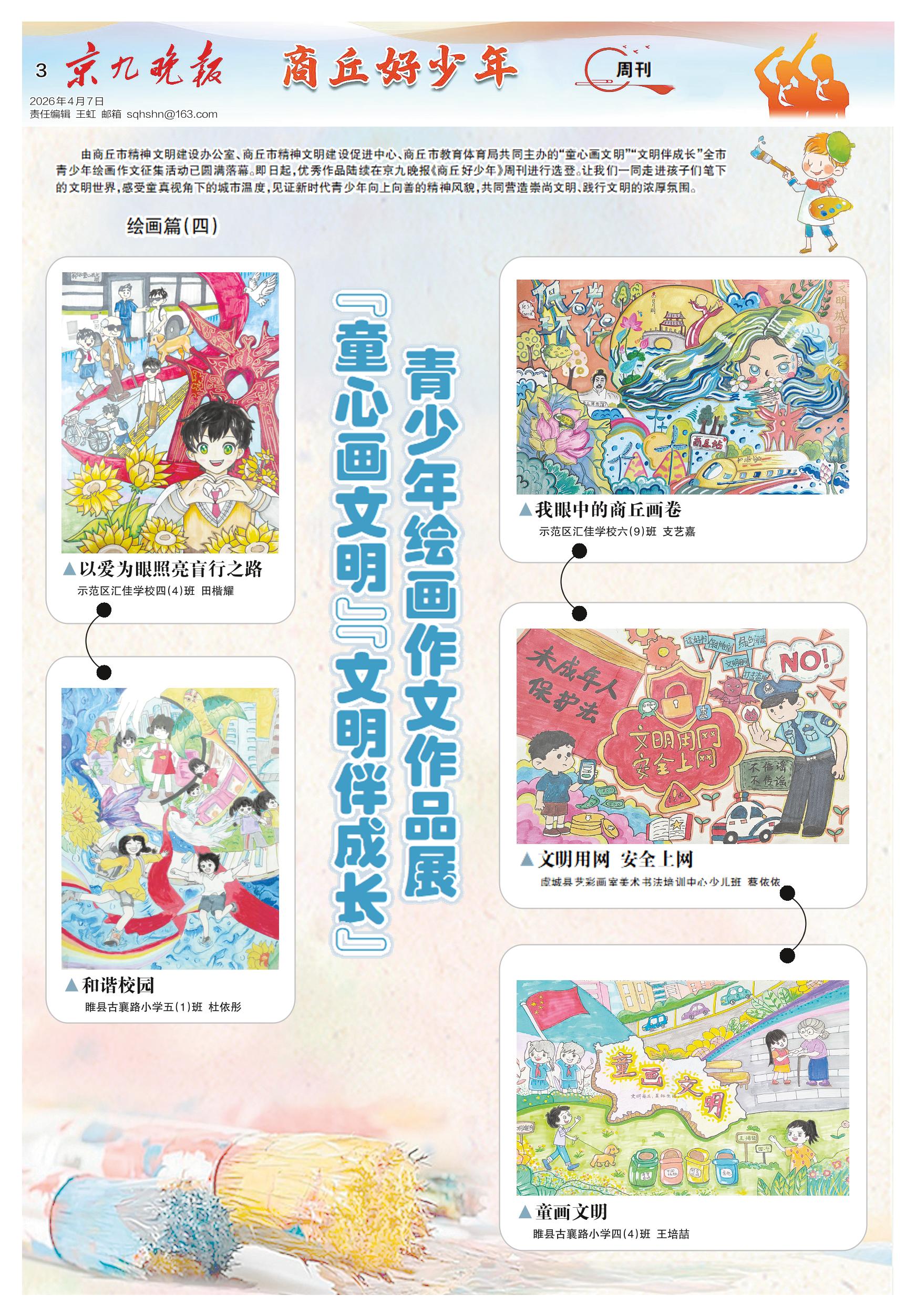 <div style='font-size: 22px!important;line-height: 34px!important;text-align: justify!important;color: #000!important'>“童心画文明”“文明伴成长” 青少年绘画作文作品展</div><div style='font-size: 16px!important;line-height: 28px!important;text-align: justify;color: #777!important;margin-top: 20px;'>绘画篇(四)</div><div style='font-size: 14px!important;line-height: 22px!important;text-align: left!important;color: #777!important;margin-top: 20px;'>京九晚报云阅读  2026-04-07</div><div><img id='paperImg' style='max-width: 100%;height: auto' src='//img.founderfx.cn/epaper/202604/06/765082a0c4cd4e199eab64982377d8c2/3.jpg' alt='' class='page-img'/></div><div style='font-size: 14px!important;line-height: 22px!important;text-align: center!important;color: #777!important;'><img src='//img.founderfx.cn/epaper/202604/06/765082a0c4cd4e199eab64982377d8c2/03/j0407_c《以爱为眼照亮盲行之路》田楷耀 商丘市城乡一体化示范区汇佳学校 四四班 小学组 张珍珍 17596967010 (2)_s.jpg'style='display: block!important;margin: auto!important;max-width: 100%!important;'/> ▲以爱为眼照亮盲行之路