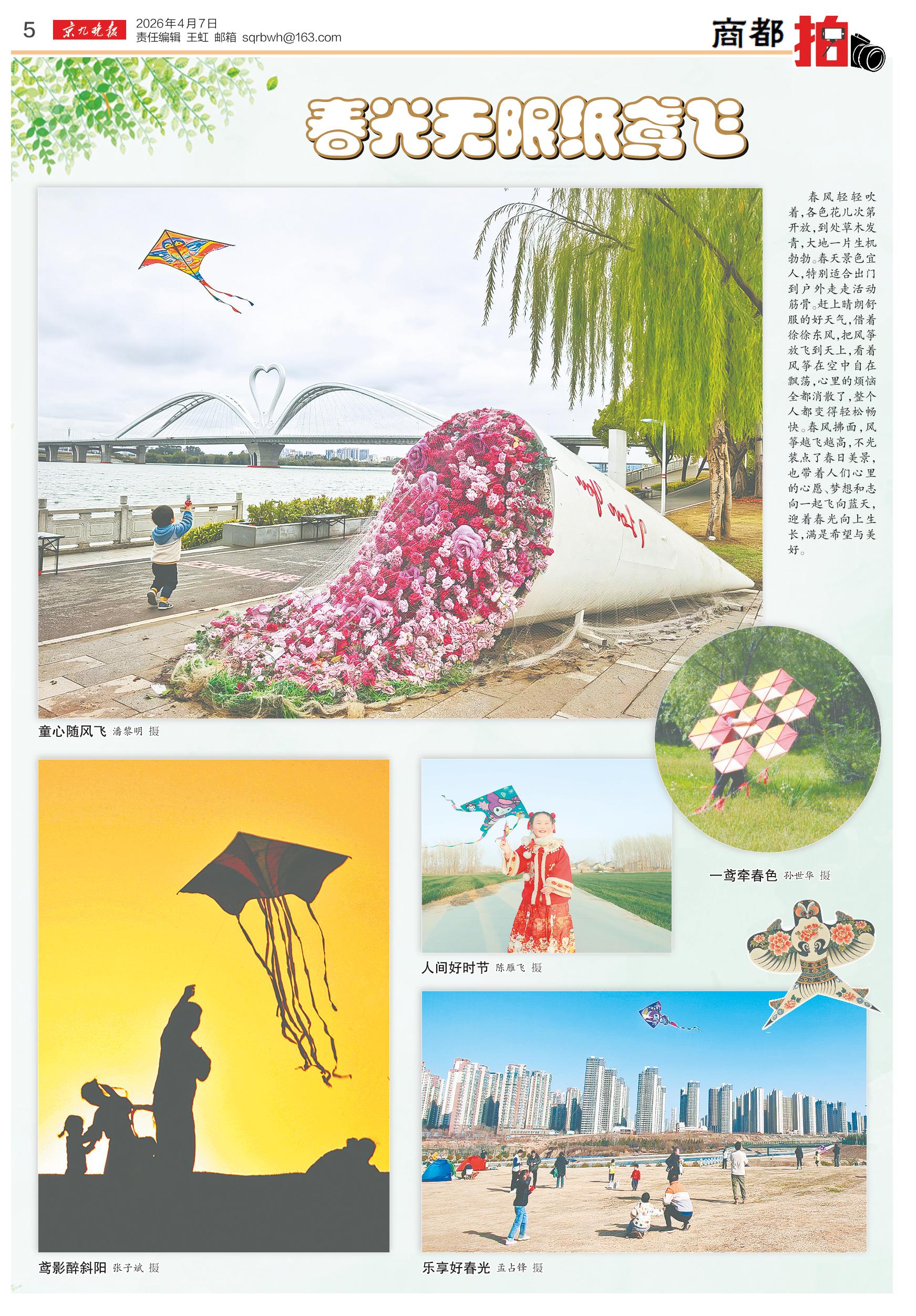 <div style='font-size: 22px!important;line-height: 34px!important;text-align: justify!important;color: #000!important'>春光无限纸鸢飞</div><div style='font-size: 14px!important;line-height: 22px!important;text-align: left!important;color: #777!important;margin-top: 20px;'>京九晚报云阅读  2026-04-07</div><div><img id='paperImg' style='max-width: 100%;height: auto' src='//img.founderfx.cn/epaper/202604/06/765082a0c4cd4e199eab64982377d8c2/5.jpg' alt='' class='page-img'/></div><div style='font-size: 14px!important;line-height: 22px!important;text-align: center!important;color: #777!important;'><img src='//img.founderfx.cn/epaper/202604/06/765082a0c4cd4e199eab64982377d8c2/05/j0407_e享受春日乐趣 潘黎明 (4) - 副本_s.jpg'style='display: block!important;margin: auto!important;max-width: 100%!important;'/> 童心随风飞 潘黎明 摄<img src='//img.founderfx.cn/epaper/202604/06/765082a0c4cd4e199eab64982377d8c2/05/j0407_e放风筝:孙世华;黑龙江省牡丹江市东安区太平路日照街京江华府3栋2606室:孙世华;邮政编码:157000;手机:15046396553 - 副本_s.jpg'style='display: block!important;margin: auto!important;max-width: 100%!important;'/> 一鸢牵春色 孙世华 摄<img src='//img.founderfx.cn/epaper/202604/06/765082a0c4cd4e199eab64982377d8c2/05/j0407_e陈雁飞7 - 副本 (2)_s.jpg'style='display: block!important;margin: auto!important;max-width: 100%!important;'/> 人间好时节 陈雁飞 摄<img src='//img.founderfx.cn/epaper/202604/06/765082a0c4cd4e199eab64982377d8c2/05/j0407_e忙趁东风放纸鸢 孟占锋 - 副本_s.jpg'style='display: block!important;margin: auto!important;max-width: 100%!important;'/> 乐享好春光 孟占锋 摄<img src='//img.founderfx.cn/epaper/202604/06/765082a0c4cd4e199eab64982377d8c2/05/j0407_e忙趁东风放纸鸢 张子斌3 - 副本_s.jpg'style='display: block!important;margin: auto!important;max-width: 100%!important;'/> 鸢影醉斜阳 张子斌 摄</div><p> 春风轻轻吹着,各色花儿次第开放,到处草木发青,大地一片生机勃勃。春天景色宜人,特别适合出门到户外走走活动筋骨。赶上晴朗舒服的好天气,借着徐徐东风,把风筝放飞到天上,看着风筝在空中自在飘荡,心里的烦恼全都消散了,整个人都变得轻松畅快。春风拂面,风筝越飞越高,不光装点了春日美景,也带着人们心里的心愿、梦想和志向一起飞向蓝天,迎着春光向上生长,满是希望与美好。</p>