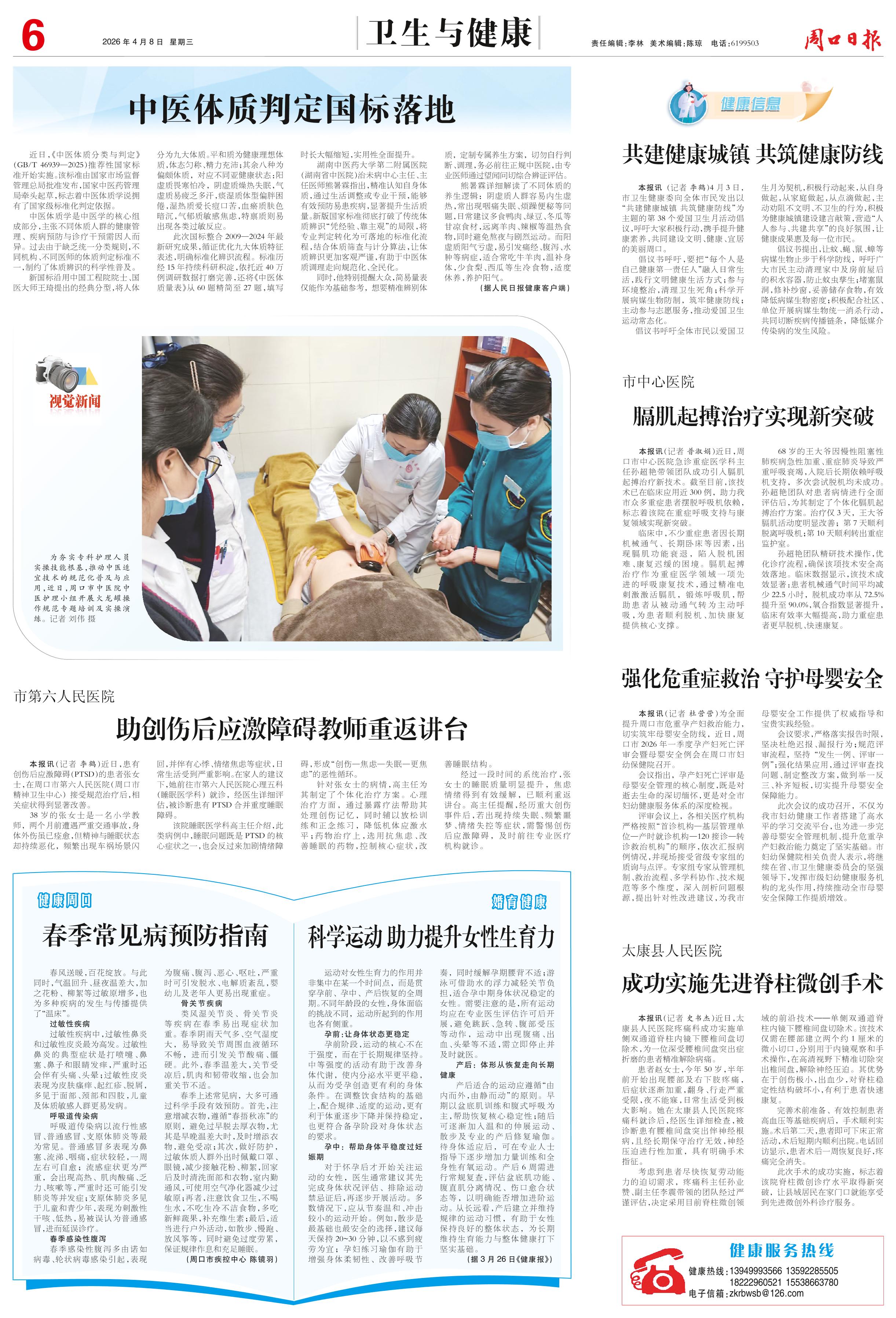 <div style='font-size: 16px!important;line-height: 28px!important;text-align: justify;color: #777!important;'>太康县人民医院</div><div style='font-size: 22px!important;line-height: 34px!important;text-align: justify!important;color: #000!important'>成功实施先进脊柱微创手术</div><div style='font-size: 14px!important;line-height: 22px!important;text-align: left!important;color: #777!important;margin-top: 20px;'>周口日报  2026-04-08</div><div><img id='paperImg' style='max-width: 100%;height: auto' src='//img.founderfx.cn/epaper/202604/08/a7b71e088e874cb2ac0f33707df718a2/6.jpg' alt='' class='page-img'/></div><p> 本报讯(记者 史书杰)近日,太康县人民医院疼痛科成功实施单侧双通道脊柱内镜下腰椎间盘切除术,为一位深受腰椎间盘突出症折磨的患者精准解除病痛。</p><p> 患者赵女士,今年50岁,半年前开始出现腰部及右下肢疼痛,后症状逐渐加重,翻身、行走严重受限,夜不能寐,日常生活受到极大影响。她在太康县人民医院疼痛科就诊后,经医生详细检查,被诊断患有腰椎间盘突出伴神经根病,且经长期保守治疗无效,神经压迫进行性加重,具有明确手术指征。</p><p> 考虑到患者尽快恢复劳动能力的迫切需求,疼痛科主任孙业赞、副主任李震带领的团队经过严谨评估,决定采用目前脊柱微创领域的前沿技术——单侧双通道脊柱内镜下腰椎间盘切除术。该技术仅需在腰部建立两个约1厘米的微小切口,分别用于内镜观察和手术操作,在高清视野下精准切除突出椎间盘,解除神经压迫。其优势在于创伤极小,出血少,对脊柱稳定性结构破坏小,有利于患者快速康复。</p><p> 完善术前准备、有效控制患者高血压等基础疾病后,手术顺利实施。术后第二天,患者即可下床正常活动,术后短期内顺利出院。电话回访显示,患者术后一周恢复良好,疼痛完全消失。</p><p> 此次手术的成功实施,标志着该院脊柱微创诊疗水平取得新突破,让县域居民在家门口就能享受到先进微创外科诊疗服务。</p>
