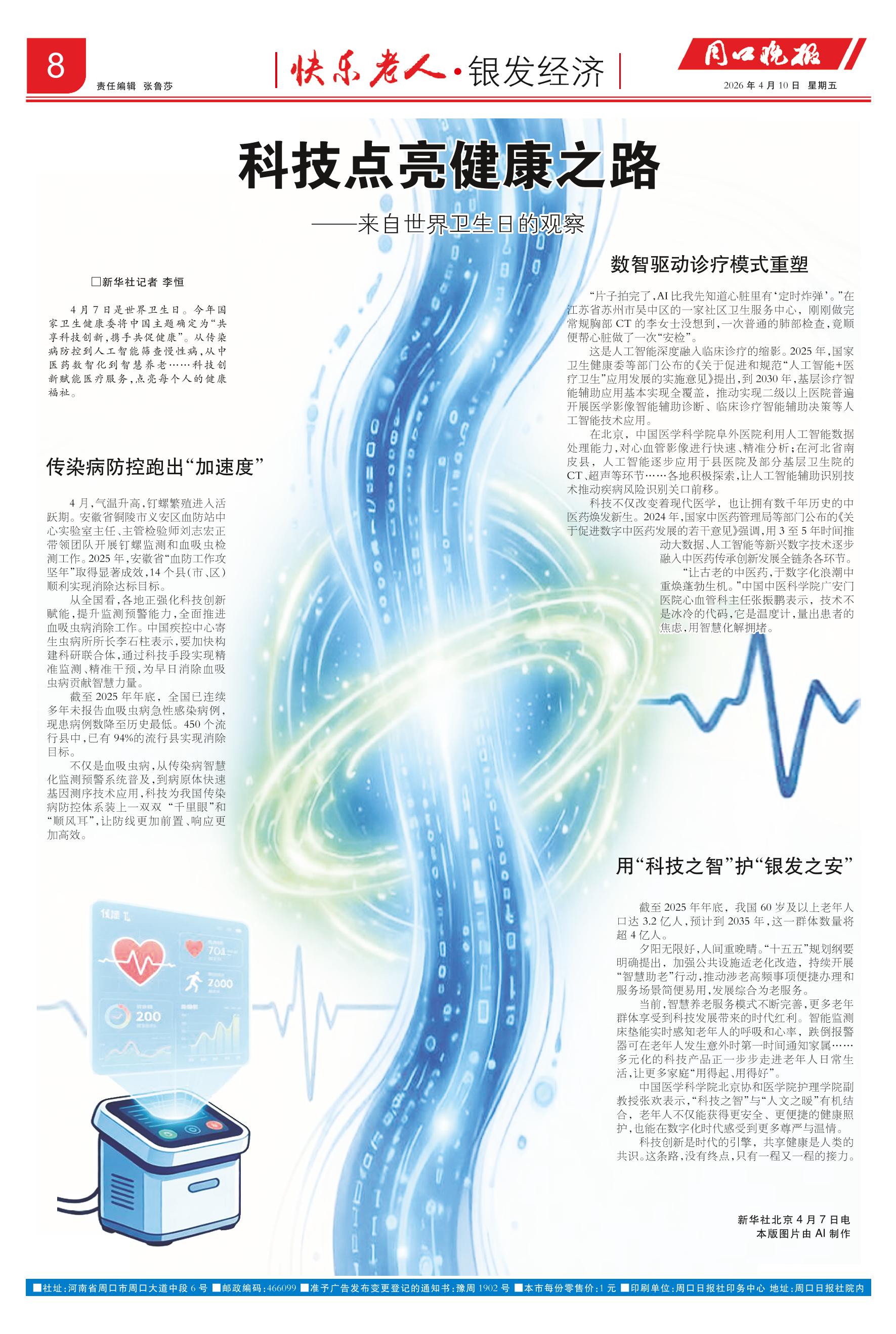 <div style='font-size: 22px!important;line-height: 34px!important;text-align: justify!important;color: #000!important'>科技点亮健康之路</div><div style='font-size: 16px!important;line-height: 28px!important;text-align: justify;color: #777!important;margin-top: 20px;'>——来自世界卫生日的观察</div><div style='font-size: 14px!important;line-height: 22px!important;text-align: left!important;color: #777!important;margin-top: 20px;'>周口晚报  2026-04-10</div><div><img id='paperImg' style='max-width: 100%;height: auto' src='//img.founderfx.cn/epaper/202604/09/8f5ba60d9356474fbe46e5a340225505/8.jpg' alt='' class='page-img'/></div><p> □新华社记者 李恒</p><p> 4月7日是世界卫生日。今年国家卫生健康委将中国主题确定为“共享科技创新,携手共促健康”。从传染病防控到人工智能筛查慢性病,从中医药数智化到智慧养老……科技创新赋能医疗服务,点亮每个人的健康福祉。</p><p> 传染病防控跑出“加速度”</p><p> 4月,气温升高,钉螺繁殖进入活跃期。安徽省铜陵市义安区血防站中心实验室主任、主管检验师刘志宏正带领团队开展钉螺监测和血吸虫检测工作。2025年,安徽省“血防工作攻坚年”取得显著成效,14个县(市、区)顺利实现消除达标目标。</p><p> 从全国看,各地正强化科技创新赋能,提升监测预警能力,全面推进血吸虫病消除工作。中国疾控中心寄生虫病所所长李石柱表示,要加快构建科研联合体,通过科技手段实现精准监测、精准干预,为早日消除血吸虫病贡献智慧力量。</p><p> 截至2025年年底,全国已连续多年未报告血吸虫病急性感染病例,现患病例数降至历史最低。450个流行县中,已有94%的流行县实现消除目标。</p><p> 不仅是血吸虫病,从传染病智慧化监测预警系统普及,到病原体快速基因测序技术应用,科技为我国传染病防控体系装上一双双“千里眼”和“顺风耳”,让防线更加前置、响应更加高效。</p><p> 数智驱动诊疗模式重塑</p><p> “片子拍完了,AI比我先知道心脏里有‘定时炸弹’。”在江苏省苏州市吴中区的一家社区卫生服务中心,刚刚做完常规胸部CT的李女士没想到,一次普通的肺部检查,竟顺便帮心脏做了一次“安检”。</p><p> 这是人工智能深度融入临床诊疗的缩影。2025年,国家卫生健康委等部门公布的《关于促进和规范“人工智能+医疗卫生”应用发展的实施意见》提出,到2030年,基层诊疗智能辅助应用基本实现全覆盖,推动实现二级以上医院普遍开展医学影像智能辅助诊断、临床诊疗智能辅助决策等人工智能技术应用。</p><p> 在北京,中国医学科学院阜外医院利用人工智能数据处理能力,对心血管影像进行快速、精准分析;在河北省南皮县,人工智能逐步应用于县医院及部分基层卫生院的CT、超声等环节……各地积极探索,让人工智能辅助识别技术推动疾病风险识别关口前移。</p><p> 科技不仅改变着现代医学,也让拥有数千年历史的中医药焕发新生。2024年,国家中医药管理局等部门公布的《关于促进数字中医药发展的若干意见》强调,用3至5年时间推动大数据、人工智能等新兴数字技术逐步融入中医药传承创新发展全链条各环节。</p><p> “让古老的中医药,于数字化浪潮中重焕蓬勃生机。”中国中医科学院广安门医院心血管科主任张振鹏表示,技术不是冰冷的代码,它是温度计,量出患者的焦虑,用智慧化解拥堵。</p><p> 用“科技之智”护“银发之安”</p><p> 截至2025年年底,我国60岁及以上老年人口达3.2亿人,预计到2035年,这一群体数量将超4亿人。</p><p> 夕阳无限好,人间重晚晴。“十五五”规划纲要明确提出,加强公共设施适老化改造,持续开展“智慧助老”行动,推动涉老高频事项便捷办理和服务场景简便易用,发展综合为老服务。</p><p> 当前,智慧养老服务模式不断完善,更多老年群体享受到科技发展带来的时代红利。智能监测床垫能实时感知老年人的呼吸和心率,跌倒报警器可在老年人发生意外时第一时间通知家属……多元化的科技产品正一步步走进老年人日常生活,让更多家庭“用得起、用得好”。</p><p> 中国医学科学院北京协和医学院护理学院副教授张欢表示,“科技之智”与“人文之暖”有机结合,老年人不仅能获得更安全、更便捷的健康照护,也能在数字化时代感受到更多尊严与温情。</p><p> 科技创新是时代的引擎,共享健康是人类的共识。这条路,没有终点,只有一程又一程的接力。</p><p> 新华社北京4月7日电</p><p> 本版图片由AI制作</p>