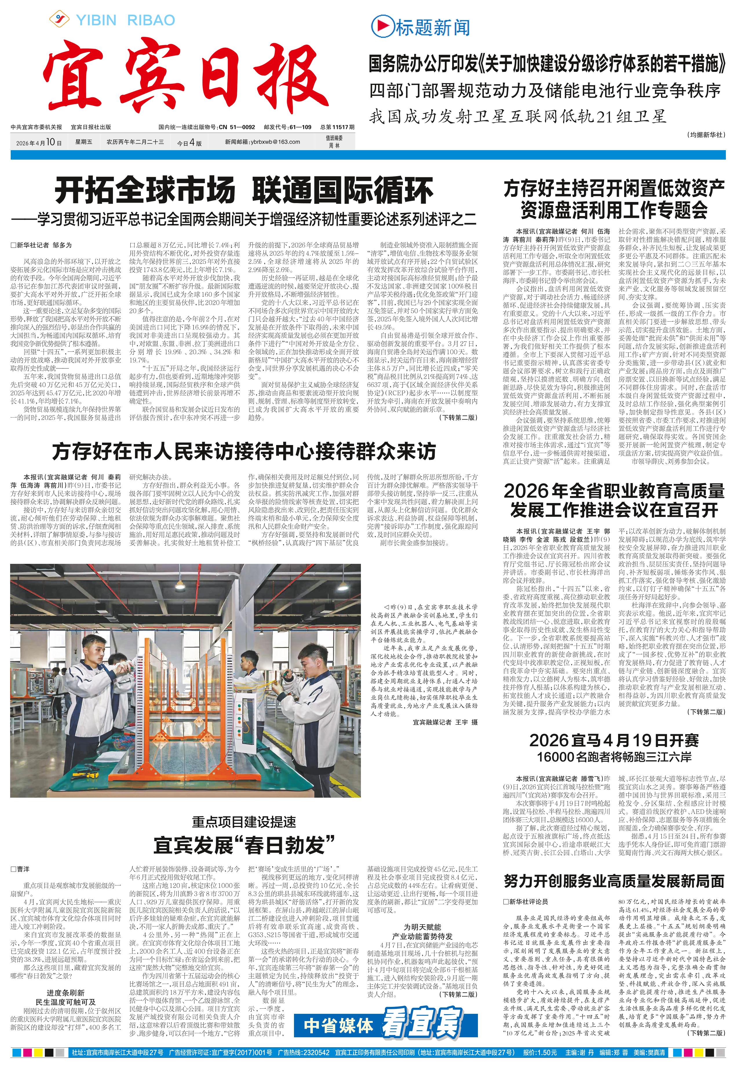 <div style='font-size: 22px!important;line-height: 34px!important;text-align: justify!important;color: #000!important'>方存好在市人民来访接待中心接待群众来访</div><div style='font-size: 14px!important;line-height: 22px!important;text-align: left!important;color: #777!important;margin-top: 20px;'>宜宾日报  2026-04-10</div><div><img id='paperImg' style='max-width: 100%;height: auto' src='//img.founderfx.cn/epaper/202604/10/8adf06475f604d4eab32cc749e7ab4f3/1.jpg' alt='' class='page-img'/></div><p> 本报讯(宜宾融媒记者 何川 秦莉萍 伍海涛 蒋前川)昨(9)日,市委书记方存好来到市人民来访接待中心,现场接待群众来访,协调解决群众反映问题。</p><p> 接访中,方存好与来访群众亲切交流,耐心倾听他们在劳动保障、土地租赁、防洪治理等方面的诉求,仔细查阅相关材料,详细了解事情原委,与参与接访的县(区)、市直相关部门负责同志现场研究解决办法。</p><p> 方存好指出,群众利益无小事。各级各部门要牢固树立以人民为中心的发展思想,走好新时代党的群众路线,扎实抓好信访突出问题攻坚化解,用心用情、依法依规为群众办实事解难题。聚焦社会保障等重点民生领域,深入排查、系统施治,用好用足惠民政策,推动问题及时妥善解决。扎实做好土地租赁补偿工作,确保相关费用及时足额兑付到位,同步加快推进复耕复垦,切实维护群众合法权益。抓实防汛减灾工作,加强对群众举报的险情线索等核查处置,切实把风险隐患找出来、改到位,把责任压实到终端末梢和最小单元,全力保障安全度汛和人民群众生命财产安全。</p><p> 方存好强调,要坚持和发展新时代“枫桥经验”,认真践行“四下基层”优良传统,及时了解群众所思所想所盼,千方百计为群众排忧解难。严格落实领导干部带头接访制度,坚持举一反三,注重从个案中发现共性问题,着力解决面上问题,从源头上化解信访问题。优化群众诉求表达、利益协调、权益保障等机制,完善“接诉即办”工作制度,强化跟踪问效,及时回应群众关切。</p><p> 副市长黄金盛参加接访。</p>