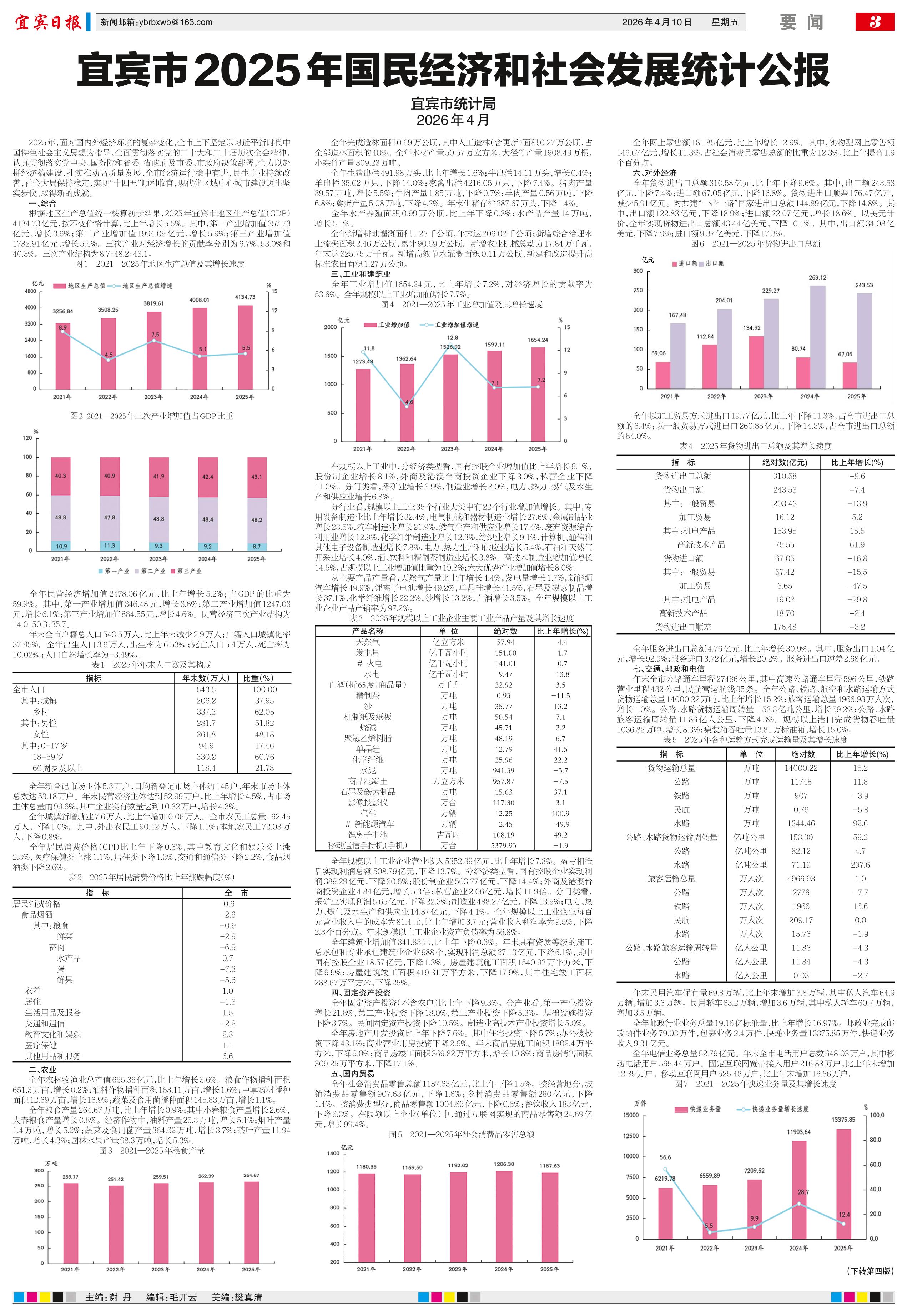 根据地区生产总值统一核算初步结果,2025年宜宾市地区生产总值(GDP)4134.73亿元,按不变价格计算,比上年增长5.5%。其中,第一产业增加值357.73亿元,增长3.6%;第二产业增加值1994.09亿元,增长5.9%;第三产业增加值1782.91亿元,增长5.4%。三次产业对经济增长的贡献率分别为6.7%、53.0%和40.3%。三次产业结构为8.7:48.2:43.1。