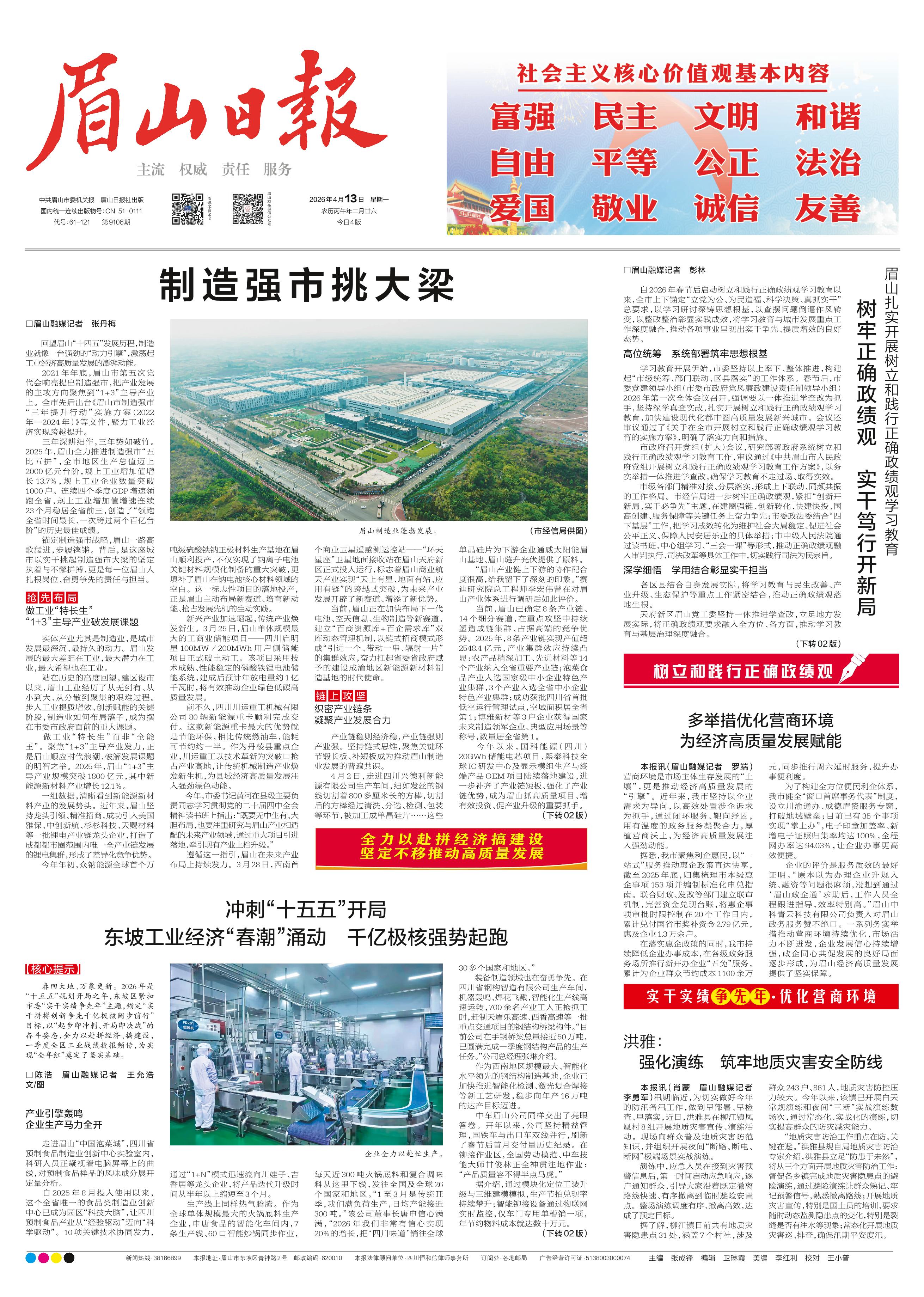 <div style='font-size: 22px!important;line-height: 34px!important;text-align: justify!important;color: #000!important'>制造强市挑大梁</div><div style='font-size: 14px!important;line-height: 22px!important;text-align: left!important;color: #777!important;margin-top: 20px;'>眉山日报  2026-04-13</div><div><img id='paperImg' style='max-width: 100%;height: auto' src='//img.founderfx.cn/epaper/202604/13/3b5eea7a9ce045099d9baeaec8407725/1.jpg' alt='' class='page-img'/></div><div style='font-size: 14px!important;line-height: 22px!important;text-align: center!important;color: #777!important;'><img src='//img.founderfx.cn/epaper/202604/13/3b5eea7a9ce045099d9baeaec8407725/01/260413a-1_s.jpg'style='display: block!important;margin: auto!important;max-width: 100%!important;'/> 眉山制造业蓬勃发展。(市经信局供图)</div><p> □眉山融媒记者 张丹梅</p><p> 回望眉山“十四五”发展历程,制造业就像一台强劲的“动力引擎”,激荡起工业经济高质量发展的澎湃动能。</p><p> 2021年年底,眉山市第五次党代会响亮提出制造强市,把产业发展的主攻方向聚焦到“1+3”主导产业上。全市先后出台《眉山市制造强市“三年提升行动”实施方案(2022年—2024年)》等文件,聚力工业经济实现跨越提升。</p><p> 三年深耕细作,三年势如破竹。2025年,眉山全力推进制造强市“五比五拼”,全市地区生产总值迈上2000亿元台阶,规上工业增加值增长13.7%,规上工业企业数量突破1000户。连续四个季度GDP增速领跑全省,规上工业增加值增速连续23个月稳居全省前三,创造了“领跑全省时间最长、一次跨过两个百亿台阶”的历史最佳成绩。</p><p> 锚定制造强市战略,眉山一路高歌猛进,步履铿锵。背后,是这座城市以实干挑起制造强市大梁的坚定执着与不懈拼搏,更是每一位眉山人扎根岗位、奋勇争先的责任与担当。</p><p> 抢先布局</p><p> 做工业“特长生”</p><p> “1+3”主导产业破发展课题</p><p> 实体产业尤其是制造业,是城市发展最深沉、最持久的动力。眉山发展的最大差距在工业,最大潜力在工业,最大希望也在工业。</p><p> 站在历史的高度回望,建区设市以来,眉山工业经历了从无到有、从小到大、从分散到聚集的艰难过程。步入工业提质增效、创新赋能的关键阶段,制造业如何布局落子,成为摆在市委市政府面前的重大课题。</p><p> 做工业“特长生”而非“全能王”。聚焦“1+3”主导产业发力,正是眉山顺应时代浪潮、破解发展课题的明智之举。2025年,眉山“1+3”主导产业规模突破1800亿元,其中新能源新材料产业增长12.1%。</p><p> 一组数据,清晰看到新能源新材料产业的发展势头。近年来,眉山坚持龙头引领、精准招商,成功引入美国雅保、中创新航、杉杉科技、天赐材料等一批锂电产业链龙头企业,打造了成都都市圈范围内唯一全产业链发展的锂电集群,形成了差异化竞争优势。</p><p> 今年年初,众钠能源全球首个万吨级硫酸铁钠正极材料生产基地在眉山顺利投产,不仅实现了钠离子电池关键材料规模化制备的重大突破,更填补了眉山在钠电池核心材料领域的空白。这一标志性项目的落地投产,正是眉山主动布局新赛道、培育新动能、抢占发展先机的生动实践。</p><p> 新兴产业加速崛起,传统产业焕发新生。3月25日,眉山单体规模最大的工商业储能项目——四川启明星100MW/200MWh用户侧储能项目正式破土动工。该项目采用技术成熟、性能稳定的磷酸铁锂电池储能系统,建成后预计年放电量约1亿千瓦时,将有效推动企业绿色低碳高质量发展。</p><p> 前不久,四川川运重工机械有限公司80辆新能源重卡顺利完成交付。这款新能源重卡最大的优势就是节能环保,相比传统燃油车,能耗可节约约一半。作为丹棱县重点企业,川运重工以技术革新为突破口抢占产业高地,让传统机械制造产业焕发新生机,为县域经济高质量发展注入强劲绿色动能。</p><p> 今年,市委书记黄河在县级主要负责同志学习贯彻党的二十届四中全会精神读书班上指出:“既要无中生有、大胆布局,也要注重研究与眉山产业相适配的未来产业领域,通过重大项目引进落地,牵引现有产业上档升级。”</p><p> 遵循这一指引,眉山在未来产业布局上持续发力。3月28日,西南首个商业卫星遥感测运控站——“环天星座”卫星地面接收站在眉山天府新区正式投入运行,标志着眉山商业航天产业实现“天上有星、地面有站、应用有链”的跨越式突破,为未来产业发展开辟了新赛道、增添了新优势。</p><p> 当前,眉山正在加快布局下一代电池、空天信息、生物制造等新赛道,建立“百商资源库+百企需求库”双库动态管理机制,以链式招商模式形成“引进一个、带动一串、辐射一片”的集群效应,奋力扛起省委省政府赋予的建设成渝地区新能源新材料制造基地的时代使命。</p><p> 链上攻坚</p><p> 织密产业链条</p><p> 凝聚产业发展合力</p><p> 产业链稳则经济稳,产业链强则产业强。坚持链式思维,聚焦关键环节锻长板、补短板成为推动眉山制造业发展的普遍共识。</p><p> 4月2日,走进四川兴德利新能源有限公司生产车间,细如发丝的钢线切割着800多厘米长的方棒,切割后的方棒经过清洗、分选、检测、包装等环节,被加工成单晶硅片……这些单晶硅片为下游企业通威太阳能眉山基地、眉山琏升光伏提供了原料。</p><p> “眉山产业链上下游的协作配合度很高,给我留下了深刻的印象。”赛迪研究院总工程师李宏伟曾在对眉山产业体系进行调