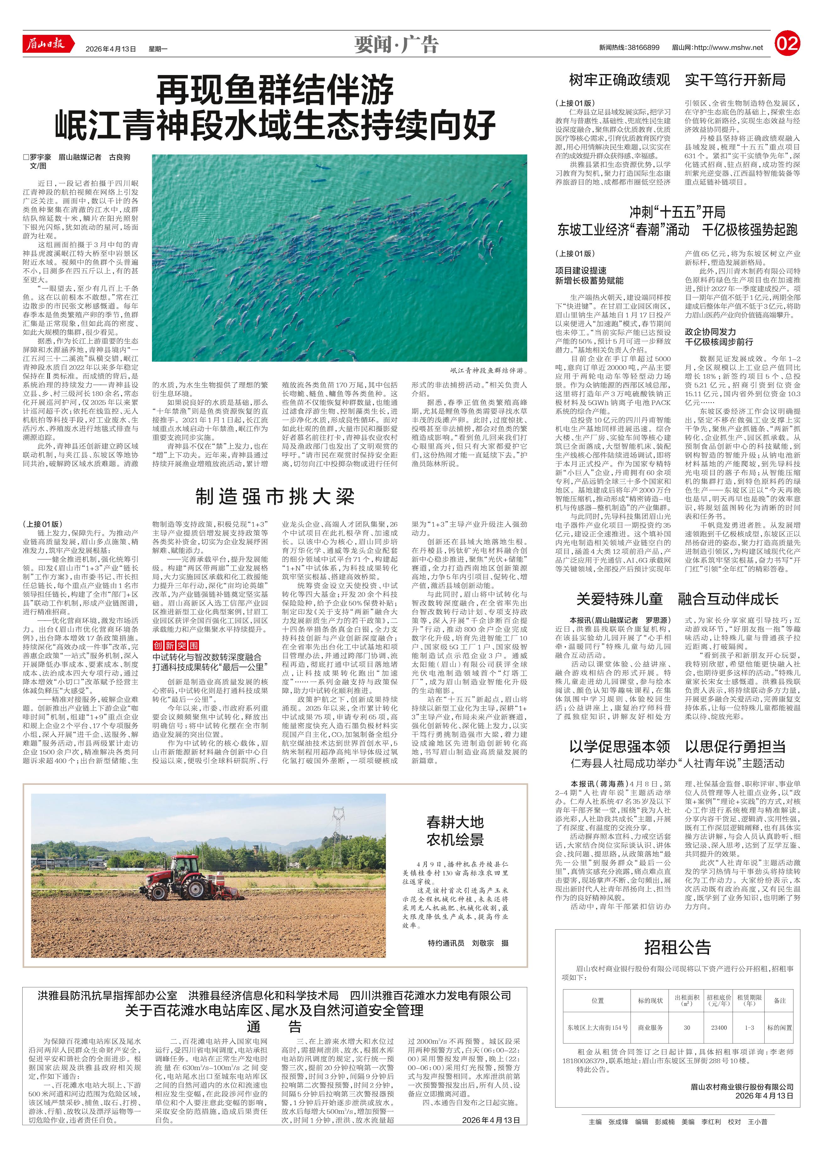 <div style='font-size: 22px!important;line-height: 34px!important;text-align: justify!important;color: #000!important'>春耕大地 农机绘景</div><div style='font-size: 14px!important;line-height: 22px!important;text-align: left!important;color: #777!important;margin-top: 20px;'>眉山日报  2026-04-13</div><div><img id='paperImg' style='max-width: 100%;height: auto' src='//img.founderfx.cn/epaper/202604/13/3b5eea7a9ce045099d9baeaec8407725/2.jpg' alt='' class='page-img'/></div><div style='font-size: 14px!important;line-height: 22px!important;text-align: center!important;color: #777!important;'><img src='//img.founderfx.cn/epaper/202604/13/3b5eea7a9ce045099d9baeaec8407725/02/260413b-2_s.jpg'style='display: block!important;margin: auto!important;max-width: 100%!important;'/></div><p> 4月9日,播种机在丹棱县仁美镇桂香村130亩高标准农田里往返穿梭。</p><p> 这是该村首次引进高产玉米示范全程机械化种植,未来还将采用无人机施肥、机械化收割,最大限度降低生产成本,提高作业效率。</p><p> 特约通讯员 刘敬宗 摄</p>
