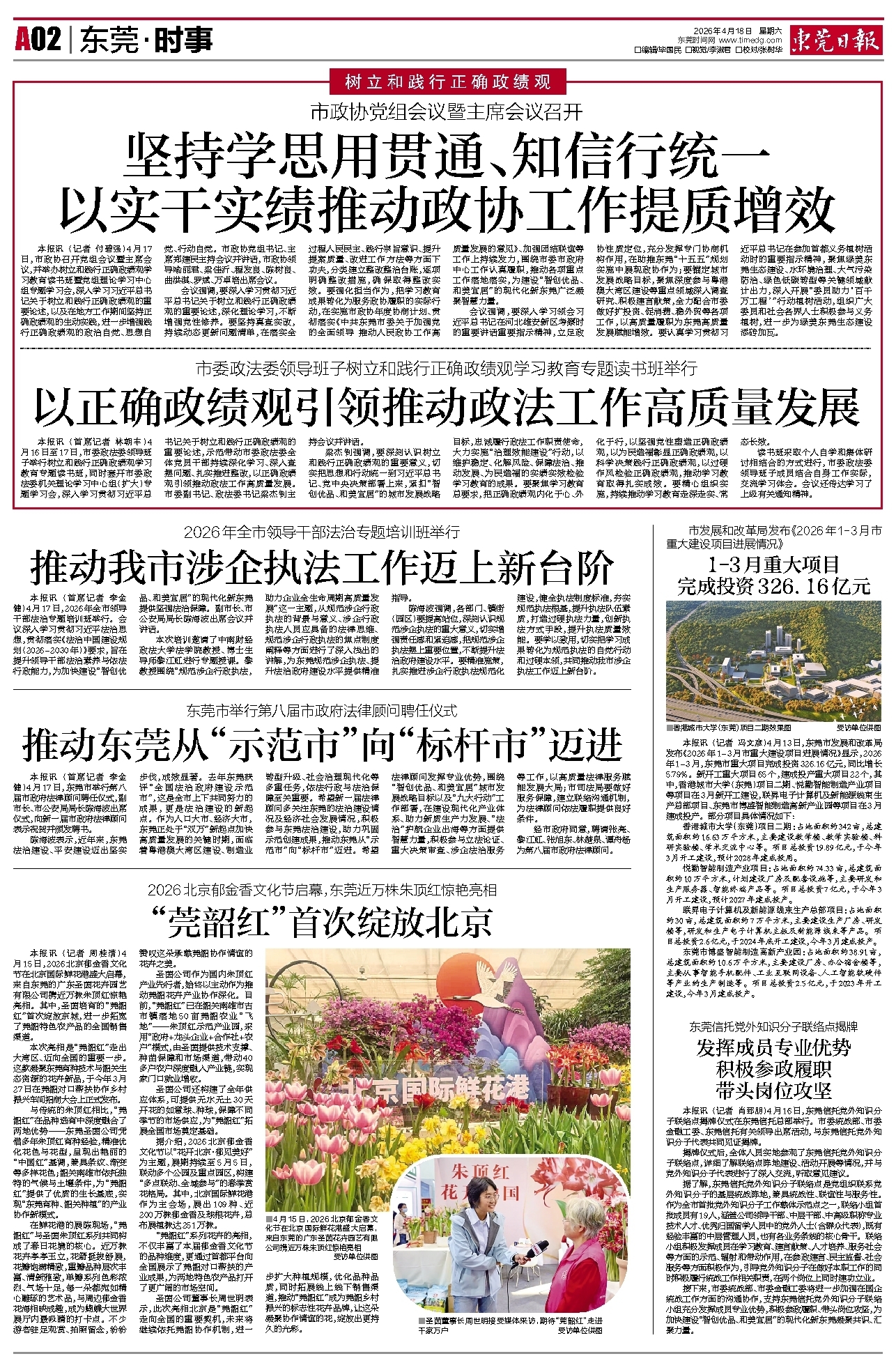 <div style='font-size: 16px!important;line-height: 28px!important;text-align: justify;color: #777!important;'>市发展和改革局发布《2026年1-3月市重大建设项目进展情况》</div><div style='font-size: 22px!important;line-height: 34px!important;text-align: justify!important;color: #000!important'>1-3月重大项目 完成投资326.16亿元</div><div style='font-size: 14px!important;line-height: 22px!important;text-align: left!important;color: #777!important;margin-top: 20px;'>东莞日报  记者 冯文彦  2026-04-18</div><div><img id='paperImg' style='max-width: 100%;height: auto' src='//img.founderfx.cn/epaper/202604/18/7d79e9c8babd45f6b3538b7cd98dd753/2.jpg' alt='' class='page-img'/></div><div style='font-size: 14px!important;line-height: 22px!important;text-align: center!important;color: #777!important;'><img src='//img.founderfx.cn/epaper/202604/18/7d79e9c8babd45f6b3538b7cd98dd753/A02/22325878_sm1_1776427604936_s.jpg'style='display: block!important;margin: auto!important;max-width: 100%!important;'/> ■香港城市大学(东莞)项目二期效果图 受访单位供图</div><p> </p><p> </p><p> 本报讯 4月13日,东莞市发展和改革局发布《2026年1-3月市重大建设项目进展情况》显示,2026年1-3月,东莞市重大项目完成投资326.16亿元,同比增长5.79%。新开工重大项目65个,建成投产重大项目22个,其中,香港城市大学(东莞)项目二期、悦勤智能制造产业项目等项目在3月新开工建设,联昇电子计算机及新能源线束生产总部项目、东莞市博盛智能制造高新产业园等项目在3月建成投产。部分项目具体情况如下:</p><p> 香港城市大学(东莞)项目二期:占地面积约342亩,总建筑面积约16.63万平方米,主要建设教学楼、教学实验楼、科研实验楼、学术交流中心等。项目总投资19.89亿元,于今年3月开工建设,预计2028年建成投用。</p><p> 悦勤智能制造产业项目:占地面积约74.33亩,总建筑面积约10万平方米,计划建设厂房及配套设施等,主要研发和生产服务器、智能终端产品等。项目总投资7亿元,于今年3月开工建设,预计2027年建成投产。</p><p> 联昇电子计算机及新能源线束生产总部项目:占地面积约30亩,总建筑面积约7万平方米,主要建设生产厂房、研发楼等,研发和生产电子计算机主板及新能源线束等产品。项目总投资2.6亿元,于2024年底开工建设,今年3月建成投产。</p><p> 东莞市博盛智能制造高新产业园:占地面积约38.91亩,总建筑面积约10.6万平方米,主要建设厂房、办公宿舍楼等,主要从事智能手机配件、工业互联网设备、人工智能软硬件等产业的生产制造等。项目总投资2.5亿元,于2023年开工建设,今年3月建成投产。</p>