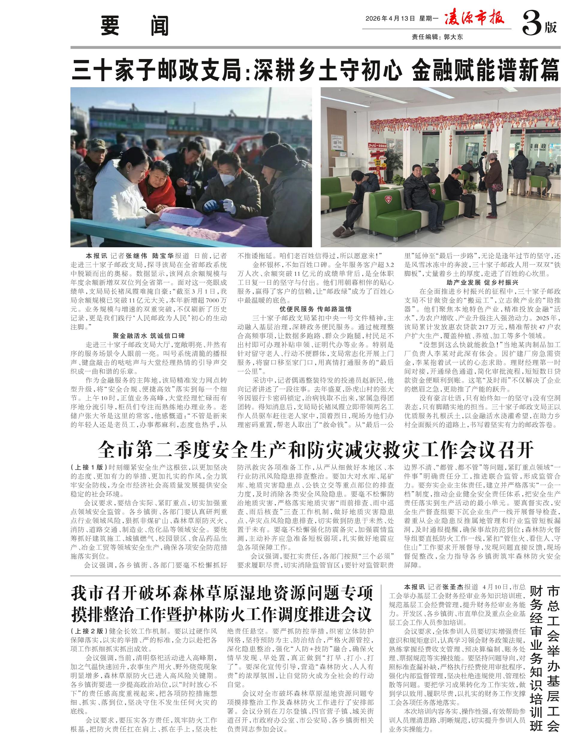 <div style='font-size: 22px!important;line-height: 34px!important;text-align: justify!important;color: #000!important'>全市第二季度安全生产和防灾减灾救灾工作会议召开</div><div style='font-size: 14px!important;line-height: 22px!important;text-align: left!important;color: #777!important;margin-top: 20px;'>凌源市报  2026-04-13</div><div><img id='paperImg' style='max-width: 100%;height: auto' src='//img.founderfx.cn/epaper/202604/19/4dd2f61687af4aaca8a187ffb1ba181b/3.jpg' alt='' class='page-img'/></div><p>本报讯 记者朱荣家报道 4月10日,在收听收看朝阳市安全生产和防灾减灾救灾视频会议后,我市接续召开全市第二季度安全生产和防灾减灾救灾工作会议,贯彻落实省、朝阳市会议精神,分析研判当前安全形势,部署第二季度重点工作。市委副书记、代市长于雪曦主持会议并讲话。</p><p>会议指出,当前,安全防控和防灾减灾救灾工作形势依然严峻复杂,容不得丝毫麻痹松懈。全市上下要提高政治站位,贯彻落实省、朝阳市关于安全生产工作和防灾减灾救灾工作会议精神,时刻绷紧安全生产这根弦,以更加坚决的态度、更加有力的举措、更加扎实的作风,全力筑牢安全防线,为全市经济社会高质量发展提供安全稳定的社会环境。</p><p>会议要求,要结合实际、紧盯重点,切实加强重点领域安全监管。各乡镇街、各部门要认真研判重点行业领域风险,狠抓非煤矿山、森林草原防灭火、消防、道路交通、制造业、危化品等领域安全。要统筹抓好建筑施工、城镇燃气、校园景区、食品药品生产、冶金工贸等领域安全生产,确保各项安全防范措施落实到位。</p><p>会议强调,各乡镇街、各部门要毫不松懈抓好防汛救灾各项准备工作,从严从细做好本地区、本行业防汛风险隐患排查整治。要加大对水库、尾矿库、地质灾害隐患点、公铁立交等重点部位的排查力度,及时消除各类安全风险隐患。要毫不松懈防治地质灾害,严格落实地质灾害“雨前排查、雨中巡查、雨后核查”三查工作机制,做好地质灾害隐患点、孕灾点风险隐患排查,切实做到防患于未然、处置于未有。要毫不松懈强化防震备灾,加强震情监测,主动补齐应急准备短板弱项,扎实做好地震应急各项保障工作。</p><p>会议强调,要扛实责任,各部门按照“三个必须”要求履职尽责,切实消除监管盲区;要针对监管职责边界不清、“都管、都不管”等问题,紧盯重点领域“一件事”明确责任分工,推进联合监管,形成监管合力。要夯实企业主体责任,建立并严格落实“一企一档”制度,推动企业健全安全责任体系,把安全生产责任落实到生产活动的最小单元。要真督实改,安全生产督查组要下沉企业生产一线开展督导检查,着重从企业隐患反推属地管理和行业监管短板漏洞,及时通报提醒,确保事故防范到位;森林防火督导组要直抵防火工作一线,紧扣“管住火、看住人、守住山”工作要求开展督导,发现问题直接反馈,现场督促整改,全力指导各乡镇街筑牢森林防火安全屏障。</p>