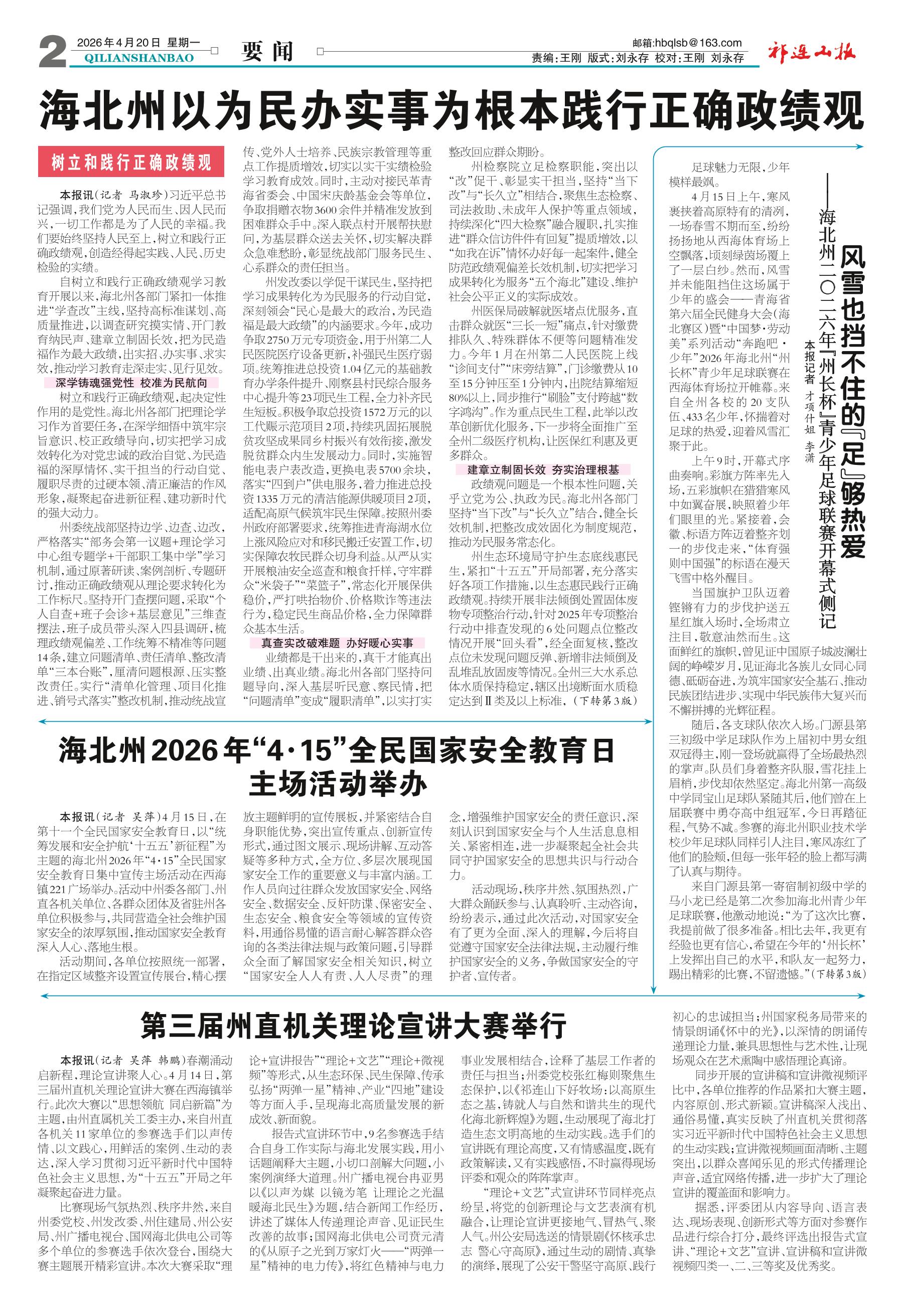 <div style='font-size: 22px!important;line-height: 34px!important;text-align: justify!important;color: #000!important'>风雪也挡不住的“足”够热爱</div><div style='font-size: 16px!important;line-height: 28px!important;text-align: justify;color: #777!important;margin-top: 20px;'>——海北州二〇二六年“州长杯”青少年足球联赛开幕式侧记</div><div style='font-size: 14px!important;line-height: 22px!important;text-align: left!important;color: #777!important;margin-top: 20px;'>祁连山报  2026-04-20</div><div><img id='paperImg' style='max-width: 100%;height: auto' src='//img.founderfx.cn/epaper/202604/20/fe7c4c20327d463aaf56d4cb306b75de/2.jpg' alt='' class='page-img'/></div><p> 本报记者 才项什姐 李潇</p><p> 足球魅力无限,少年模样最飒。</p><p> 4月15日上午,寒风裹挟着高原特有的清冽,一场春雪不期而至,纷纷扬扬地从西海体育场上空飘落,顷刻绿茵场覆上了一层白纱。然而,风雪并未能阻挡住这场属于少年的盛会——青海省第六届全民健身大会(海北赛区)暨“中国梦·劳动美”系列活动“奔跑吧・少年”2026年海北州“州长杯”青少年足球联赛在西海体育场拉开帷幕。来自全州各校的20支队伍、433名少年,怀揣着对足球的热爱,迎着风雪汇聚于此。</p><p> 上午9时,开幕式序曲奏响。彩旗方阵率先入场,五彩旗帜在猎猎寒风中如翼奋展,映照着少年们眼里的光。紧接着,会徽、标语方阵迈着整齐划一的步伐走来,“体育强则中国强”的标语在漫天飞雪中格外醒目。</p><p> 当国旗护卫队迈着铿锵有力的步伐护送五星红旗入场时,全场肃立注目,敬意油然而生。这面鲜红的旗帜,曾见证中国原子城波澜壮阔的峥嵘岁月,见证海北各族儿女同心同德、砥砺奋进,为筑牢国家安全基石、推动民族团结进步、实现中华民族伟大复兴而不懈拼搏的光辉征程。</p><p> 随后,各支球队依次入场。门源县第三初级中学足球队作为上届初中男女组双冠得主,刚一登场就赢得了全场最热烈的掌声。队员们身着整齐队服,雪花挂上眉梢,步伐却依然坚定。海北州第一高级中学同宝山足球队紧随其后,他们曾在上届联赛中勇夺高中组冠军,今日再踏征程,气势不减。参赛的海北州职业技术学校少年足球队同样引人注目,寒风冻红了他们的脸颊,但每一张年轻的脸上都写满了认真与期待。</p><p> 来自门源县第一寄宿制初级中学的马小龙已经是第二次参加海北州青少年足球联赛,他激动地说:“为了这次比赛,我提前做了很多准备。相比去年,我更有经验也更有信心,希望在今年的‘州长杯’上发挥出自己的水平,和队友一起努力,踢出精彩的比赛,不留遗憾。”(下转第3版)</p>