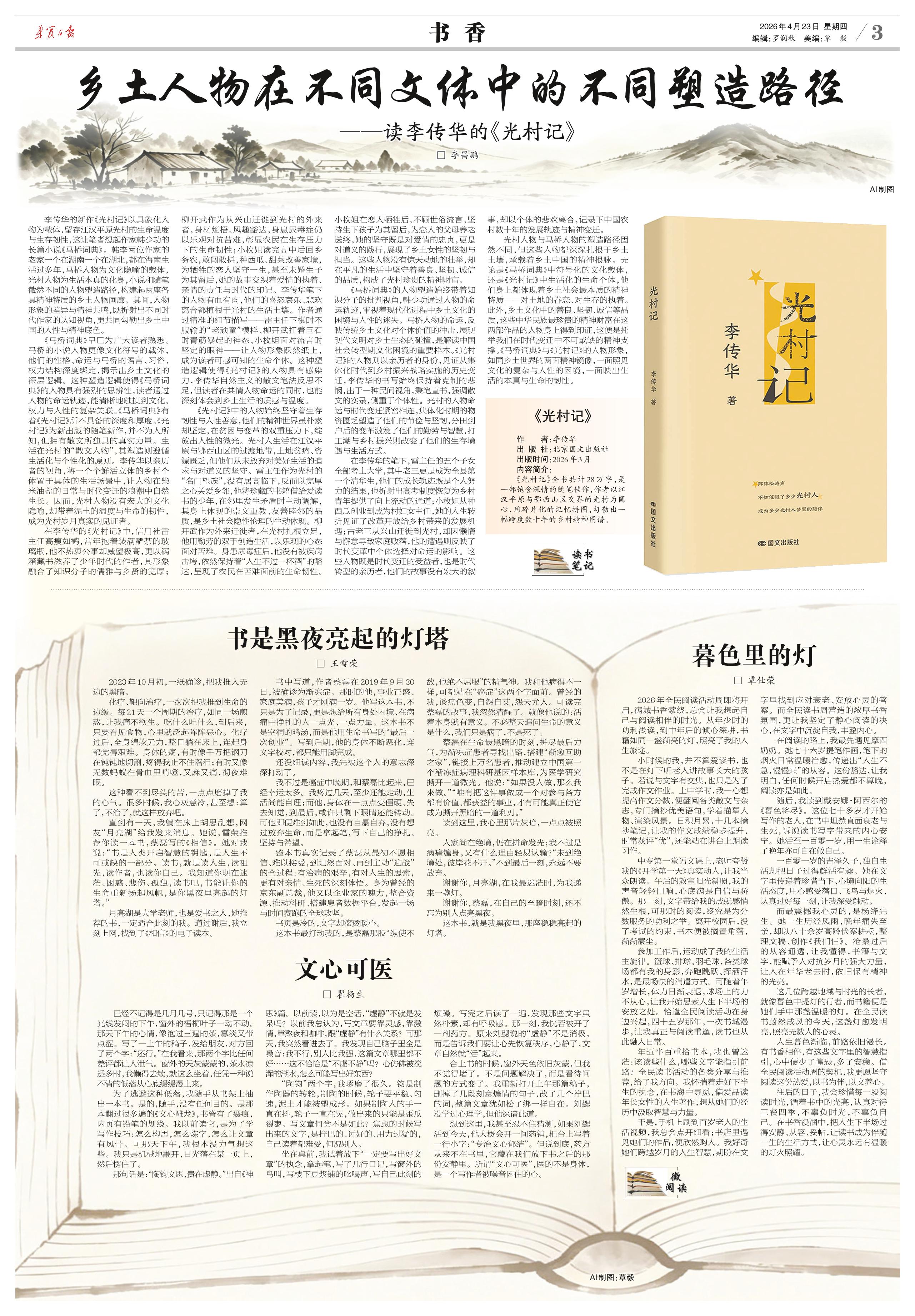 <div style='font-size: 22px!important;line-height: 34px!important;text-align: justify!important;color: #000!important'>暮色里的灯</div><div style='font-size: 14px!important;line-height: 22px!important;text-align: left!important;color: #777!important;margin-top: 20px;'>来宾日报  □ 覃仕荣  2026-04-23</div><div><img id='paperImg' style='max-width: 100%;height: auto' src='//img.founderfx.cn/epaper/202604/23/7b13819c4df048c0a7cda544f8df4325/3.jpg' alt='' class='page-img'/></div><p> 2026年全民阅读活动周即将开启,满城书香萦绕,总会让我想起自己与阅读相伴的时光。从年少时的功利浅读,到中年后的倾心深耕,书籍如同一盏渐亮的灯,照亮了我的人生旅途。</p><p> 小时候的我,并不算爱读书,也不是在灯下听老人讲故事长大的孩子。若说与文字有交集,也只是为了完成作文作业。上中学时,我一心想提高作文分数,便翻阅各类散文与杂志,专门摘抄优美语句,学着描摹人物、渲染风景。日积月累,十几本摘抄笔记,让我的作文成绩稳步提升,时常获评“优”,还能站在讲台上朗读习作。</p><p> 中专第一堂语文课上,老师夸赞我的《开学第一天》真实动人,让我当众朗读。午后的教室阳光斜照,我的声音轻轻回响,心底满是自信与骄傲。那一刻,文字带给我的成就感悄然生根,可那时的阅读,终究是为分数服务的功利之举。离开校园后,没了考试的约束,书本便被搁置角落,渐渐蒙尘。</p><p> 参加工作后,运动成了我的生活主旋律。篮球、排球、羽毛球,各类球场都有我的身影,奔跑跳跃、挥洒汗水,是最畅快的消遣方式。可随着年岁增长,体力日渐衰退,球场上的力不从心,让我开始思索人生下半场的安放之处。恰逢全民阅读活动在身边兴起,四十五岁那年,一次书城漫步,让我真正与阅读重逢,读书也从此融入日常。</p><p> 年近半百重拾书本,我也曾迷茫:该读些什么,哪些文字能指引前路?全民读书活动的各类分享与推荐,给了我方向。我怀揣着走好下半生的执念,在书海中寻觅,偏爱品读年长女性的人生著作,想从她们的经历中汲取智慧与力量。</p><p> 于是,手机上刷到百岁老人的生活视频,我总会点开细看;书店里遇见她们的作品,便欣然购入。我好奇她们跨越岁月的人生智慧,期盼在文字里找到应对衰老、安放心灵的答案。而全民读书周营造的浓厚书香氛围,更让我坚定了静心阅读的决心,在文字中沉淀自我,丰盈内心。</p><p> 在阅读的路上,我最先遇见摩西奶奶。她七十六岁提笔作画,笔下的烟火日常温暖治愈,传递出“人生不急,慢慢来”的从容。这份豁达,让我明白,任何时候开启热爱都不算晚,阅读亦是如此。</p><p> 随后,我读到戴安娜·阿西尔的《暮色将尽》。这位七十多岁才开始写作的老人,在书中坦然直面衰老与生死,诉说读书写字带来的内心安宁。她活至一百零一岁,用一生诠释了晚年亦可自在做自己。</p><p> 一百零一岁的吉泽久子,独自生活却把日子过得鲜活有趣。她在文字里传递着珍惜当下、心境向阳的生活态度,用心感受落日、飞鸟与烟火,认真过好每一刻,让我深受触动。</p><p> 而最震撼我心灵的,是杨绛先生。她一生历经风雨,晚年痛失至亲,却以八十余岁高龄伏案耕耘,整理文稿、创作《我们仨》。沧桑过后的从容通透,让我懂得,书籍与文字,能赋予人对抗岁月的强大力量,让人在年华老去时,依旧保有精神的光亮。</p><p> 这几位跨越地域与时光的长者,就像暮色中提灯的行者,而书籍便是她们手中那盏温暖的灯。在全民读书蔚然成风的今天,这盏灯愈发明亮,照亮无数人的心灵。</p><p> 人生暮色渐临,前路依旧漫长。有书香相伴,有这些文字里的智慧指引,心中便少了惶恐,多了安稳。借全民阅读活动周的契机,我更愿坚守阅读这份热爱,以书为伴,以文养心。</p><p> 往后的日子,我会珍惜每一段阅读时光,循着书中的光亮,认真对待三餐四季,不辜负时光,不辜负自己。在书香浸润中,把人生下半场过得安静、从容、妥帖,让读书成为伴随一生的生活方式,让心灵永远有温暖的灯火照耀。</p>