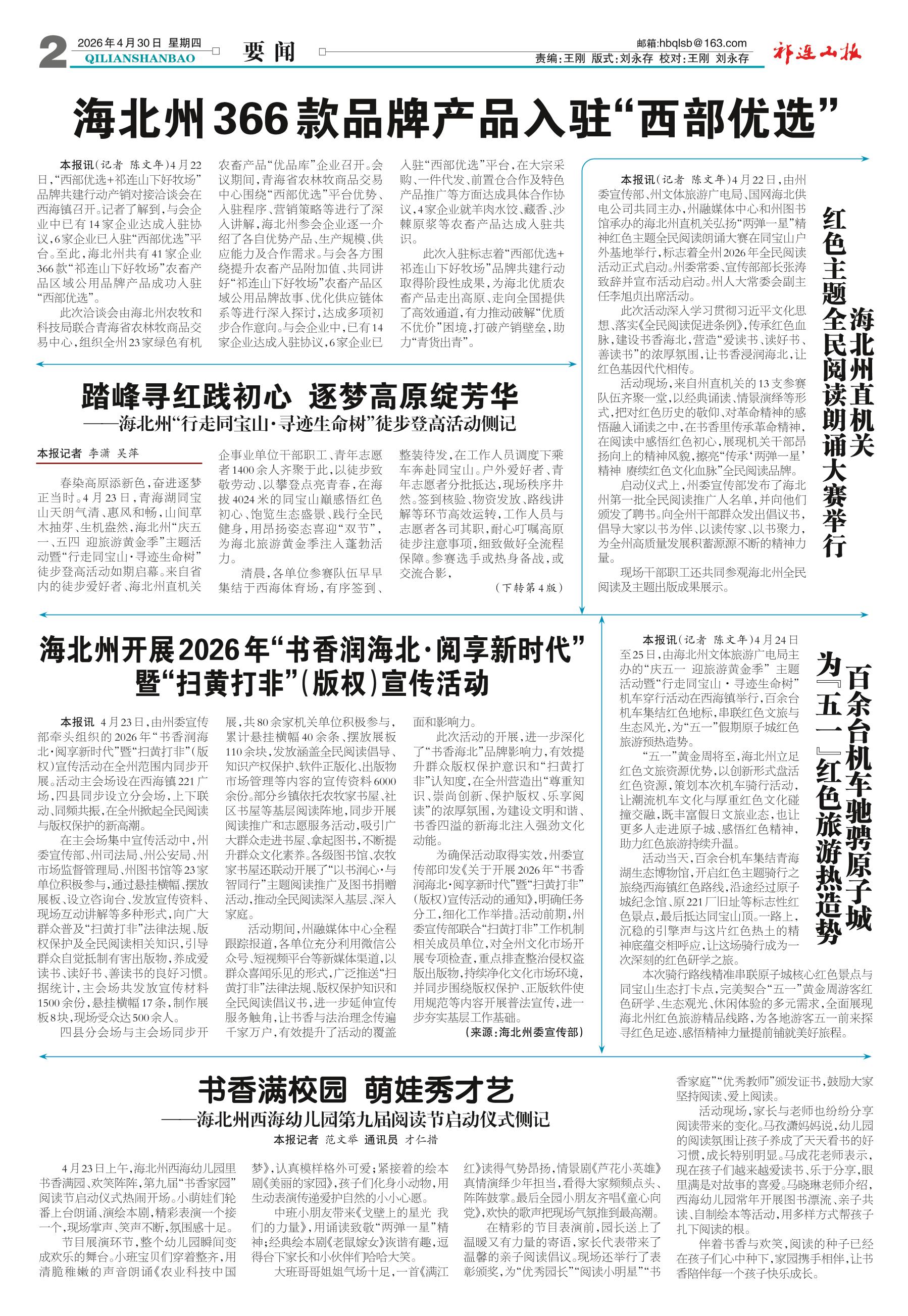 <div style='font-size: 22px!important;line-height: 34px!important;text-align: justify!important;color: #000!important'>海北州直机关 红色主题全民阅读朗诵大赛举行</div><div style='font-size: 14px!important;line-height: 22px!important;text-align: left!important;color: #777!important;margin-top: 20px;'>祁连山报  2026-04-30</div><div><img id='paperImg' style='max-width: 100%;height: auto' src='//img.founderfx.cn/epaper/202604/29/9f06b972088c470f97bcbffe0ead48ce/2.jpg' alt='' class='page-img'/></div><p> 本报讯(记者 陈文年)4月22日,由州委宣传部、州文体旅游广电局、国网海北供电公司共同主办,州融媒体中心和州图书馆承办的海北州直机关弘扬“两弹一星”精神红色主题全民阅读朗诵大赛在同宝山户外基地举行,标志着全州2026年全民阅读活动正式启动。州委常委、宣传部部长张涛致辞并宣布活动启动。州人大常委会副主任李旭贞出席活动。</p><p> 此次活动深入学习贯彻习近平文化思想、落实《全民阅读促进条例》,传承红色血脉,建设书香海北,营造“爱读书、读好书、善读书”的浓厚氛围,让书香浸润海北,让红色基因代代相传。</p><p> 活动现场,来自州直机关的13支参赛队伍齐聚一堂,以经典诵读、情景演绎等形式,把对红色历史的敬仰、对革命精神的感悟融入诵读之中,在书香里传承革命精神,在阅读中感悟红色初心,展现机关干部昂扬向上的精神风貌,擦亮“传承‘两弹一星’精神 赓续红色文化血脉”全民阅读品牌。</p><p> 启动仪式上,州委宣传部发布了海北州第一批全民阅读推广人名单,并向他们颁发了聘书。向全州干部群众发出倡议书,倡导大家以书为伴、以读传家、以书聚力,为全州高质量发展积蓄源源不断的精神力量。</p><p> 现场干部职工还共同参观海北州全民阅读及主题出版成果展示。</p>