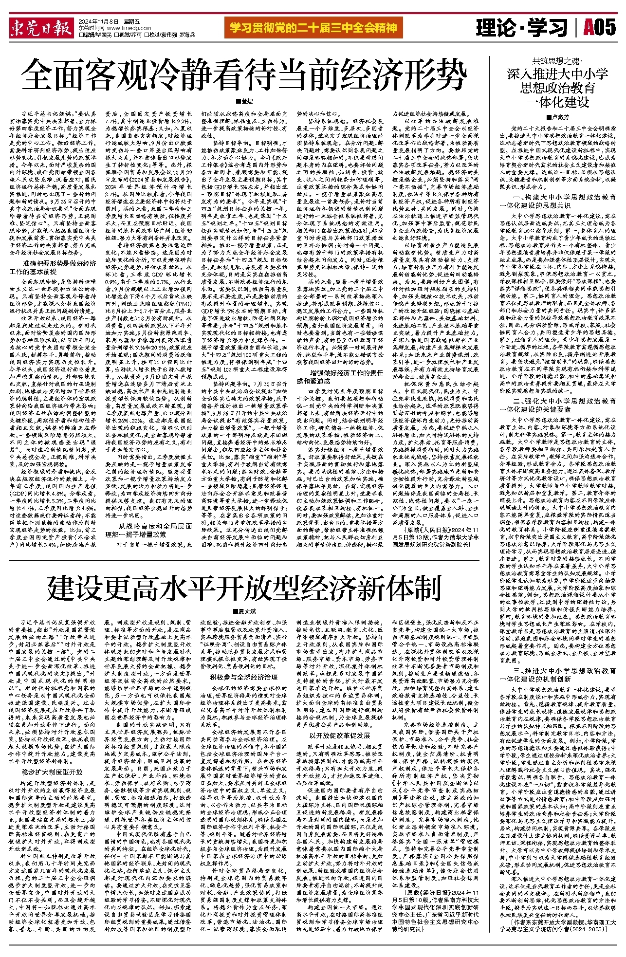 <div style='font-size: 22px!important;line-height: 34px!important;text-align: justify!important;color: #000!important'>全面客观冷静看待当前经济形势</div><div style='font-size: 14px!important;line-height: 22px!important;text-align: left!important;color: #777!important;margin-top: 20px;'>东莞日报  ■董煜  2024-11-08</div><div><img id='paperImg' style='max-width: 100%;height: auto' src='//img.founderfx.cn/epaper/202411/08/dc38a0ccb30944edb0acba1cf0cd3460/5.jpg' alt='' class='page-img'/></div><p> 习近平总书记强调:“要认真贯彻落实党中央决策部署,全力抓好第四季度经济工作,努力实现全年经济社会发展目标。”经济工作是党的中心工作。做好经济工作,需要科学研判经济形势,提出适应形势变化、引领发展走势的政策举措。今年以来,面对严峻复杂的国内外环境,我们党团结带领全国各族人民攻坚克难、沉着应对,国民经济运行总体平稳,高质量发展扎实推进,同时也出现了一些新的问题和新的情况。9月26日召开的中共中央政治局会议要求“全面客观冷静看待当前经济形势,正视困难、坚定信心”。只有坚持全面客观冷静,才能深入把握我国经济全貌和发展前景、贯彻落实党中央关于经济工作的决策部署,努力完成全年经济社会发展目标任务。</p><p> 准确把握形势是做好经济工作的基本前提</p><p> 全面客观冷静,是坚持辩证唯物主义这一世界观和方法论的体现。只有坚持全面客观冷静看待经济形势,才能深入分析我国经济运行状况并真正把问题剖析清楚。</p><p> 改革开放以来,我国经济一路都是爬坡过坎走过来的。新时代以来,面对纷繁复杂的国内国际形势和各种风险挑战,以习近平同志为核心的党中央团结带领全党全国人民,拼搏奋斗、勇毅前行,推动我国经济实力实现历史性跃升。今年以来,我国经济运行面临着更加严峻复杂的情况。外部环境变乱交织,直接针对我国的打压遏制加剧,地缘政治变化增加了世界经济的脆弱性,主要经济体的宏观政策转向给我国经济运行带来影响;我国经济正处在结构调整转型的关键阶段,周期性矛盾和结构性矛盾相互交织,调整的阵痛正在释放,一些领域风险隐患仍然较大,不同主体的微观感受出现“温差”。而对这些新情况新问题,党中央总揽全局,正视困难,科学决策,及时加强宏观调控。</p><p> 经济领域的矛盾和挑战,会反映在短期经济运行的数据上。今年前三季度,我国国内生产总值(GDP)同比增长4.8%。分季度看,一季度同比增长5.3%,二季度同比增长4.7%,三季度同比增长4.6%。对这些数据我们要辩证看待,不能简单把个别数据的波动作为判断宏观经济走势的依据。比如,前三季度全国固定资产投资(不含农户)同比增长3.4%,扣除房地产投资后,全国固定资产投资增长7.7%,其中制造业投资增长9.2%,为稳增长夯实根基;又如,入夏以来,我国自然灾害频发,对经济运行造成较大影响,9月份出口数据的变动与一些口岸受台风影响有很大关系,并不意味着出口形势发生了转折性变化;等等。此外,根据联合国贸易和发展会议10月29日发布的《2024贸易和发展报告》,2024年世界经济预计将增长2.7%。从国际比较来看,今年我国经济增速在主要经济体中仍将处于前列。总的来看,我国二季度和三季度增长虽然略有波动,但幅度并不大,而且在预期目标附近。我国经济的基本面及市场广阔、经济韧性强、潜力大等有利条件并未改变。</p><p> 看待经济数据也要注意边际变化,不能只看静态。这是因为对边际变化的分析,可以更精准研判经济走势趋势,评估政策效果。从环比看,三季度GDP环比增长0.9%,高于二季度的0.7%。从行业看,9月份规模以上工业增加值同比增速在下滑4个月以后首次止跌回升,制造业采购经理指数(PMI)比8月份上升0.7个百分点,服务业生产指数也比8月份有所提升。从消费看,以旧换新政策从下半年开始加力实施,9月份新能源乘用车、家用电器和音像器材类商品零售量分别增长51%和20.5%,政策效应开始显现;国庆期间的消费活跃程度明显上升,按可比口径同比计算,出游收入增长快于出游人数增长。从投资看,9月份固定资产投资增速在连续多月下滑后首次止跌回稳,高技术产业和先进制造业投资增长保持较快态势。从创新看,高质量发展成效不断显现,前三季度集成电路产量、出口额分别增长26%、22%。这些都是我国经济出现的积极变化。准确认识到这些积极变化,是全面客观冷静看待我国经济形势的应有之义,有利于更加坚定信心。</p><p> 同时需要指出,三季度数据主要反映的是一揽子增量政策发布之前的经济运行情况。随着存量政策和一揽子增量政策持续发力显效,发展的活力和动力将进一步释放,为四季度经济持续回升向好提供足够支撑。我们有充足的理由相信,我国经济企稳回升的态势将进一步巩固。</p><p> 从战略高度和全局层面理解一揽子增量政策</p><p> 对于当前一揽子增量政策,我们必须从战略高度和全局层面完整准确理解,抓住重点、主动作为,进一步提高政策措施的针对性、有效性。</p><p> 坚持目标导向。目标明确,才能推动政策聚焦发力、工作加倍努力、各方面齐心协力。今年《政府工作报告》综合考虑国内外形势和各方面因素,兼顾需要和可能,提出了全年发展主要预期目标,其中包括GDP增长5%左右,并指出这一预期目标“体现了积极进取、奋发有为的要求”。今年是实现“十四五”规划目标任务的关键一年,明年是收官之年、