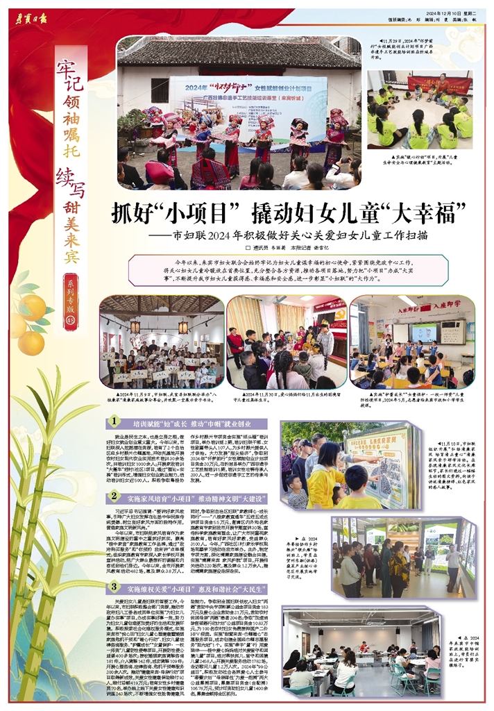 <div style='font-size: 22px!important;line-height: 34px!important;text-align: justify!important;color: #000!important'>抓好“小项目” 撬动妇女儿童“大幸福”</div><div style='font-size: 16px!important;line-height: 28px!important;text-align: justify;color: #777!important;margin-top: 20px;'>——市妇联2024年积极做好关心关爱妇女儿童工作扫描</div><div style='font-size: 14px!important;line-height: 22px!important;text-align: left!important;color: #777!important;margin-top: 20px;'>来宾日报  □ 通讯员 韦丽菊 本报记者 谢雪忆  2024-12-10</div><div><img id='paperImg' style='max-width: 100%;height: auto' src='//img.founderfx.cn/epaper/202412/10/8b49ab953ecb412aa6984b9a92a56788/8.jpg' alt='' class='page-img'/></div><div style='font-size: 14px!important;line-height: 22px!important;text-align: center!important;color: #777!important;'><img src='//img.founderfx.cn/epaper/202412/10/8b49ab953ecb412aa6984b9a92a56788/08/2024年11月29日,2024年“怀梦前行”女性赋能创业计划项目广西非遗手工艺技能培训班在忻城开班_s.jpg'style='display: block!important;margin: auto!important;max-width: 100%!important;'/> 11月29日,2024年“怀梦前行”女性赋能创业计划项目广西非遗手工艺技能培训班在忻城县开班。<img src='//img.founderfx.cn/epaper/202412/10/8b49ab953ecb412aa6984b9a92a56788/08/实施“暖心行动”项目,开展“儿童生命安全与心理健康教育”主题活动_s.jpg'style='display: block!important;margin: auto!important;max-width: 100%!important;'/> 实施“暖心行动”项目,开展“儿童生命安全与心理健康教育”主题活动。<img src='//img.founderfx.cn/epaper/202412/10/8b49ab953ecb412aa6984b9a92a56788/08/2024年11月9日l来宾市妇联、武宣县妇联联合开展“八桂廉家”清廉家庭故事分享会,亲子活动书法展示。_s.jpg'style='display: block!important;margin: auto!important;max-width: 100%!important;'/> 2024年11月9日,市妇联、武宣县妇联联合举办“八桂廉家”清廉家庭故事分享会,并欢聚一堂展示亲子书法。<img src='//img.founderfx.cn/epaper/202412/10/8b49ab953ecb412aa6984b9a92a56788/08/2024年11月30日,开展“甜蜜来宾 巾帼暖心”_s.jpg'style='display: block!important;margin: auto!important;max-width: 100%!important;'/> 2024年11月30日,爱心妈妈们给11月出生的困境留守儿童过集体生日。<img src='//img.founderfx.cn/epaper/202412/10/8b49ab953ecb412aa6984b9a92a56788/08/实施“护蕾成长”“女童保护· 一校一师资”儿童防性侵项目_s.jpg'style='display: block!important;margin: auto!important;max-width: 100%!important;'/> 实施“护蕾成长”“女童保护· 一校一师资”儿童防性侵项目,2024年5月,志愿者给来宾市政和小学学生授课。<img src='//img.founderfx.cn/epaper/202412/10/8b49ab953ecb412aa6984b9a92a56788/08/11月10日,市妇联组织开展“弘扬清廉家风 培育清正童心”清廉家风亲子研学活动。_s.jpg'style='display: block!important;margin: auto!important;max-width: 100%!important;'/> 11月10日,市妇联组织开展“弘扬清廉家风 培育清正童心”清廉家风亲子研学活动。在参观清廉家风文化长廊环节,家长们通过一幅幅生动的图文资料,向孩子讲述清廉榜样、红色家风的感人故事。<img src='//img.founderfx.cn/epaper/202412/10/8b49ab953ecb412aa6984b9a92a56788/08/在2024年粤桂协作乡村振兴“领头雁”培训班上,学员在贺州东融(供港)蔬菜产业核心示范区实地教学_s.jpg'style='display: block!important;margin: auto!important;max-width: 100%!important;'/> 在2024年粤桂协作乡村振兴“领头雁”培训班上,学员在贺州东融(供港)蔬菜产业核心示范区开展实地学习交流。<img src='//img.founderfx.cn/epaper/202412/10/8b49ab953ecb412aa6984b9a92a56788/08/2024年来宾市巾帼家政技能培训班上,学员正在进行育婴实操练习_s.jpg'style='display: block!important;margin: auto!important;max-width: 100%!important;'/> 在2024年来宾市巾帼家政技能培训班上,学员们正在进行育婴实操练习。</div><p> 今年以来,来宾市妇女联合会始终牢记为妇女儿童谋幸福的初心使命,紧紧围绕党政中心工作,将关心妇女儿童冷暖放在首要位置,充分整合各方资源,推动各项目落地,努力把“小项目”办成“大实事”,不断提升我市妇女儿童获得感、幸福感和安全感,进一步彰显“小妇联”的“大作为”。</p><p> 培训赋能“她”成长 推动“巾帼”就业创业</p><p> 就业是民生之本,也是立身之根,做好妇女就业创业意义重大。今年以来,市妇联深入挖掘潜在资源,培育了2个自治区级乡村振兴巾帼基地,并依托基地开展农村妇女现代农业实用技术培训30余场次,共培训妇女1000余人;开展家政培训“大篷车”进村(社区)项目,通过“理论+实操”培训形式,增强妇女创业就业能力,活动培训妇女近500人。积极争取粤桂协作乡村振兴专项资金实施“领头雁”培训项目,举办培训班2期,培训妇联干部、女性致富带头人107人,为乡村振兴提供人才供给。大力发展“指尖经济”,争取到2024年“怀梦前行”女性赋能创业计划项目资金20万元,在忻城县举办广西非遗手工艺技能培训5期,培训女性壮锦传承人200人,进一步促进非遗手工艺的传承与发展。</p><p> 实施家风培育“小项目” 推动精神文明“大建设”</p><p> 习近平总书记强调:“要讲好家风故事,引导广大妇女发挥在弘扬中华民族传统美德、树立良好家风方面的独特作用,营造家庭文明新风尚。”</p><p> 今年以来,市妇联把家风培育作为家庭文明建设的重中之重抓好抓实。擦亮“桂中家音”家庭教育工作品牌,通过“政府购买服务”和“你预约 我来讲”点单模式,组织家庭教育