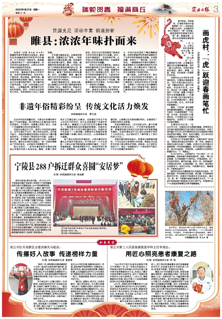 <div style='font-size: 22px!important;line-height: 34px!important;text-align: justify!important;color: #000!important'>宁陵县288户拆迁群众喜圆“安居梦”</div><div style='font-size: 14px!important;line-height: 22px!important;text-align: left!important;color: #777!important;margin-top: 20px;'>商丘日报云阅读  文/图 本报融媒体记者 高会鹏  2025-01-27</div><div><img id='paperImg' style='max-width: 100%;height: auto' src='//img.founderfx.cn/epaper/202501/27/4958f1d8425b4d56b36dfc42aee2f139/3.jpg' alt='' class='page-img'/></div><div style='font-size: 14px!important;line-height: 22px!important;text-align: center!important;color: #777!important;'><img src='//img.founderfx.cn/epaper/202501/27/4958f1d8425b4d56b36dfc42aee2f139/03/2389678_gm_1737897338532_s.jpg'style='display: block!important;margin: auto!important;max-width: 100%!important;'/> ①<img src='//img.founderfx.cn/epaper/202501/27/4958f1d8425b4d56b36dfc42aee2f139/03/2389680_gm_1737897218783_s.jpg'style='display: block!important;margin: auto!important;max-width: 100%!important;'/> ②<img src='//img.founderfx.cn/epaper/202501/27/4958f1d8425b4d56b36dfc42aee2f139/03/2389682_gm_1737880890027_s.jpg'style='display: block!important;margin: auto!important;max-width: 100%!important;'/> ③</div><p> ①宁陵县城关镇宁安新城3号地安置房抽签分配现场。</p><p> ②安置户登记入场。</p><p> ③安置户现场抽签选房。</p><p> 新年分新房,群众笑开颜。1月24日上午,宁陵县城关镇宁安新城3号地两个户型安置房抽签分配仪式圆满完成,288户居民圆梦新居。</p><p> 当日,葛天大剧院内人头攒动、喜气洋洋,城关镇288户拆迁群众怀着满心的期待与喜悦,在此参加安置房抽签仪式,即将喜迁新居。</p><p> 据了解,本次分房坚持“公平公正、阳光透明”的原则,采取“全程录像、全场监督、现场确认”的形式,全力保障了安置户的利益。为确保分房工作公开、公平、公正进行,工作人员恪尽职守,仔细查验信息,并耐心引导居民有序排队,真正做到了让群众满意、放心。</p><p> 在抽签环节,居民按照顺序依次上台,在众人的注视下,从抽签箱中抽出属于自己的房号。每一个房号的抽出,都伴随着现场的一阵欢呼和掌声。抽到满意房号的群众,居民脸上绽放出灿烂的笑容,难掩内心的激动。一位拆迁户兴奋地说:“盼了这么久,终于等到这一天了。今天抽到的房子户型、楼层都很满意,以后的日子肯定会越来越好。”还有的居民表示,非常感谢党和政府的好政策,让他们能够住上宽敞明亮的新房子,生活有了新的起点。</p>