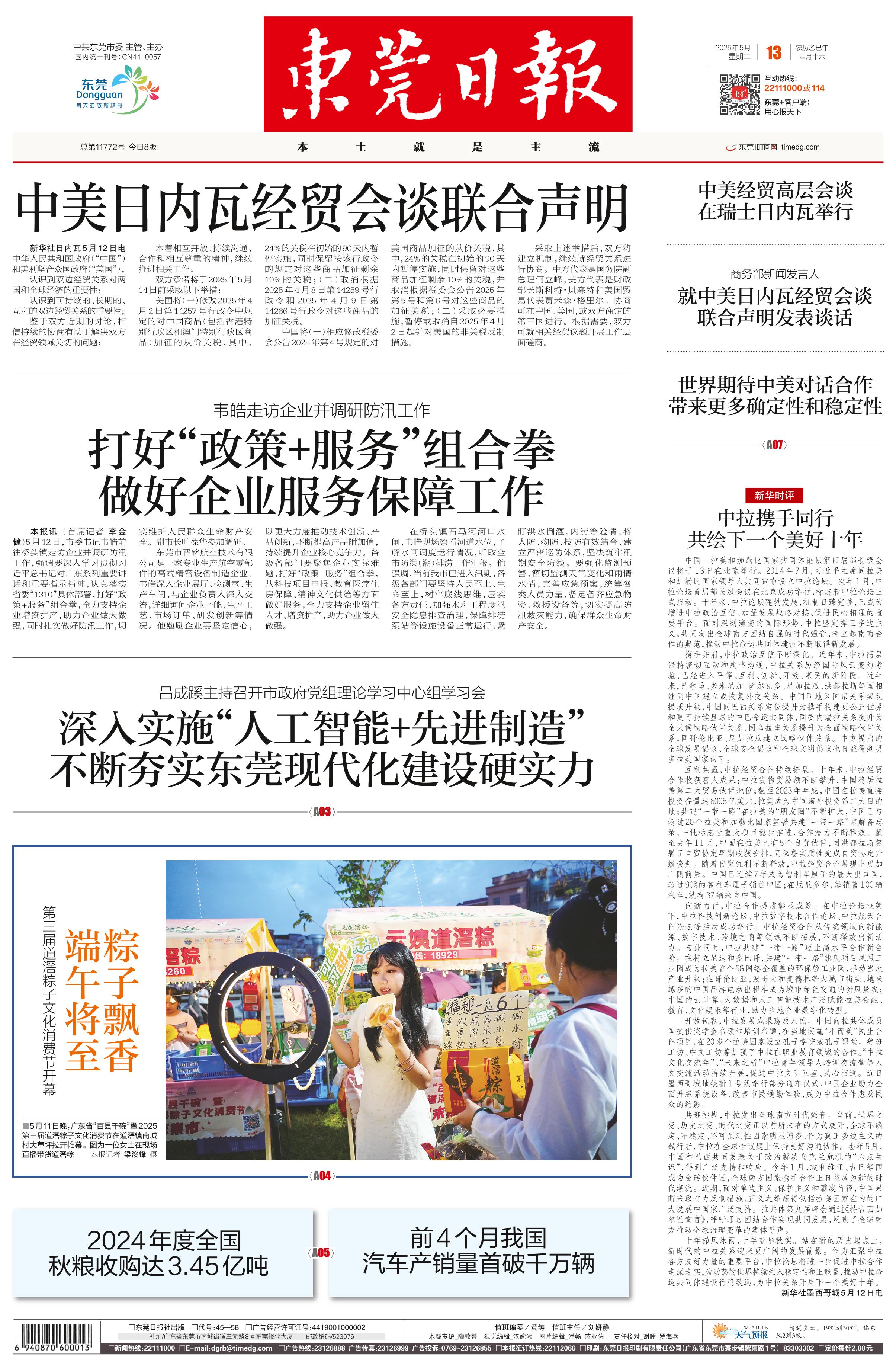 <div style='font-size: 22px!important;line-height: 34px!important;text-align: justify!important;color: #000!important'>中美日内瓦经贸会谈联合声明</div><div style='font-size: 14px!important;line-height: 22px!important;text-align: left!important;color: #777!important;margin-top: 20px;'>东莞日报  新华社日内瓦5月12日电  2025-05-13</div><div><img id='paperImg' style='max-width: 100%;height: auto' src='//img.founderfx.cn/epaper/202505/13/793744fcf33641128eb455d191720395/1.jpg' alt='' class='page-img'/></div><p> 中华人民共和国政府(“中国”)和美利坚合众国政府(“美国”),</p><p> 认识到双边经贸关系对两国和全球经济的重要性;</p><p> 认识到可持续的、长期的、互利的双边经贸关系的重要性;</p><p> 鉴于双方近期的讨论,相信持续的协商有助于解决双方在经贸领域关切的问题;</p><p> 本着相互开放、持续沟通、合作和相互尊重的精神,继续推进相关工作;</p><p> 双方承诺将于2025年5月14日前采取以下举措:</p><p> 美国将(一)修改2025年4月2日第14257号行政令中规定的对中国商品(包括香港特别行政区和澳门特别行政区商品)加征的从价关税,其中,24%的关税在初始的90天内暂停实施,同时保留按该行政令的规定对这些商品加征剩余10%的关税;(二)取消根据2025年4月8日第14259号行政令和2025年4月9日第14266号行政令对这些商品的加征关税。</p><p> 中国将(一)相应修改税委会公告2025年第4号规定的对美国商品加征的从价关税,其中,24%的关税在初始的90天内暂停实施,同时保留对这些商品加征剩余10%的关税,并取消根据税委会公告2025年第5号和第6号对这些商品的加征关税;(二)采取必要措施,暂停或取消自2025年4月2日起针对美国的非关税反制措施。</p><p> 采取上述举措后,双方将建立机制,继续就经贸关系进行协商。中方代表是国务院副总理何立峰,美方代表是财政部长斯科特·贝森特和美国贸易代表贾米森·格里尔。协商可在中国、美国,或双方商定的第三国进行。根据需要,双方可就相关经贸议题开展工作层面磋商。</p>