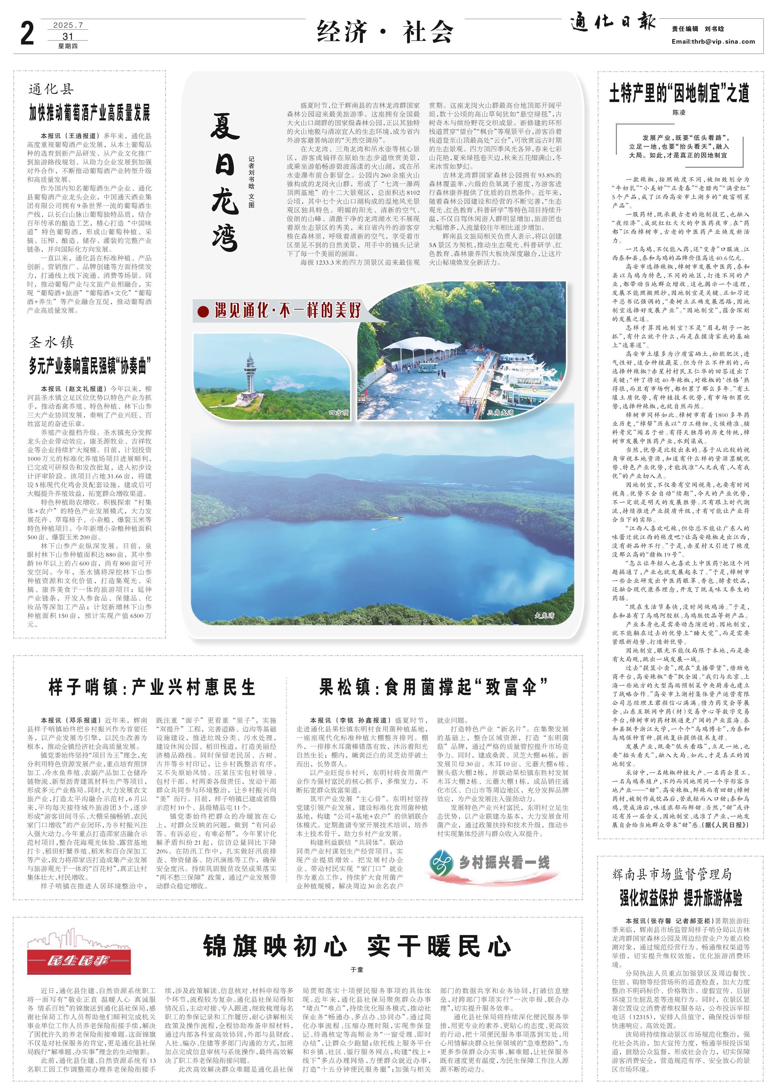 <div style='font-size: 22px!important;line-height: 34px!important;text-align: justify!important;color: #000!important'>夏日龙湾</div><div style='font-size: 14px!important;line-height: 22px!important;text-align: left!important;color: #777!important;margin-top: 20px;'>通化日报  2025-07-31</div><div><img id='paperImg' style='max-width: 100%;height: auto' src='//img.founderfx.cn/epaper/202507/31/2369a149541447949aa307fc195cedc1/2.jpg' alt='' class='page-img'/></div><div style='font-size: 14px!important;line-height: 22px!important;text-align: center!important;color: #777!important;'><img src='//img.founderfx.cn/epaper/202507/31/2369a149541447949aa307fc195cedc1/02/1200813_zhaohq_1753680286381_s.jpg'style='display: block!important;margin: auto!important;max-width: 100%!important;'/>四方顶<img src='//img.founderfx.cn/epaper/202507/31/2369a149541447949aa307fc195cedc1/02/1200811_zhaohq_1753680281168_s.jpg'style='display: block!important;margin: auto!important;max-width: 100%!important;'/>三角龙湾<img src='//img.founderfx.cn/epaper/202507/31/2369a149541447949aa307fc195cedc1/02/1200809_zhaohq_1753680291828_s.jpg'style='display: block!important;margin: auto!important;max-width: 100%!important;'/>大龙湾</div><p>记者刘书晗 文/图</p><p>盛夏时节,位于辉南县的吉林龙湾群国家森林公园迎来最美旅游季。这座拥有全国最大火山口湖群的国家级森林公园,正以其独特的火山地貌与清凉宜人的生态环境,成为省内外游客避暑纳凉的“天然空调房”。</p><p>在大龙湾、三角龙湾和吊水壶等核心景区,游客或徜徉在原始生态步道欣赏美景,或乘坐游船畅游碧波荡漾的火山湖,或在吊水壶瀑布前合影留念。公园内260余座火山锥构成的龙岗火山群,形成了“七湾一瀑两顶两基地”的十二大景观区,总面积达8102公顷,其中七个火山口湖构成的湿地风光景观区独具特色。明媚的阳光、清新的空气、俊朗的山峰、清澈干净的龙湾湖水无不展现着原生态景区的秀美,来自省内外的游客穿梭在森林里,呼吸着清新的空气,享受着市区里见不到的自然美景,用手中的镜头记录下了每一个美丽的画面。</p><p>海拔1233.3米的四方顶景区迎来最佳观赏期。这座龙岗火山群最高台地顶部开阔平坦,数十公顷的高山草甸犹如“悬空绿毯”,古树奇木与缤纷野花交织成景。新修建的环形栈道贯穿“望台”“枫台”等观景平台,游客沿着栈道登至山顶最高处“云台”,可欣赏远古时期的生态景观。四方顶四季风光各异,春来七彩山花艳,夏来绿毯卷天边,秋来五花缀满山,冬来冰雪如梦幻。</p><p>吉林龙湾群国家森林公园拥有93.8%的森林覆盖率,六级的负氧离子密度,为游客进行森林康养提供了优质的自然条件。近年来,随着森林公园建设和经营的不断完善,“生态观光、红色教育、科普研学”等特色项目持续升温,不仅自驾休闲游人群明显增加,旅游团也大幅增多,人流量较往年相比逐步增加。</p><p>辉南县文旅局相关负责人表示,将以创建5A景区为契机,推动生态观光、科普研学、红色教育、森林康养四大板块深度融合,让这片火山秘境焕发全新活力。</p>