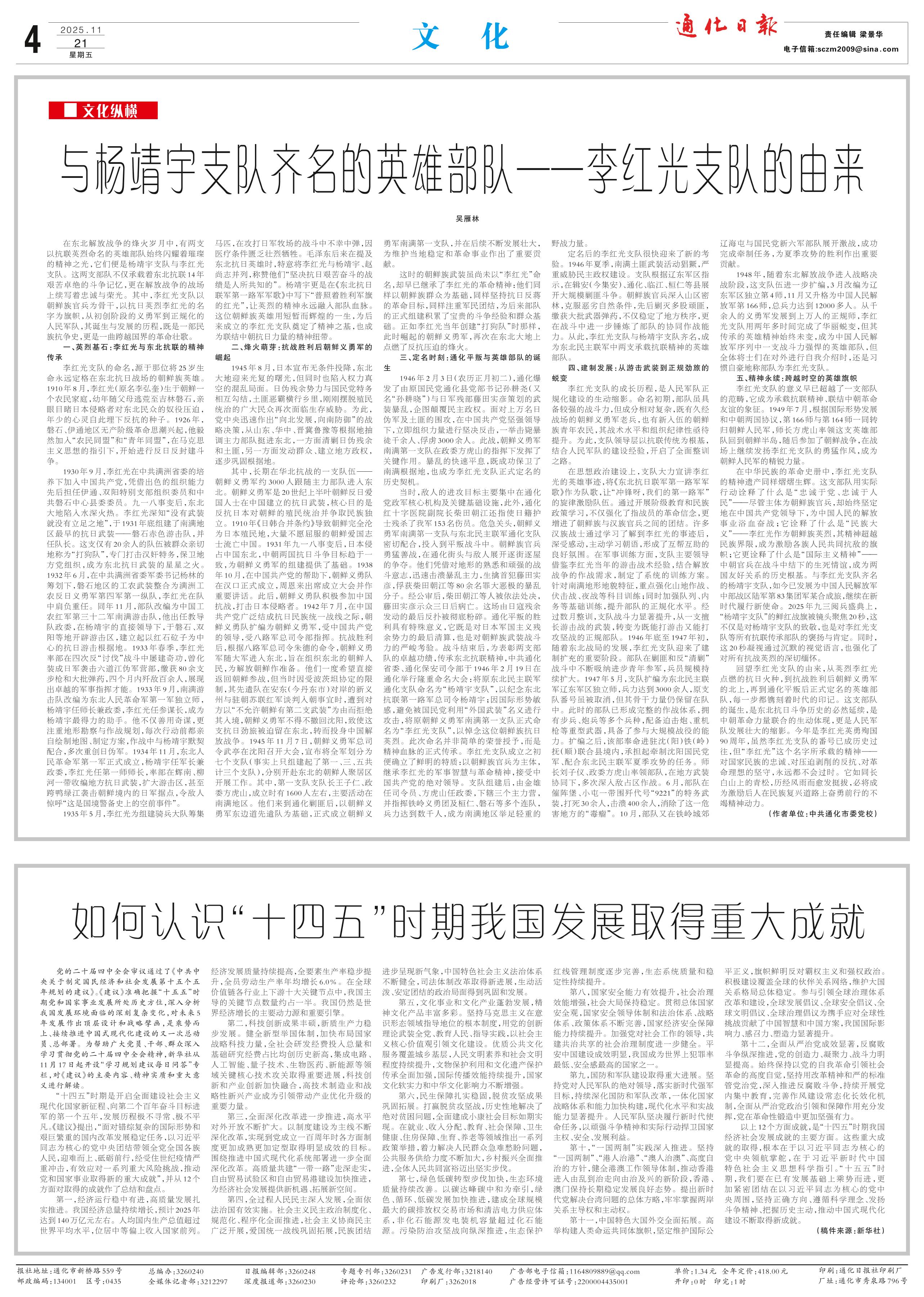 <div style='font-size: 22px!important;line-height: 34px!important;text-align: justify!important;color: #000!important'>与杨靖宇支队齐名的英雄部队——李红光支队的由来</div><div style='font-size: 14px!important;line-height: 22px!important;text-align: left!important;color: #777!important;margin-top: 20px;'>通化日报  2025-11-21</div><div><img id='paperImg' style='max-width: 100%;height: auto' src='//img.founderfx.cn/epaper/202511/21/c81bf11fd2724b8b8c9f7dc66ecc4a04/4.jpg' alt='' class='page-img'/></div><p>吴雁林</p><p>在东北解放战争的烽火岁月中,有两支以抗联英烈命名的英雄部队始终闪耀着璀璨的精神之光,它们便是杨靖宇支队与李红光支队。这两支部队不仅承载着东北抗联14年艰苦卓绝的斗争记忆,更在解放战争的战场上续写着忠诚与荣光。其中,李红光支队以朝鲜族官兵为骨干,以抗日英烈李红光的名字为旗帜,从初创阶段的义勇军到正规化的人民军队,其诞生与发展的历程,既是一部民族抗争史,更是一曲跨越国界的革命壮歌。</p><p>一、英烈基石:李红光与东北抗联的精神传承</p><p>李红光支队的命名,源于那位将25岁生命永远定格在东北抗日战场的朝鲜族英雄。1910年8月,李红光(原名李弘奎)生于朝鲜一个农民家庭,幼年随父母逃荒至吉林磐石,亲眼目睹日本侵略者对东北民众的奴役压迫,年少的心灵自此埋下反抗的种子。1926年,磐石、伊通地区无产阶级革命思潮兴起,他毅然加入“农民同盟”和“青年同盟”,在马克思主义思想的指引下,开始进行反日反封建斗争。</p><p>1930年9月,李红光在中共满洲省委的培养下加入中国共产党,凭借出色的组织能力先后担任伊通、双阳特别支部组织委员和中共磐石中心县委委员。九一八事变后,东北大地陷入水深火热。李红光深知“没有武装就没有立足之地”,于1931年底组建了南满地区最早的抗日武装——磐石赤色游击队,并任队长。这支仅有20余人的队伍被群众亲切地称为“打狗队”,专门打击汉奸特务,保卫地方党组织,成为东北抗日武装的星星之火。1932年6月,在中共满洲省委军委书记杨林的筹划下,磐石地区的工农武装整合为满洲工农反日义勇军第四军第一纵队,李红光在队中肩负重任。同年11月,部队改编为中国工农红军第三十二军南满游击队,他出任教导队政委,在杨靖宇的直接领导下,于磐石、双阳等地开辟游击区,建立起以红石砬子为中心的抗日游击根据地。1933年春季,李红光率部在四次反“讨伐”战斗中屡建奇功,曾化装成日军袭击六道江伪军营部,缴获80余支步枪和大批弹药,四个月内歼敌百余人,展现出卓越的军事指挥才能。1933年9月,南满游击队改编为东北人民革命军第一军独立师,杨靖宇任师长兼政委,李红光任参谋长,成为杨靖宇最得力的助手。他不仅善用奇谋,更注重地形勘察与作战规划,每次行动前都亲自绘制地图、制定方案,作战中与杨靖宇默契配合,多次重创日伪军。1934年11月,东北人民革命军第一军正式成立,杨靖宇任军长兼政委,李红光任第一师师长,率部在辉南、柳河一带收编地方抗日武装,扩大游击区,甚至跨鸭绿江袭击朝鲜境内的日军据点,令敌人惊呼“这是国境警备史上的空前事件”。</p><p>1935年5月,李红光为组建骑兵大队筹集马匹,在攻打日军牧场的战斗中不幸中弹,因医疗条件匮乏壮烈牺牲。毛泽东后来在提及东北抗日英雄时,特意将李红光与杨靖宇、赵尚志并列,称赞他们“坚决抗日艰苦奋斗的战绩是人所共知的”。杨靖宇更是在《东北抗日联军第一路军军歌》中写下“普照着胜利军旗的红光”,让英烈的精神永远融入部队血脉。这位朝鲜族英雄用短暂而辉煌的一生,为后来成立的李红光支队奠定了精神之基,也成为联结中朝抗日力量的精神纽带。</p><p>二、烽火萌芽:抗战胜利后朝鲜义勇军的崛起</p><p>1945年8月,日本宣布无条件投降,东北大地迎来光复的曙光,但同时也陷入权力真空的混乱局面。日伪残余势力与国民党特务相互勾结,土匪恶霸横行乡里,刚刚摆脱殖民统治的广大民众再次面临生存威胁。为此,党中央迅速作出“向北发展,向南防御”的战略决策,从山东、华中、晋冀鲁豫等根据地抽调主力部队挺进东北,一方面清剿日伪残余和土匪,另一方面发动群众、建立地方政权,逐步巩固根据地。</p><p>其中,长期在华北抗战的一支队伍——朝鲜义勇军约3000人跟随主力部队进入东北。朝鲜义勇军是20世纪上半叶朝鲜反日爱国人士在中国建立的抗日武装,核心目的是反抗日本对朝鲜的殖民统治并争取民族独立。1910年《日韩合并条约》导致朝鲜完全沦为日本殖民地,大量不愿屈服的朝鲜爱国志士流亡中国。1931年九一八事变后,日本侵占中国东北,中朝两国抗日斗争目标趋于一致,为朝鲜义勇军的组建提供了基础。1938年10月,在中国共产党的帮助下,朝鲜义勇队在汉口正式成立,周恩来出席成立大会并作重要讲话。此后,朝鲜义勇队积极参加中国抗战,打击日本侵略者。1942年7月,在中国共产党广泛结成抗日民族统一战线之际,朝鲜义勇队扩编为朝鲜义勇军,受中国共产党的领导,受八路军总司令部指挥。抗战胜利后,根据八路军总司令朱德的命令,朝鲜义勇军随大军进入东北,旨在组织东北的朝鲜人民,为解放朝鲜作准备。他们一度希望直接返回朝鲜参战,但当时因受波茨坦协定的限制,其先遣队在安东(今丹东市)对岸的新义州与驻朝苏联红军谈判入朝事宜时,遭到对方以“不允许朝鲜有第