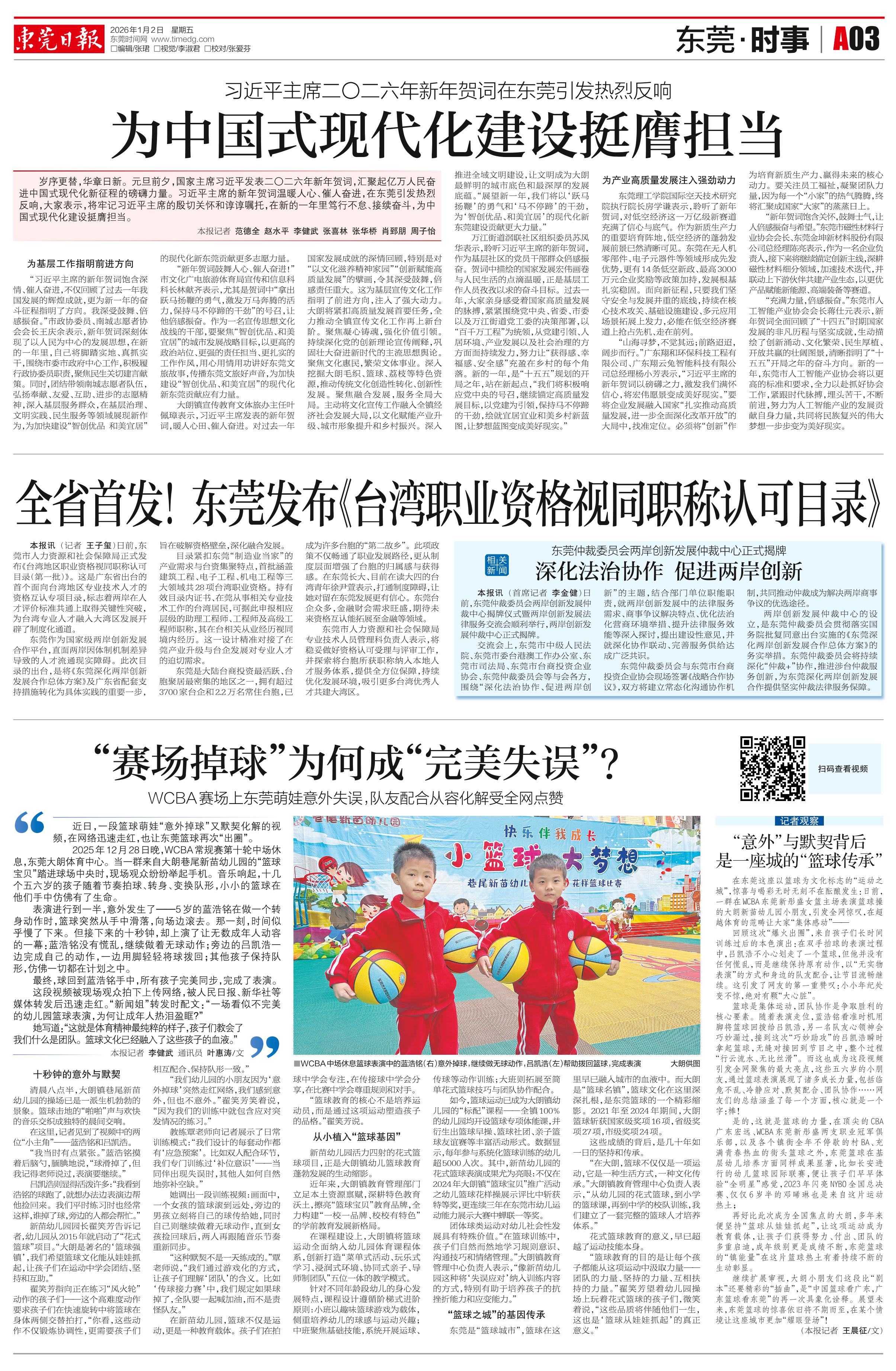 <div style='font-size: 22px!important;line-height: 34px!important;text-align: justify!important;color: #000!important'>“赛场掉球”为何成“完美失误”?</div><div style='font-size: 16px!important;line-height: 28px!important;text-align: justify;color: #777!important;margin-top: 20px;'>WCBA赛场上东莞萌娃意外失误,队友配合从容化解受全网点赞</div><div style='font-size: 14px!important;line-height: 22px!important;text-align: left!important;color: #777!important;margin-top: 20px;'>东莞日报  本报记者 李健武 通讯员 叶惠涛/文  2026-01-02</div><div><img id='paperImg' style='max-width: 100%;height: auto' src='//img.founderfx.cn/epaper/202601/02/4394b83bf69944c9ab8af338ea0956a7/3.jpg' alt='' class='page-img'/></div><div style='font-size: 14px!important;line-height: 22px!important;text-align: center!important;color: #777!important;'><img src='//img.founderfx.cn/epaper/202601/02/4394b83bf69944c9ab8af338ea0956a7/A03/21191004_sm1_1767273115803_s.jpg'style='display: block!important;margin: auto!important;max-width: 100%!important;'/> ■WCBA中场休息篮球表演中的蓝浩铭(右)意外掉球,继续做无球动作,吕凯浩(左)帮助拨回篮球,完成表演 大朗供图</div><p> </p><p> </p><p> 近日,一段篮球萌娃“意外掉球”又默契化解的视频,在网络迅速走红,也让东莞篮球再次“出圈”。</p><p> 2025年12月28日晚,WCBA常规赛第十轮中场休息,东莞大朗体育中心。当一群来自大朗巷尾新苗幼儿园的“篮球宝贝”踏进球场中央时,现场观众纷纷举起手机。音乐响起,十几个五六岁的孩子随着节奏拍球、转身、变换队形,小小的篮球在他们手中仿佛有了生命。</p><p> 表演进行到一半,意外发生了——5岁的蓝浩铭在做一个转身动作时,篮球突然从手中滑落,向场边滚去。那一刻,时间似乎慢了下来。但接下来的十秒钟,却上演了让无数成年人动容的一幕:蓝浩铭没有慌乱,继续做着无球动作;旁边的吕凯浩一边完成自己的动作,一边用脚轻轻将球拨回;其他孩子保持队形,仿佛一切都在计划之中。</p><p> 最终,球回到蓝浩铭手中,所有孩子完美同步,完成了表演。</p><p> 这段视频被现场观众拍下上传网络,被人民日报、新华社等媒体转发后迅速走红。“新闻姐”转发时配文:“一场看似不完美的幼儿园篮球表演,为何让成年人热泪盈眶?”</p><p> 她写道:“这就是体育精神最纯粹的样子,孩子们教会了我们什么是团队。篮球文化已经融入了这些孩子的血液。”</p><p> </p><p> </p><p> </p><p> 十秒钟的意外与默契</p><p> 清晨八点半,大朗镇巷尾新苗幼儿园的操场已是一派生机勃勃的景象。篮球击地的“啪啪”声与欢快的音乐交织成独特的晨间交响。</p><p> 在这里,记者见到了视频中的两位“小主角”——蓝浩铭和吕凯浩。</p><p> “我当时有点紧张。”蓝浩铭摸着后脑勺,腼腆地说,“球滑掉了,但我记得老师说过,表演要继续。”</p><p> 吕凯浩则显得活泼许多:“我看到浩铭的球跑了,就想办法边表演边帮他捡回来。我们平时练习时也经常这样,谁掉了球,旁边的人都会帮忙。”</p><p> 新苗幼儿园园长翟笑芳告诉记者,幼儿园从2015年就启动了“花式篮球”项目。“大朗是著名的‘篮球强镇’,我们希望篮球文化能从娃娃抓起,让孩子们在运动中学会团结、坚持和互助。”</p><p> 翟笑芳指向正在练习“风火轮”动作的孩子们——这个高难度动作要求孩子们在快速旋转中将篮球在身体两侧交替拍打,“你看,这些动作不仅锻炼协调性,更需要孩子们相互配合、保持队形一致。”</p><p> “我们幼儿园的小朋友因为‘意外掉球’突然走红网络,我们感到意外,但也不意外。”翟笑芳笑着说,“因为我们的训练中就包含应对突发情况的练习。”</p><p> 教练覃老师向记者展示了日常训练模式:“我们设计的每套动作都有‘应急预案’。比如双人配合环节,我们专门训练过‘补位意识’——当同伴出现失误时,其他人如何自然地弥补空缺。”</p><p> 她调出一段训练视频:画面中,一个女孩的篮球滚到远处,旁边的男孩立刻将自己的球传给她,同时自己则继续做着无球动作,直到女孩捡回球后,两人再跟随音乐节奏重新同步。</p><p> “这种默契不是一天练成的。”覃老师说,“我们通过游戏化的方式,让孩子们理解‘团队’的含义。比如‘传球接力赛’中,我们规定如果球掉了,全队要一起喊加油,而不是责怪队友。”</p><p> 在新苗幼儿园,篮球不仅是运动,更是一种教育载体。孩子们在拍球中学会专注,在传接球中学会分享,在比赛中学会尊重规则和对手。</p><p> “篮球教育的核心不是培养运动员,而是通过这项运动塑造孩子的品格。”翟笑芳说。</p><p> 从小植入“篮球基因”</p><p> 新苗幼儿园活力四射的花式篮球项目,正是大朗镇幼儿篮球教育蓬勃发展的生动缩影。</p><p> 近年来,大朗镇教育管理部门立足本土资源禀赋,深耕特色教育沃土,擦亮“篮球宝贝”教育品牌,全力构建“一校一品牌、校校有特色”的学前教育发展新格局。</p><p> 在课程建设上,大朗镇将篮球运动全面纳入幼儿园体育课程体系,创新打造“菜单式活动、玩乐式学习、浸润式环境、协同式亲子、导师制团队”五位一体的教学模式。</p><p> 针对不同年龄段幼儿的身心发展特点,课程设计遵循阶梯式进阶原则:小班以趣味篮球游戏为载体,侧重培养幼儿的球感与运动兴趣;中班聚焦基础技能,系统开展运球、传球等动作训练;大班则拓展至简单花式篮球技巧与团队协作配合。</p><p> 如今,篮球运动